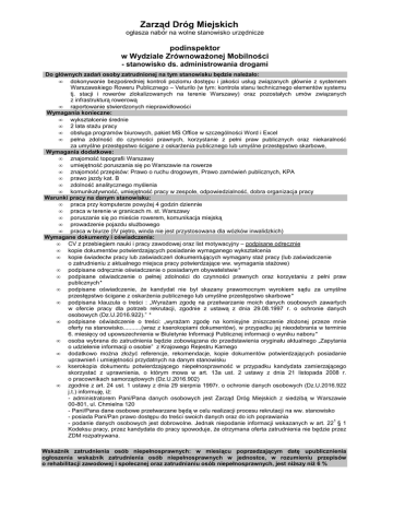 Zarząd Dróg Miejskich ogłasza nabór na wolne stanowisko urzędnicze podinspektor w Wydziale Zrównoważonej Mobilności - stanowisko ds. administrowania drogami Do głównych zadań osoby zatrudnionej na tym stanowisku będzie należało: • dokonywanie bezpośredniej kontroli poziomu dostępu i jakości usług związanych głównie z systemem Warszawskiego Roweru Publicznego – Veturilo (w tym: kontrola stanu technicznego elementów systemu tj. stacji i rowerów zlokalizowanych na terenie Warszawy) oraz pozostałych umów związanych z infrastrukturą rowerową • raportowanie stwierdzonych nieprawidłowości Wymagania konieczne: • wykształcenie średnie • 2 lata stażu pracy • obsługa programów biurowych, pakiet MS Office w szczególności Word i Excel • pełna zdolność do czynności prawnych, korzystanie z pełni praw publicznych oraz niekaralność za umyślne przestępstwo ścigane z oskarżenia publicznego lub umyślne przestępstwo skarbowe, Wymagania dodatkowe: • znajomość topografii Warszawy • umiejętność poruszania się po Warszawie na rowerze • znajomość przepisów: Prawo o ruchu drogowym, Prawo zamówień publicznych, KPA • prawo jazdy kat. B • zdolność analitycznego myślenia • komunikatywność, umiejętność pracy w zespole, odpowiedzialność, dobra organizacja pracy Warunki pracy na danym stanowisku: • praca przy komputerze powyżej 4 godzin dziennie • praca w terenie w granicach m. st. Warszawy • poruszanie się po mieście rowerem, komunikacja miejską • prowadzenie pojazdu służbowego • praca w biurze (IV piętro, winda nie jest przystosowana dla wózków inwalidzkich) Wymagane dokumenty i oświadczenia: • CV z przebiegiem nauki i pracy zawodowej oraz list motywacyjny – podpisane odręcznie • kopie dokumentów potwierdzających posiadanie wymaganego wykształcenia • kopie świadectw pracy lub zaświadczeń dokumentujących wymagany staż pracy (lub zaświadczenie o zatrudnieniu z aktualnego miejsca pracy potwierdzające ww. wymagania stażowe) • podpisane odręcznie oświadczenie o posiadanym obywatelstwie* • podpisane oświadczenie o pełnej zdolności do czynności prawnych oraz korzystaniu z pełni praw publicznych* • podpisane oświadczenie, że kandydat nie był skazany prawomocnym wyrokiem sądu za umyślne przestępstwo ścigane z oskarżenia publicznego lub umyślne przestępstwo skarbowe* • podpisana klauzula o treści : „Wyrażam zgodę na przetwarzanie moich danych osobowych zawartych w ofercie pracy dla potrzeb rekrutacji, zgodnie z ustawą z dnia 29.08.1997 r. o ochronie danych osobowych (Dz.U.2016.922).” * • podpisane oświadczenie o treści: „wyrażam zgodę na komisyjne zniszczenie złożonej przeze mnie oferty na stanowisko...........(wraz z kserokopiami dokumentów), w przypadku jej nieodebrania w terminie 6. miesięcy od upowszechnienia w Biuletynie Informacji Publicznej informacji o wyniku naboru* • osoba wybrana do zatrudnienia będzie zobowiązana do przedstawienia oryginału aktualnego „Zapytania o udzielenie informacji o osobie” z Krajowego Rejestru Karnego • dodatkowo można złożyć referencje, rekomendacje, kopie dokumentów potwierdzających posiadanie uprawnień i umiejętności przydatnych na danym stanowisku • kserokopia dokumentu potwierdzającego niepełnosprawność w przypadku kandydata zamierzającego skorzystać z uprawnienia, o którym mowa w art. 13a ust. 2 ustawy z dnia 21 listopada 2008 r. o pracownikach samorządowych (Dz.U.2016.902) • zgodnie z art. 24 ust. 1 ustawy z dnia 29 sierpnia 1997r. o ochronie danych osobowych (Dz.U.2016.922 j.t.) informuję, iż: - administratorem Pani/Pana danych osobowych jest Zarząd Dróg Miejskich z siedzibą w Warszawie 00-801, ul. Chmielna 120 - Pani/Pana dane osobowe przetwarzane będą w celu realizacji procesu rekrutacji na ww. stanowisko - posiada Pani/Pan prawo dostępu do treści swoich danych oraz do ich poprawiania 1 - podanie danych osobowych jest dobrowolne. Jednak niepodanie informacji wskazanych w art. 22 § 1 Kodeksu pracy, przez kandydata do pracy spowoduje, że otrzymana oferta zatrudnienia nie będzie przez ZDM rozpatrywana. Wskaźnik zatrudnienia osób niepełnosprawnych: w miesiącu poprzedzającym datę upublicznienia ogłoszenia wskaźnik zatrudnienia osób niepełnosprawnych w jednostce, w rozumieniu przepisów o rehabilitacji zawodowej i społecznej oraz zatrudnianiu osób niepełnosprawnych, jest niższy niż 6 % Osoby zainteresowane prosimy o składanie kompletu dokumentów w zamkniętej kopercie osobiście w kancelarii ZDM lub przesłanie pocztą na poniższy adres do dnia 20.02.2017 r. Zarząd Dróg Miejskich Wydział Spraw Pracowniczych ul. Chmielna 120, 00-801 Warszawa tel. 22 5589228, 22 5589160 z dopiskiem na kopercie: „12/2017 – podinspektor w Wydziale Zrównoważonej Mobilności * Druki oświadczeń do pobrania na stronie www.zdm.waw.pl Dokumenty uważa się za dostarczone w terminie, jeżeli wpłynęły na ww. adres do dnia 20.02.2017 r.