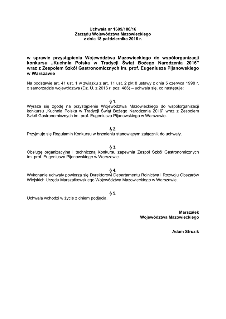 Uchwała nr 1609/188/16 Zarządu Województwa Mazowieckiego z dnia 18 października 2016 r. w sprawie przystąpienia Województwa Mazowieckiego do współorganizacji konkursu „Kuchnia Polska w Tradycji Świąt Bożego Narodzenia 2016” wraz z Zespołem Szkół Gastronomicznych im. prof. Eugeniusza Pijanowskiego w Warszawie Na podstawie art. 41 ust. 1 w związku z art. 11 ust. 2 pkt 8 ustawy z dnia 5 czerwca 1998 r. o samorządzie województwa (Dz. U. z 2016 r. poz. 486) – uchwala się, co następuje: § 1. Wyraża się zgodę na przystąpienie Województwa Mazowieckiego do współorganizacji konkursu „Kuchnia Polska w Tradycji Świąt Bożego Narodzenia 2016” wraz z Zespołem Szkół Gastronomicznych im. prof. Eugeniusza Pijanowskiego w Warszawie. § 2. Przyjmuje się Regulamin Konkursu w brzmieniu stanowiącym załącznik do uchwały. § 3. Obsługę organizacyjną i techniczną Konkursu zapewnia Zespół Szkół Gastronomicznych im. prof. Eugeniusza Pijanowskiego w Warszawie. § 4. Wykonanie uchwały powierza się Dyrektorowi Departamentu Rolnictwa i Rozwoju Obszarów Wiejskich Urzędu Marszałkowskiego Województwa Mazowieckiego w Warszawie. § 5. Uchwała wchodzi w życie z dniem podjęcia. Marszałek Województwa Mazowieckiego Adam Struzik