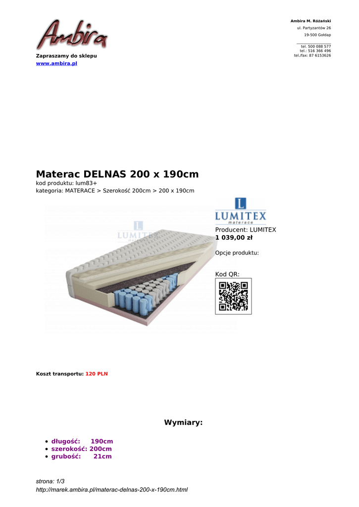 Ambira M. Różański ul. Partyzantów 26 19-500 Gołdap ___________________ tel. 500 088 577 tel.: 516 366 496 tel./fax: 87 6153626 Zapraszamy do sklepu www.ambira.pl Materac DELNAS 200 x 190cm kod produktu: lum83+ kategoria: MATERACE > Szerokość 200cm > 200 x 190cm Producent: LUMITEX 1 039,00 zł Opcje produktu: Kod QR: Koszt transportu: 120 PLN Wymiary: długość: 190cm szerokość: 200cm grubość: 21cm strona: 1/3 http://marek.ambira.pl/materac-delnas-200-x-190cm.html Dwustronny, średnio twardy materac lateksowo - termoelastyczno - kieszeniowy o 7 strefach twardości. Wkład materaca stanowią 7 strefowe sprężyny kieszniowe obłożone włókniną filcową 400 gr., a następnie jednostronnie płytą lateksową o grubości 2 cm, oraz jednostronnie pianką termoelastyczną. Lateks charakteryzuje się wysoką trwałością i elastycznością punktową. Dzięki systemowi otworów wnetrze materaca poddawane jest procesowi ciągłej wentylacji, co wpływa korzystnie na zmniejszenie potliwości i rozwoju bakterii. Płyta typu Visco - elastic reaguje na ciepło wydzielane przez ciało, zwiększając swoją elastyczność wraz ze wzrostem temperatury, dopasowując się do kształtu ciała. Pokrowiec hypoalegiczny pikowany dwustronnie ociepliną o wysokiej gramaturze, z zamkiem błyskawicznym dookoła, ułatwiającym ściąganie pokrowca do prania. Wysokość materaca ok. 21 cm Lateks - Pianka lateksowa jest to mieszanina lateksu syntetycznego z naturalnym mleczkiem drzewa kauczukowego. Lateks charakteryzuje się wysoką trwałością i elastycznością punktową, doskonale dopasowuje się do kształtów ciała oraz gwarantuje wysoki komfort snu. Dzięki systemowi otworów wnętrze materaca poddawane jest procesowi ciągłej wentylacji. W materacach lateksowych naszej kolekcji zawartość lateksu jest bardzo wysoka i waha się w granicach od 50-65%. Wysokie proporcje lateksu naturalnego znacznie zwiększają elastyczność oraz wytrzymałość materaca. strona: 3/3 http://marek.ambira.pl/materac-delnas-200-x-190cm.html