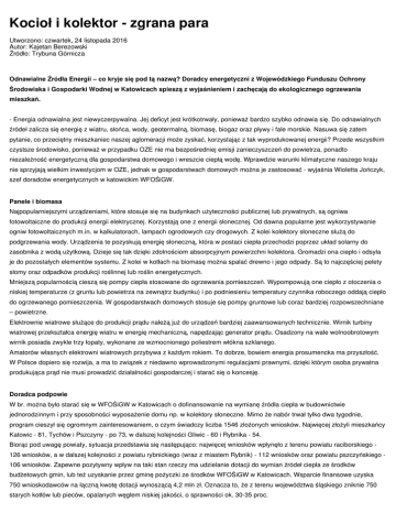 Kocioł i kolektor - zgrana para Utworzono: czwartek, 24 listopada 2016 Autor: Kajetan Berezowski Źródło: Trybuna Górnicza Odnawialne Źródła Energii – co kryje się pod tą nazwą? Doradcy energetyczni z Wojewódzkiego Funduszu Ochrony Środowiska i Gospodarki Wodnej w Katowicach spieszą z wyjaśnieniem i zachęcają do ekologicznego ogrzewania mieszkań. - Energia odnawialna jest niewyczerpywalna. Jej deficyt jest krótkotrwały, ponieważ bardzo szybko odnawia się. Do odnawialnych źródeł zalicza się energię z wiatru, słońca, wody, geotermalną, biomasę, biogaz oraz pływy i fale morskie. Nasuwa się zatem pytanie, co przeciętny mieszkaniec naszej aglomeracji może zyskać, korzystając z tak wyprodukowanej energii? Przede wszystkim czystsze środowisko, ponieważ w przypadku OZE nie ma bezpośredniej emisji zanieczyszczeń do powietrza, ponadto niezależność energetyczną dla gospodarstwa domowego i wreszcie ciepłą wodę. Wprawdzie warunki klimatyczne naszego kraju nie sprzyjają wielkim inwestycjom w OZE, jednak w gospodarstwach domowych można je zastosować - wyjaśnia Wioletta Jończyk, szef doradców energetycznych w katowickim WFOŚiGW. Panele i biomasa Najpopularniejszymi urządzeniami, które stosuje się na budynkach użyteczności publicznej lub prywatnych, są ogniwa fotowoltaiczne do produkcji energii elektrycznej. Korzystają one z energii słonecznej. Od dawna popularne jest wykorzystywanie ogniw fotowoltaicznych m.in. w kalkulatorach, lampach ogrodowych czy drogowych. Z kolei kolektory słoneczne służą do podgrzewania wody. Urządzenia te pozyskują energię słoneczną, która w postaci ciepła przechodzi poprzez układ solarny do zasobnika z wodą użytkową. Dzieje się tak dzięki zdolnościom absorpcyjnym powierzchni kolektora. Gromadzi ona ciepło i odsyła je do pozostałych elementów systemu. Z kolei w kotłach na biomasę można spalać drewno i jego odpady. Są to najczęściej pelety słomy oraz odpadków produkcji roślinnej lub roślin energetycznych. Mniejszą popularnością cieszą się pompy ciepła stosowane do ogrzewania pomieszczeń. Wypompowują one ciepło z otoczenia o niskiej temperaturze (z gruntu lub powietrza na zewnątrz budynku) i po podniesieniu temperatury czynnika roboczego oddają ciepło do ogrzewanego pomieszczenia. W gospodarstwach domowych stosuje się pompy gruntowe lub coraz bardziej rozpowszechniane – powietrzne. Elektrownie wiatrowe służące do produkcji prądu należą już do urządzeń bardziej zaawansowanych technicznie. Wirnik turbiny wiatrowej przekształca energię wiatru w energię mechaniczną, napędzając generator prądu. Osadzony na wale wolnoobrotowym wirnik posiada zwykle trzy łopaty, wykonane ze wzmocnionego poliestrem włókna szklanego. Amatorów własnych elektrowni wiatrowych przybywa z każdym rokiem. To dobrze, bowiem energia prosumencka ma przyszłość. W Polsce dopiero się rozwija, a ma to związek z niedawno wprowadzonymi regulacjami prawnymi, dzięki którym osoba prywatna produkująca prąd nie musi prowadzić działalności gospodarczej i starać się o koncesję. Doradca podpowie W br. można było starać się w WFOŚiGW w Katowicach o dofinansowanie na wymianę źródła ciepła w budownictwie jednorodzinnym i przy sposobności wyposażenie domu np. w kolektory słoneczne. Mimo że nabór trwał tylko dwa tygodnie, program cieszył się ogromnym zainteresowaniem, o czym świadczy liczba 1546 złożonych wniosków. Najwięcej złożyli mieszkańcy Katowic - 81, Tychów i Pszczyny - po 73, w dalszej kolejności Gliwic - 60 i Rybnika - 54. Biorąc pod uwagę powiaty, sytuacja przedstawia się następująco: najwięcej wniosków wpłynęło z terenu powiatu raciborskiego 126 wniosków, a w dalszej kolejności z powiatu rybnickiego (wraz z miastem Rybnik) - 112 wniosków oraz powiatu pszczyńskiego 106 wniosków. Zapewne pozytywny wpływ na taki stan rzeczy ma udzielanie dotacji do wymian źródeł ciepła ze środków budżetowych gmin, lub też uzyskanie przez gminę pożyczki ze środków WFOŚiGW w Katowicach. Wsparcie finansowe uzyska 750 wnioskodawców na łączną kwotę dotacji wynoszącą 4,2 mln zł. Oznacza to, że z terenu województwa śląskiego zniknie 750 starych kotłów lub pieców, opalanych węglem niskiej jakości, o sprawności ok. 30-35 proc. Jak poinformował nas WFOŚiGW, w przyszłym roku planowany jest kolejny nabór wniosków. Ponadto można zgłaszać się do urzędów miejskich odpowiednich dla miejsca zamieszkania i zapytać o możliwość dofinansowania wymiany kotła i przy okazji zabudowę kolektorów słonecznych lub ogniw fotowoltaicznych w ramach obszarowych programów ograniczenia niskiej emisji - Stosując odnawialne źródła energii przyczyniamy się do ochrony środowiska, ponieważ unikamy emisji zanieczyszczeń, a przy okazji oszczędzamy kupując mniej energii czy ciepłej wody użytkowej. Koszty inwestycyjne, które musimy ponieść, niestety nie są małe, ale w dłuższej perspektywie zwracają się - zapewnia Wioletta Jończyk. Pamiętajmy również o tym, że w każdej chwili możemy skorzystać z bezpłatnych usług doradców energetycznych z WFOŚiGW w ramach projektu „Ogólnopolski system wsparcia doradczego dla sektora publicznego, mieszkaniowego oraz przedsiębiorstw w zakresie efektywności energetycznej oraz OZE”. Eksperci doradzą, skąd pozyskać dofinansowanie oraz jakie rozwiązanie w zakresie inwestycji w OZE będzie najkorzystniejsze.