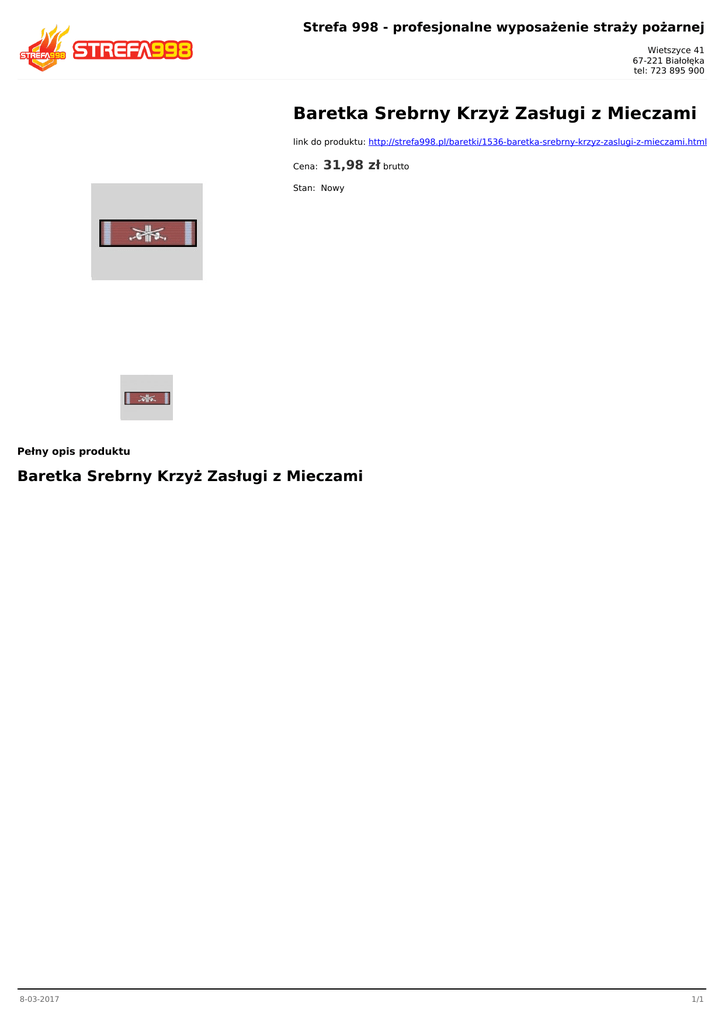 Strefa 998 - profesjonalne wyposażenie straży pożarnej Wietszyce 41 67-221 Białołęka tel: 723 895 900 Baretka Srebrny Krzyż Zasługi z Mieczami link do produktu: http://strefa998.pl/baretki/1536-baretka-srebrny-krzyz-zaslugi-z-mieczami.html Cena: 31,98 zł brutto Stan: Nowy Pełny opis produktu Baretka Srebrny Krzyż Zasługi z Mieczami 8-03-2017 1/1