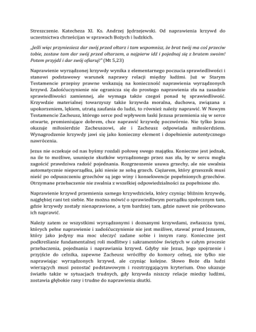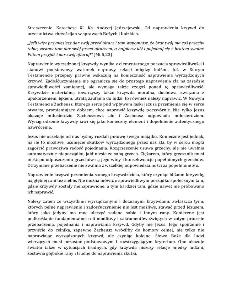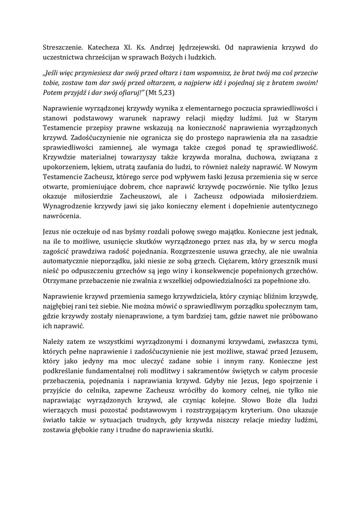 Streszczenie. Katecheza XI. Ks. Andrzej Jędrzejewski. Od naprawienia krzywd do uczestnictwa chrześcijan w sprawach Bożych i ludzkich. „Jeśli więc przyniesiesz dar swój przed ołtarz i tam wspomnisz, że brat twój ma coś przeciw tobie, zostaw tam dar swój przed ołtarzem, a najpierw idź i pojednaj się z bratem swoim! Potem przyjdź i dar swój ofiaruj!” (Mt 5,23) Naprawienie wyrządzonej krzywdy wynika z elementarnego poczucia sprawiedliwości i stanowi podstawowy warunek naprawy relacji między ludźmi. Już w Starym Testamencie przepisy prawne wskazują na konieczność naprawienia wyrządzonych krzywd. Zadośćuczynienie nie ogranicza się do prostego naprawienia zła na zasadzie sprawiedliwości zamiennej, ale wymaga także czegoś ponad tę sprawiedliwość. Krzywdzie materialnej towarzyszy także krzywda moralna, duchowa, związana z upokorzeniem, lękiem, utratą zaufania do ludzi, to również należy naprawić. W Nowym Testamencie Zacheusz, którego serce pod wpływem łaski Jezusa przemienia się w serce otwarte, promieniujące dobrem, chce naprawić krzywdę poczwórnie. Nie tylko Jezus okazuje miłosierdzie Zacheuszowi, ale i Zacheusz odpowiada miłosierdziem. Wynagrodzenie krzywdy jawi się jako konieczny element i dopełnienie autentycznego nawrócenia. Jezus nie oczekuje od nas byśmy rozdali połowę swego majątku. Konieczne jest jednak, na ile to możliwe, usunięcie skutków wyrządzonego przez nas zła, by w sercu mogła zagościć prawdziwa radość pojednania. Rozgrzeszenie usuwa grzechy, ale nie uwalnia automatycznie nieporządku, jaki niesie ze sobą grzech. Ciężarem, który grzesznik musi nieść po odpuszczeniu grzechów są jego winy i konsekwencje popełnionych grzechów. Otrzymane przebaczenie nie zwalnia z wszelkiej odpowiedzialności za popełnione zło. Naprawienie krzywd przemienia samego krzywdziciela, który czyniąc bliźnim krzywdę, najgłębiej rani też siebie. Nie można mówić o sprawiedliwym porządku społecznym tam, gdzie krzywdy zostały nienaprawione, a tym bardziej tam, gdzie nawet nie próbowano ich naprawić. Należy zatem ze wszystkimi wyrządzonymi i doznanymi krzywdami, zwłaszcza tymi, których pełne naprawienie i zadośćuczynienie nie jest możliwe, stawać przed Jezusem, który jako jedyny ma moc uleczyć zadane sobie i innym rany. Konieczne jest podkreślanie fundamentalnej roli modlitwy i sakramentów świętych w całym procesie przebaczenia, pojednania i naprawiania krzywd. Gdyby nie Jezus, Jego spojrzenie i przyjście do celnika, zapewne Zacheusz wróciłby do komory celnej, nie tylko nie naprawiając wyrządzonych krzywd, ale czyniąc kolejne. Słowo Boże dla ludzi wierzących musi pozostać podstawowym i rozstrzygającym kryterium. Ono ukazuje światło także w sytuacjach trudnych, gdy krzywda niszczy relacje miedzy ludźmi, zostawia głębokie rany i trudne do naprawienia skutki.
