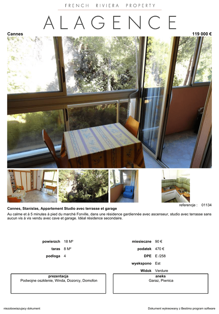 Cannes 119 000 € referencje : 01134 Cannes, Stanislas, Appartement Studio avec terrasse et garage Au calme et à 5 minutes à pied du marché Forville, dans une résidence gardiennée avec ascenseur, studio avec terrasse sans aucun vis à vis vendu avec cave et garage. Idéal résidence secondaire. powierzch taras podloga 18 M² 8 M² 4 miesieczne podatek DPE wyekspono 90 € 470 € E /258 Est Widok prezentacja Podwojne oszklenie, Winda, Dozorcy, Domofon niezobowiazujacy dokument Verdure aneks Garaz, Piwnica Dokument wykreowany z Bestimo program software