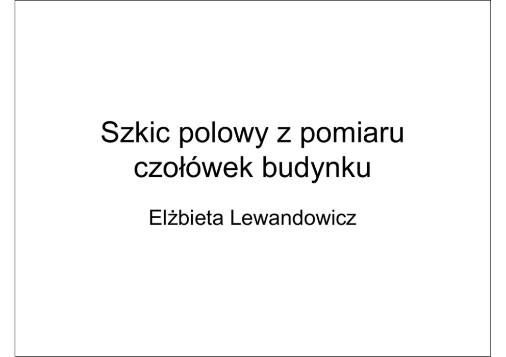 Szkic polowy z pomiaru czołówek budynku ElŜbieta Lewandowicz POMIARY KONTROLNE Szczegóły terenowe I grupy dokładnościowej powinny być mierzone wraz z elementami kontrolnymi, do których zalicza się: – – – – drugie niezaleŜne wyznaczenie połoŜenia szczegółów, miary czołowe (tzw. czołówki), miary przeciwprostokątne (tzw. podpórki), ….. (Instrukcja Techniczne G-4 ) Pomiary kontrolne budynków Sprawdzenie prawidłowego wyznaczenia naroŜy budynków, polega na porównaniu długości ściany budynku z dwóch niezaleŜnych wyznaczeń: 1. na podstawie wyznaczonych współrzędnych naroŜy budynków z pomiaru wykonanego w oparciu o osnowę geodezyjną, 2. z niezaleŜnego pomiaru taśmą po ścianie budynku (pomiar czołówek) Czołówki Miary wzdłuŜ naturalnych określonych linii terenowych: • odcinków linii granicznych, • ścian budynków. Stanowią element kontrolny przy pomiarach szczegółów pierwszej grupy dokładnościowej. Pozwalają na wyznaczenie szczegółów terenowych drugiej grupy dokładnościowej Szczegóły II grupy dokładnościowej Szczegóły II grupy dokładnościowej moŜna wyznaczyć pomiarem uzupełniającym w oparciu w oparciu o szczegóły terenowe I grupy dokładnościowej pomiaru. Budynek – szczegół I grupy dokładnościowej Schody, murki oporowe, świetliki, rampy – szczegóły II grupy dokładnościowej Obiekty przylegające do budynków (schody, murki,..) moŜna zamierzać w oparciu o naroŜniki budynków. Wykonuje się to najczęściej przy pomiarze czołówek. Szkic z pomiaru Murki oporowe mierzymy po osi jeśli są węŜsze niŜ 0.30m, jeśli są szersze zamierzamy je na 4 punkty Szkic z pomiaru Mierzymy załamania budynków jeśli są równe lub większe niŜ 0.30m Instrukcje techniczne K-1.2 G-4 Elementy szkicu Pytania? • • • • • • • • Wymień szczegóły terenowe I, II i II grupy dokładnościowej? Na czym polega pomiar kontrolny budynku? Co znaczy określenie: „miary czołowe budynku” Wymień podstawowe elementy szkicu polowego z pomiaru? Czy na szkicach polowych moŜna stosować opis budynków np. poczta, kino, zakład fryzjerski...? Kiedy na szkicach polowych wykazuje się pilastry, wcięcia, załamania siany budynku? Czy się wykazuje na szkicach polowych wejścia do budynków? Jak przedstawiamy na szkicu polowym szafki związane z wejściem sieci uzbrojenia do budynku, a jak je zamierzamy?