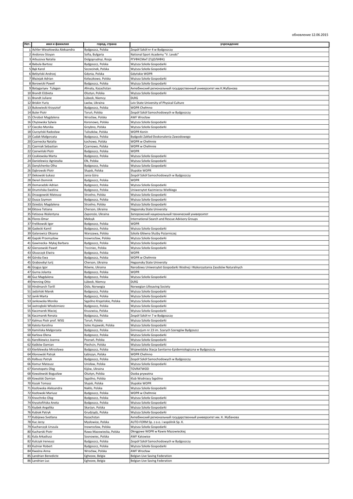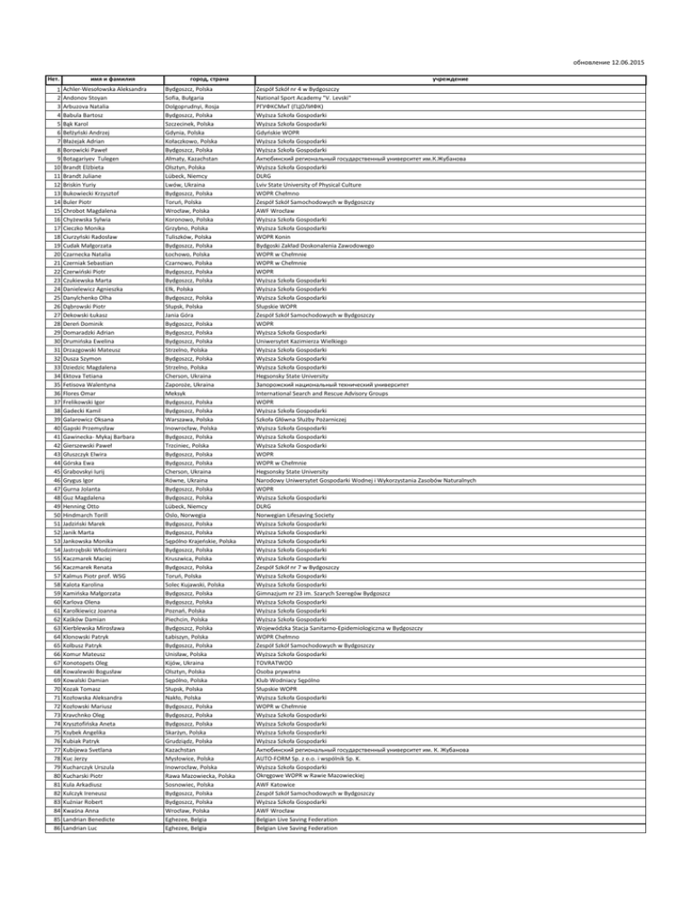 обновление 12.06.2015 Нет. 1 2 3 4 5 6 7 8 9 10 11 12 13 14 15 16 17 18 19 20 21 22 23 24 25 26 27 28 29 30 31 32 33 34 35 36 37 38 39 40 41 42 43 44 45 46 47 48 49 50 51 52 53 54 55 56 57 58 59 60 61 62 63 64 65 66 67 68 69 70 71 72 73 74 75 76 77 78 79 80 81 82 83 84 85 86 имя и фамилия Achler-Wesołowska Aleksandra Andonov Stoyan Arbuzova Natalia Babula Bartosz Bąk Karol Bełżyński Andrzej Błażejak Adrian Borowicki Paweł Botagariyev Tulegen Brandt Elżbieta Brandt Juliane Briskin Yuriy Bukowiecki Krzysztof Buler Piotr Chrobot Magdalena Chyżewska Sylwia Cieczko Monika Ciurzyński Radosław Cudak Małgorzata Czarnecka Natalia Czerniak Sebastian Czerwiński Piotr Czukiewska Marta Danielewicz Agnieszka Danylchenko Olha Dąbrowski Piotr Dekowski Łukasz Dereń Dominik Domaradzki Adrian Drumińska Ewelina Drzazgowski Mateusz Dusza Szymon Dziedzic Magdalena Ektova Tetiana Fetisova Walentyna Flores Omar Frelikowski Igor Gadecki Kamil Galarowicz Oksana Gapski Przemysław Gawinecka- Mykaj Barbara Gierszewski Paweł Głuszczyk Elwira Górska Ewa Grabovskyi Iurij Grygus Igor Gurna Jolanta Guz Magdalena Henning Otto Hindmarch Torill Jadziński Marek Janik Marta Jankowska Monika Jastrzębski Włodzimierz Kaczmarek Maciej Kaczmarek Renata Kalmus Piotr prof. WSG Kalota Karolina Kamińska Małgorzata Karlova Olena Karolkiewicz Joanna Kaśków Damian Kierblewska Mirosława Klonowski Patryk Kolbusz Patryk Komur Mateusz Konotopets Oleg Kowalewski Bogusław Kowalski Damian Kozak Tomasz Kozłowska Aleksandra Kozłowski Mariusz Kravchnko Oleg Krysztofińska Aneta Ksybek Angelika Kubiak Patryk Kubijewa Svetlana Kuc Jerzy Kucharczyk Urszula Kucharski Piotr Kula Arkadiusz Kulczyk Ireneusz Kuźniar Robert Kwaśna Anna Landrian Benedicte Landrian Luc город, страна Bydgoszcz, Polska Sofia, Bułgaria Dolgoprudnyi, Rosja Bydgoszcz, Polska Szczecinek, Polska Gdynia, Polska Kołaczkowo, Polska Bydgoszcz, Polska Ałmaty, Kazachstan Olsztyn, Polska Lübeck, Niemcy Lwów, Ukraina Bydgoszcz, Polska Toruń, Polska Wrocław, Polska Koronowo, Polska Grzybno, Polska Tuliszków, Polska Bydgoszcz, Polska Łochowo, Polska Czarnowo, Polska Bydgoszcz, Polska Bydgoszcz, Polska Ełk, Polska Bydgoszcz, Polska Słupsk, Polska Jania Góra Bydgoszcz, Polska Bydgoszcz, Polska Bydgoszcz, Polska Strzelno, Polska Bydgoszcz, Polska Strzelno, Polska Cherson, Ukraina Zaporoże, Ukraina Meksyk Bydgoszcz, Polska Bydgoszcz, Polska Warszawa, Polska Inowrocław, Polska Bydgoszcz, Polska Trzciniec, Polska Bydgoszcz, Polska Bydgoszcz, Polska Cherson, Ukraina Równe, Ukraina Bydgoszcz, Polska Bydgoszcz, Polska Lübeck, Niemcy Oslo, Norwegia Bydgoszcz, Polska Bydgoszcz, Polska Sępólno Krajeńskie, Polska Bydgoszcz, Polska Kruszwica, Polska Bydgoszcz, Polska Toruń, Polska Solec Kujawski, Polska Bydgoszcz, Polska Bydgoszcz, Polska Poznań, Polska Piechcin, Polska Bydgoszcz, Polska Łabiszyn, Polska Bydgoszcz, Polska Unisław, Polska Kijów, Ukraina Olsztyn, Polska Sępólno, Polska Słupsk, Polska Nakło, Polska Bydgoszcz, Polska Bydgoszcz, Polska Bydgoszcz, Polska Skarżyn, Polska Grudziądz, Polska Kazachstan Mysłowice, Polska Inowrocław, Polska Rawa Mazowiecka, Polska Sosnowiec, Polska Bydgoszcz, Polska Bydgoszcz, Polska Wrocław, Polska Eghezee, Belgia Eghezee, Belgia учреждение Zespół Szkół nr 4 w Bydgoszczy National Sport Academy "V. Levski" РГУФКСМиТ (ГЦОЛИФК) Wyższa Szkoła Gospodarki Wyższa Szkoła Gospodarki Gdyńskie WOPR Wyższa Szkoła Gospodarki Wyższa Szkoła Gospodarki Актюбинский региональный государственный университет им.К.Жубанова Wyższa Szkoła Gospodarki DLRG Lviv State University of Physical Culture WOPR Chełmno Zespół Szkół Samochodowych w Bydgoszczy AWF Wrocław Wyższa Szkoła Gospodarki Wyższa Szkoła Gospodarki WOPR Konin Bydgoski Zakład Doskonalenia Zawodowego WOPR w Chełmnie WOPR w Chełmnie WOPR Wyższa Szkoła Gospodarki Wyższa Szkoła Gospodarki Wyższa Szkoła Gospodarki Słupskie WOPR Zespół Szkół Samochodowych w Bydgoszczy WOPR Wyższa Szkoła Gospodarki Uniwersytet Kazimierza Wielkiego Wyższa Szkoła Gospodarki Wyższa Szkoła Gospodarki Wyższa Szkoła Gospodarki Hegsonsky State University Запорожский национальный технический университет International Search and Rescue Advisory Groups WOPR Wyższa Szkoła Gospodarki Szkoła Główna Służby Pożarniczej Wyższa Szkoła Gospodarki Wyższa Szkoła Gospodarki Wyższa Szkoła Gospodarki WOPR WOPR w Chełmnie Hegsonsky State University Narodowy Uniwersytet Gospodarki Wodnej i Wykorzystania Zasobów Naturalnych WOPR Wyższa Szkoła Gospodarki DLRG Norwegian Lifesaving Society Wyższa Szkoła Gospodarki Wyższa Szkoła Gospodarki Wyższa Szkoła Gospodarki Wyższa Szkoła Gospodarki Wyższa Szkoła Gospodarki Zespół Szkół nr 7 w Bydgoszczy Wyższa Szkoła Gospodarki Wyższa Szkoła Gospodarki Gimnazjum nr 23 im. Szarych Szeregów Bydgoszcz Wyższa Szkoła Gospodarki Wyższa Szkoła Gospodarki Wyższa Szkoła Gospodarki Wojewódzka Stacja Sanitarno-Epidemiologiczna w Bydgoszczy WOPR Chełmno Zespół Szkół Samochodowych w Bydgoszczy Wyższa Szkoła Gospodarki TOVRATWOD Osoba prywatna Klub Wodniacy Sępólno Słupskie WOPR Wyższa Szkoła Gospodarki WOPR w Chełmnie Wyższa Szkoła Gospodarki Wyższa Szkoła Gospodarki Wyższa Szkoła Gospodarki Wyższa Szkoła Gospodarki Актюбинский региональный государственный университет им. К. Жубанова AUTO-FORM Sp. z o.o. i wspólnik Sp. K. Wyższa Szkoła Gospodarki Okręgowe WOPR w Rawie Mazowieckiej AWF Katowice Zespół Szkół Samochodowych w Bydgoszczy Wyższa Szkoła Gospodarki AWF Wrocław Belgian Live Saving Federation Belgian Live Saving Federation 87 88 89 90 91 92 93 94 95 96 97 98 99 100 101 102 103 104 105 106 107 108 109 110 111 112 113 114 115 116 117 118 119