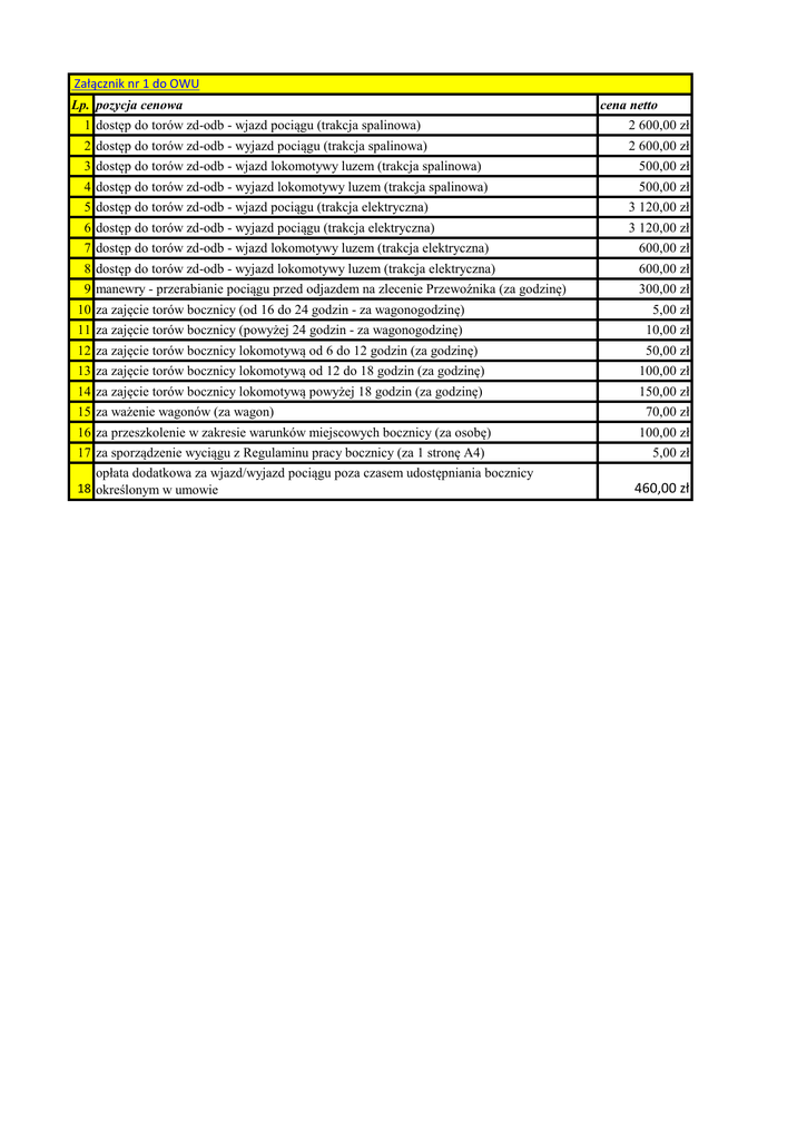 Załącznik nr 1 do OWU Lp. pozycja cenowa cena netto 1 dostęp do torów zd-odb - wjazd pociągu (trakcja spalinowa) 2 600,00 zł 2 dostęp do torów zd-odb - wyjazd pociągu (trakcja spalinowa) 2 600,00 zł 3 dostęp do torów zd-odb - wjazd lokomotywy luzem (trakcja spalinowa) 500,00 zł 4 dostęp do torów zd-odb - wyjazd lokomotywy luzem (trakcja spalinowa) 500,00 zł 5 dostęp do torów zd-odb - wjazd pociągu (trakcja elektryczna) 3 120,00 zł 6 dostęp do torów zd-odb - wyjazd pociągu (trakcja elektryczna) 3 120,00 zł 7 dostęp do torów zd-odb - wjazd lokomotywy luzem (trakcja elektryczna) 600,00 zł 8 dostęp do torów zd-odb - wyjazd lokomotywy luzem (trakcja elektryczna) 600,00 zł 9 manewry - przerabianie pociągu przed odjazdem na zlecenie Przewoźnika (za godzinę) 300,00 zł 10 za zajęcie torów bocznicy (od 16 do 24 godzin - za wagonogodzinę) 5,00 zł 11 za zajęcie torów bocznicy (powyżej 24 godzin - za wagonogodzinę) 10,00 zł 12 za zajęcie torów bocznicy lokomotywą od 6 do 12 godzin (za godzinę) 50,00 zł 13 za zajęcie torów bocznicy lokomotywą od 12 do 18 godzin (za godzinę) 100,00 zł 14 za zajęcie torów bocznicy lokomotywą powyżej 18 godzin (za godzinę) 150,00 zł 15 za ważenie wagonów (za wagon) 16 za przeszkolenie w zakresie warunków miejscowych bocznicy (za osobę) 17 za sporządzenie wyciągu z Regulaminu pracy bocznicy (za 1 stronę A4) opłata dodatkowa za wjazd/wyjazd pociągu poza czasem udostępniania bocznicy 18 określonym w umowie 70,00 zł 100,00 zł 5,00 zł 460,00 zł