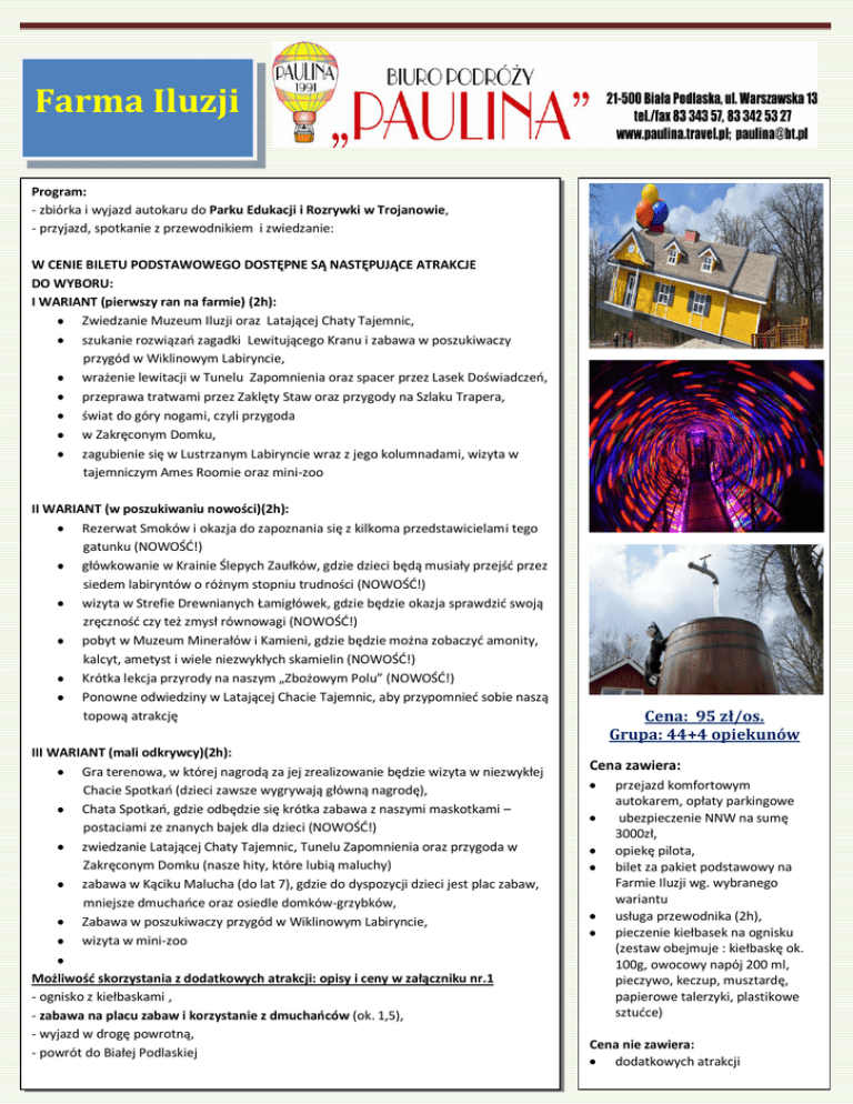 WYCIECZKA DO PARYŻA Farma Iluzji 6 dni Program: - zbiórka i wyjazd autokaru do Parku Edukacji i Rozrywki w Trojanowie, - przyjazd, spotkanie z przewodnikiem i zwiedzanie: W CENIE BILETU PODSTAWOWEGO DOSTĘPNE SĄ NASTĘPUJĄCE ATRAKCJE DO WYBORU: I WARIANT (pierwszy ran na farmie) (2h): Zwiedzanie Muzeum Iluzji oraz Latającej Chaty Tajemnic, szukanie rozwiązań zagadki Lewitującego Kranu i zabawa w poszukiwaczy przygód w Wiklinowym Labiryncie, wrażenie lewitacji w Tunelu Zapomnienia oraz spacer przez Lasek Doświadczeń, przeprawa tratwami przez Zaklęty Staw oraz przygody na Szlaku Trapera, świat do góry nogami, czyli przygoda w Zakręconym Domku, zagubienie się w Lustrzanym Labiryncie wraz z jego kolumnadami, wizyta w tajemniczym Ames Roomie oraz mini-zoo II WARIANT (w poszukiwaniu nowości)(2h): Rezerwat Smoków i okazja do zapoznania się z kilkoma przedstawicielami tego gatunku (NOWOŚĆ!) główkowanie w Krainie Ślepych Zaułków, gdzie dzieci będą musiały przejść przez siedem labiryntów o różnym stopniu trudności (NOWOŚĆ!) wizyta w Strefie Drewnianych Łamigłówek, gdzie będzie okazja sprawdzić swoją zręczność czy też zmysł równowagi (NOWOŚĆ!) pobyt w Muzeum Minerałów i Kamieni, gdzie będzie można zobaczyć amonity, kalcyt, ametyst i wiele niezwykłych skamielin (NOWOŚĆ!) Krótka lekcja przyrody na naszym „Zbożowym Polu” (NOWOŚĆ!) Ponowne odwiedziny w Latającej Chacie Tajemnic, aby przypomnieć sobie naszą topową atrakcję III WARIANT (mali odkrywcy)(2h): Gra terenowa, w której nagrodą za jej zrealizowanie będzie wizyta w niezwykłej Chacie Spotkań (dzieci zawsze wygrywają główną nagrodę), Chata Spotkań, gdzie odbędzie się krótka zabawa z naszymi maskotkami – postaciami ze znanych bajek dla dzieci (NOWOŚĆ!) zwiedzanie Latającej Chaty Tajemnic, Tunelu Zapomnienia oraz przygoda w Zakręconym Domku (nasze hity, które lubią maluchy) zabawa w Kąciku Malucha (do lat 7), gdzie do dyspozycji dzieci jest plac zabaw, mniejsze dmuchańce oraz osiedle domków-grzybków, Zabawa w poszukiwaczy przygód w Wiklinowym Labiryncie, wizyta w mini-zoo Możliwość skorzystania z dodatkowych atrakcji: opisy i ceny w załączniku nr.1 - ognisko z kiełbaskami , - zabawa na placu zabaw i korzystanie z dmuchańców (ok. 1,5), - wyjazd w drogę powrotną, - powrót do Białej Podlaskiej Cena: 95 zł/os. Grupa: 44+4 opiekunów Cena zawiera: przejazd komfortowym autokarem, opłaty parkingowe ubezpieczenie NNW na sumę 3000zł, opiekę pilota, bilet za pakiet podstawowy na Farmie Iluzji wg. wybranego wariantu usługa przewodnika (2h), pieczenie kiełbasek na ognisku (zestaw obejmuje : kiełbaskę ok. 100g, owocowy napój 200 ml, pieczywo, keczup, musztardę, papierowe talerzyki, plastikowe sztućce) Cena nie zawiera: dodatkowych atrakcji