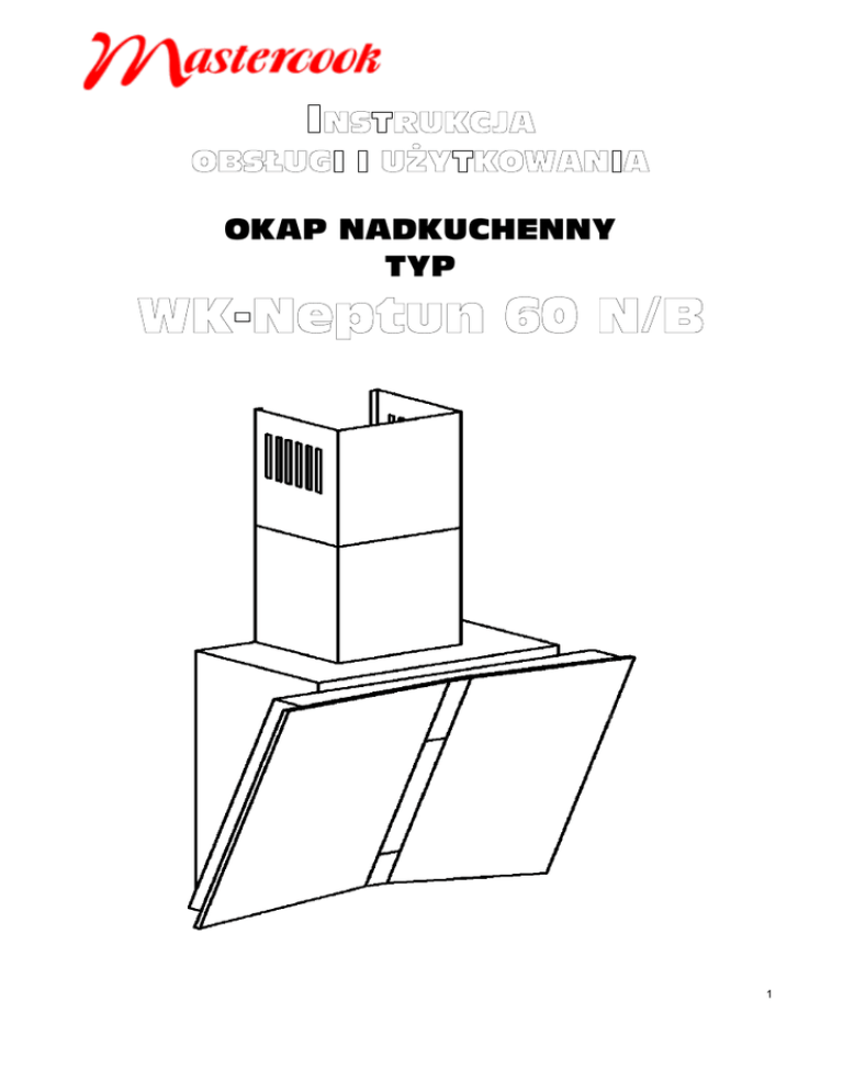 OKAP NADKUCHENNY TYP 1 Szanowni Państwo! Staliście się Państwo użytkownikami okapu typu WK-NEPTUN 60 N/B. Okap ten został zaprojektowany specjalnie z myślą o spełnieniu Państwa oczekiwań i z pewnością będzie stanowić integralną część nowocześnie wyposażonego gospodarstwa domowego. Zastosowane w nim rozwiązania konstrukcyjne zapewniają mu wysoką funkcjonalność i estetykę. Przed przystąpieniem do montażu i użytkowania okapu prosimy o dokładne zapoznanie się z treścią niniejszej instrukcji. Dzięki temu unikną Państwo błędnej obsługi i przez wiele lat będą mogli się cieszyć z bezawaryjnej eksploatacji tego urządzenia. Życzymy satysfakcji i zadowolenia z eksploatacji okapu. FagorMastercook S.A. UWAGA: Producent nie przyjmuje na siebie żadnej odpowiedzialności za uszkodzenia powstałe wskutek montażu niezgodnego z instrukcją obsługi. 2 Okap kuchenny WK-Neptun 60 służy do usuwania oparów Kuchennych. Wymaga on zainstalowania przewodu odprowadzającego powietrze na zewnątrz. Długość przewodu (najczęściej rura Ø 150 lub 120mm) nie powinna być dłuższa niż 4-5 m. Po zainstalowaniu filtra z węglem aktywnym okap może pracować jako pochłaniacz zapachów. W tym przypadku nie wymaga się instalowania przewodu odprowadzającego powietrze na zewnątrz, zaleca się natomiast montaż kierownicy wydmuchu powietrza. Okap kuchenny jest urządzeniem elektrycznym wykonanym w II klasie ochrony przeciwporażeniowej. Posiada niezależne oświetlenie oraz wentylator wyciągowy z możliwością ustawienia jednej z czterech prędkości obrotowych. Okap jest przeznaczony do trwałego zamocowania na pionowej ścianie ponad kuchenką gazową lub elektryczną; Okap jest złożony z następujących elementów (rys. 1): 1. Korpusu okapu B, wyposażonego w światła, zespół wentylatora, 2. Przednia część okapu w której znajduje się sterowanie A, 3. Dolna maskownica C, 4. Górna maskownica D. 3 Napięcie zasilania Silnik wentylatora Oświetlenie Ilość filtrów tłuszczowych Stopnie prędkości Szerokość [cm] Głębokość [cm] Wysokość [cm] Wylot [ø mm] Rodzaj pracy AC 230V ~50Hz 1 Led 2 x 3W 1 (60 cm) 4 60 390 1150-1500 150 lub 120 Wyciąg lub pochłaniacz 1. Okap kuchenny służy do usuwania oparów kuchennych na zewnątrz, należy podłączyć go do odpowiedniego kanału wentylacyjnego (nie podłączać do kanałów kominowych, dymowych lub spalinowych, będących w eksploatacji). 2. Urządzenie należy zamontować na wysokości co najmniej 450 mm od płyty kuchennej rys 2. 3. Pod okapem kuchennym nie wolno pozostawiać odkrytego płomienia, podczas zdejmowania naczyń znad palnika, należy ustawić minimalny płomień. 4. Potrawy przygotowywane na tłuszczach powinny być stale nadzorowane, gdyż przegrzany tłuszcz może się łatwo zapalić. 5. Filtr przeciw tłuszczowy do okapu kuchennego należy czyścić co najmniej co 2 miesiące, gdyż nasycony tłuszczem jest łatwopalny. 6. Przed każdą operacją czyszczenia, wymianą filtra lub przed podjęciem prac naprawczych, należy wyjąć wtyczkę urządzenia z gniazdka. 7. Jeżeli w pomieszczeniu, oprócz okapu, eksploatuje się inne urządzenia o zasilaniu nieelektrycznym (np. piece na paliwa ciekłe, grzejniki przepływowe, termy), należy zadbać o wystarczającą wentylację (dopływ powietrza). Bezpieczna eksploatacja jest możliwa, gdy przy jednoczesnej pracy okapu i urządzeń spalających, zależnych od powietrza w pomieszczeniu, w miejscu ustawienia tych urządzeń panuje podciśnienie najwyżej 0,004 milibara (ten punkt nie obowiązuje, gdy okap kuchenny jest użytkowany jako pochłaniacz zapachów). 8. Przy podłączeniu do sieci 230 V wymagane jest podłączenie do sprawnego gniazda elektrycznego. 9. Sprzęt jest przeznaczony do użytkowania wyłącznie w gospodarstwie domowym. Stosowanie do innych celów jest niedozwolone! 10. Producent zastrzega sobie możliwość wprowadzania zmian w celu unowocześniania wyrobu i stałego polepszania jakości, bez uprzedniego powiadomienia użytkowników. Zmiany te jednak nie będą stwarzały trudności przy obsłudze. 4 Ze względu na masę urządzenia do instalacji w normalnych warunkach potrzebne są 2 osoby. 1. 2. Zaznaczyć na ścianie pionową linię oznaczającą środek płyty kuchennej, Do ściany przyłożyć profil zawieszenia okapu F, ustawić go symetrycznie według linii środkowej, wstępnie go wypoziomować, zaznaczyć na ścianie rozstaw otworów montażowych 3. Wywiercić zaznaczone na ścianie otwory używając wiertła o średnicy odpowiadającej załączonym kołkom rozporowym, wbić kołki E a następnie przykręcić do ściany profil zawieszenia F 1. Montaż korpusu okapu A, i podłączanie okapu do przewodu kominowego. 1. Na przymocowany profil F, zawiesić korpus okapu i śrubami E wypoziomować go, dokręcić wkręt I dla zabezpieczenia okapu przed zsunięciem, Jeżeli jest wymagane, zamontować odpowiedni przewód odprowadzający powietrze do kanału wentylacyjnego, Na zawieszony okap założyć kolumnę teleskopową maskownicy C i D (rys. 1) 4. Maskownicę górną D (rys.1) rozsunąć do wymaganej wysokości, zaznaczyć jej maksymalny rozstaw na linii środkowej, zdjąć kolumnę maskownic, 5. W odległości 65 mm od zaznaczonego punktu maksymalnego, przyłożyć do linii środkowej wieszak K maskownicy górnej (rys. 4), zaznaczyć na ścianie rozstaw otworów montażowych i zgodnie z ppkt D zamontować go. 2. 3. 5 6. Ponownie założyć kolumnę maskownicy i korzystając z odpowiednich wkrętów przymocować ją do korpusu okapu i profilu górnego, 7. Podłączyć okap do sieci elektrycznej. 2. Podłączanie kominowego. okapu do przewodu Podłączyć okap do sieci elektrycznej. Sprawdzić czy działa oświetlenie okapu oraz czy prawidłowo pracuje silnik. Po zainstalowaniu okapu gniazdo powinno być dostępne w celu odłączenia wtyczki od zasilania. 3. Ustawienie trybu pracy okapu nadkuchennego 3.1. Ustawienie 