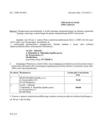 ZZ – 2380-143/2011 Szczecin, dnia 12.10.2011 r. informacja na stronę/ tablice ogłoszeń Dotyczy: Postępowania prowadzonego w trybie przetargu nieograniczonego na dostawę ogumienia letniego, zimowego i całorocznego do sprzętu transportowego KWP w Szczecinie Zgodnie z art. 92 ust. 2 ustawy Prawo zamówień publicznych (Dz.U. z 2007r. Nr 223, poz. 1655 z późn. zm.) Zamawiający zawiadamia, że: 1. rozstrzygnął przedmiotowe postępowanie. Wyniku badania i oceny ofert wybrano najkorzystniejszą ofertę złożoną przez Wykonawcę: AUTO – TRONIC J. Michalski, E. Michalska Spółka jawna ul. Przemysłowa 17, 09-400 Płock cena brutto oferty 337 528,00 zł 2. następujący Wykonawcy złożyli oferty oraz następująco przedstawia się streszczenie oceny i porównania złożonych ofert zawierających punktację przyznaną ofertom w kryterium oceny ofert 100% cena i łączną punktację: Nr oferty Wykonawca 1 2 MOTO BUDREX Spółka z o.o. ul. Grunwaldzka 291, 85-438 Bydgoszcz AUTO – TRONIC J. Michalski, E. Michalska Spółka jawna ul. Przemysłowa 17, 09-400 Płock Liczba pkt w kryterium cena 76,28 100,00 3. Umowa w sprawie zamówienia publicznego zostanie zawarta po upływie terminu określonego w art. 94 ust. 1 pkt 2) uPzp. Wyk. K.O.