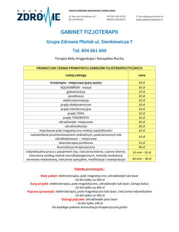 GABINET FIZJOTERAPII Grupa Zdrowie Płońsk ul. Sienkiewicza 7 Tel. 604 661 660 Terapia Bólu Kręgosłupa i Narządów Ruchu PROMOCYJNY CENNIK PRYWATNYCH ZABIEGÓW FIZJOTERAPEUTYCZNYCH rodzaj zabiegu cena krioterapia - miejscowa (pary azotu) 20 zł AQUAVIBRON - masaż galwanizacja jonoforeza elektrostymulacja prądy diadynamiczne prądy interferencyjne prądy TENS prądy TRAEBERTA ultradźwięki miejscowe ultrafonoforeza impulsowe pole magnetyczne niskiej częstotliwości naświetlanie promieniowaniem widzialnym, podczerwonym lub ultrafioletowym – miejscowe laseroterapia punktowa Konsultacja terapeutyczna indywidualna praca z pacjentem (np. ćwiczenia bierne, czynno-bierne, ćwiczenia według metod neurofizjologicznych, metody reedukacji nerwowo-mięśniowej, ćwiczenia specjalne, mobilizacje i manipulacje) 30 zł 10 zł 10 zł 10 zł 10 zł 10 zł 10 zł 10 zł 20 zł 20 zł 10 zł 10 zł 15 zł 40 zł 15 min - 20 zł 30 min – 30 zł Pakiety promocyjne : Mały pakiet: elektroterapia, pole magnetyczne, ultradźwięki lub laser -10 dni tylko za 300 zł Duży projekt: elektroterapia, pole magnetyczne, ultradźwięki lub laser, lampa Solux -10 dni tylko za 400 zł Popraw sprawność: elektroterapia, pole magnetyczne lub laser, ćwiczenia indywidualne -10 dni tylko za 300 zł Ostrogi piętowe: ultradźwięki plus laser -10 dni tylko 190 zł Do każdego pakietu konsultacja terapeutyczna gratis