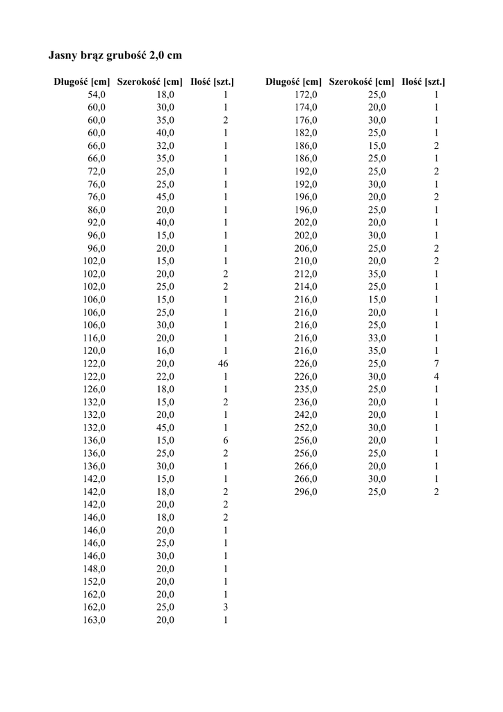 Jasny brąz grubość 2,0 cm Długość [cm] Szerokość [cm] Ilość [szt.] 54,0 18,0 1 60,0 30,0 1 60,0 35,0 2 60,0 40,0 1 66,0 32,0 1 66,0 35,0 1 72,0 25,0 1 76,0 25,0 1 76,0 45,0 1 86,0 20,0 1 92,0 40,0 1 96,0 15,0 1 96,0 20,0 1 102,0 15,0 1 102,0 20,0 2 102,0 25,0 2 106,0 15,0 1 106,0 25,0 1 106,0 30,0 1 116,0 20,0 1 120,0 16,0 1 122,0 20,0 46 122,0 22,0 1 126,0 18,0 1 132,0 15,0 2 132,0 20,0 1 132,0 45,0 1 136,0 15,0 6 136,0 25,0 2 136,0 30,0 1 142,0 15,0 1 142,0 18,0 2 142,0 20,0 2 146,0 18,0 2 146,0 20,0 1 146,0 25,0 1 146,0 30,0 1 148,0 20,0 1 152,0 20,0 1 162,0 20,0 1 162,0 25,0 3 163,0 20,0 1 Długość [cm] Szerokość [cm] Ilość [szt.] 172,0 25,0 1 174,0 20,0 1 176,0 30,0 1 182,0 25,0 1 186,0 15,0 2 186,0 25,0 1 192,0 25,0 2 192,0 30,0 1 196,0 20,0 2 196,0 25,0 1 202,0 20,0 1 202,0 30,0 1 206,0 25,0 2 210,0 20,0 2 212,0 35,0 1 214,0 25,0 1 216,0 15,0 1 216,0 20,0 1 216,0 25,0 1 216,0 33,0 1 216,0 35,0 1 226,0 25,0 7 226,0 30,0 4 235,0 25,0 1 236,0 20,0 1 242,0 20,0 1 252,0 30,0 1 256,0 20,0 1 256,0 25,0 1 266,0 20,0 1 266,0 30,0 1 296,0 25,0 2