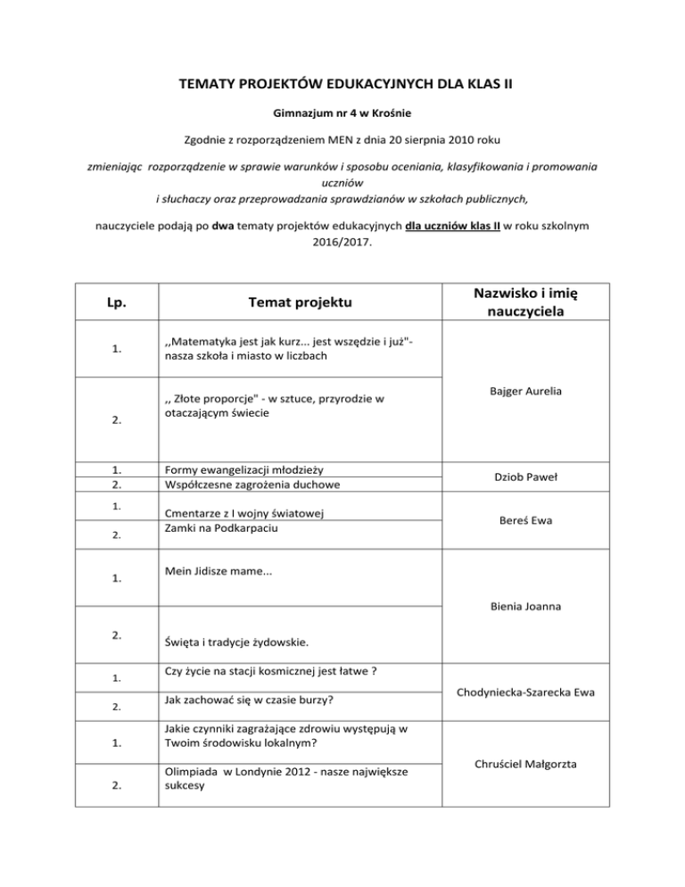 TEMATY PROJEKTÓW EDUKACYJNYCH DLA KLAS II Gimnazjum nr 4 w Krośnie Zgodnie z rozporządzeniem MEN z dnia 20 sierpnia 2010 roku zmieniając rozporządzenie w sprawie warunków i sposobu oceniania, klasyfikowania i promowania uczniów i słuchaczy oraz przeprowadzania sprawdzianów w szkołach publicznych, nauczyciele podają po dwa tematy projektów edukacyjnych dla uczniów klas II w roku szkolnym 2016/2017. Lp. 1. 2. 1. 2. 1. 2. 1. Temat projektu Nazwisko i imię nauczyciela ,,Matematyka jest jak kurz... jest wszędzie i już"nasza szkoła i miasto w liczbach ,, Złote proporcje" - w sztuce, przyrodzie w otaczającym świecie Formy ewangelizacji młodzieży Współczesne zagrożenia duchowe Cmentarze z I wojny światowej Zamki na Podkarpaciu Bajger Aurelia Dziob Paweł Bereś Ewa Mein Jidisze mame... Bienia Joanna 2. 1. 2. Święta i tradycje żydowskie. Czy życie na stacji kosmicznej jest łatwe ? Jak zachować się w czasie burzy? 1. Jakie czynniki zagrażające zdrowiu występują w Twoim środowisku lokalnym? 2. Olimpiada w Londynie 2012 - nasze największe sukcesy Chodyniecka-Szarecka Ewa Chruściel Małgorzta 1. Jak style muzyczne wpływają na gusta młodzieżowe? Druciak Joanna 2. 1. 2. 1. 2. 1. 2. 1. 2. 1. 2. Święta i tradycje bożonarodzeniowe - kolędy Język angielski jakiego nie znamy Stany Zjednoczone Ameryki Północnej to kraj słynacy z... Moda w literaturze i sztuce na przestrzeni dziejów Polscy laureaci literackiej Nagrody Nobla Ochrona przyrody w województwie podkarpackim Fara Jolanta Guzik Maciej Parki narodowe USA Anglia - Przewodnik Jak powstaje słuchowisko radiowe? Literackie wędrówki po Polsce śladami twórców 2. Krzyżówki literacko-gramatyczne dla gimnazjalistów Pobawmy się polską ortografią. Zbiór dyktand dla gimnazjalistów 1. Jak to się stało, że to co płaskie stało się przestrzenne - o perspektyce 1. Dziedzic Matylda Łopatkiewicz Beata Grabias Mirosława Grzebieniowska Renata Janowska Urszula 2. 1. Film jako dziedzina sztuki Ciekawe pytania , czyli pytania Fermiego dotyczące naszej szkoły Jastrzębska Maria 2. 1. 2. 1. 2. 1. 2. 1. 2. Symetrie w otaczającym nas świecie Atrakcje turystyczne Podkarpacia Atrakcje turystyczne Krosna i okolic Amisze - prawdy i mity Kanada - dwujęzyczność w społeczeństwie Przewodnik po Londynie Kijowska Barbara Koś Anna Łopuszańska-Patrylak Dorota Kalendarz świat brytyjskich Administrator sieci komuterowej Darmowe oprogramowanie - też może być interesujące Majerski Marcin 1. Ignacy Łukasiewicz - życie i dzieło Malik Marta 2. 1. 2. 1. 2. 1. 2. 1. 2. 1. Wielcy Polacy - Maria Skłodowska - Curie Historia siatkówki ( sukcesy reprezentacji Polski ) W jaki sposób zachęcić młodzież do czynnego uprawiania sportu Marszałek Jaromir Trzymaj formę Zdrowie= dieta +aktywny tryb życia Czas wolny dawniej i dziś więcej różnic czy podobieństw Historia wybranej dyscypliny sportu Pismo na przestrzeni dziejów Wykonanie witryny www na powyższy temat. Matras-Kociuba Mariola Mikulska Elwira Nabywaniec Włodzimierz Wpływ prawidłowego odżywiania na zdrowie człowieka Rajs Dorota 2. 1. 2. 1. 2. 1. 2. 1. 2. 1. 2. 1. 2. 1. 2. 1. 2. Ocena zanieczyszczenia najbliższego środowiska Praktyczne zastosowanie kwasów i zasad Serwatka Monika Śladami kina w sławnych miejscach w Nowym Jorku Ślady polskie w Waszyngtonie - przewodnik po Waszyngtonie Inteligentny model sygnalizacji świetlnej skrzyżowania Robot podążający za linią Symetrie w naturze i architekturze Jak w ciągu lat zmienił się krośnieński świat? Zabytki Paryża Polacy we Francji Kalendarz świąt niemieckich Przewodnik po Wiedniu Polska a organizacje międzynarodowe Państwa UE Moda w sporcie Odczucia i oczekiwania uczniów G-4 w Krośnie w zakresie WF i sportu w szkole Smyka Anna Solecki Ryszard Gębarowska Jolanta Rachwał Beata Witalis Elżbieta Oryszczak Joanna Fara Arkadiusz