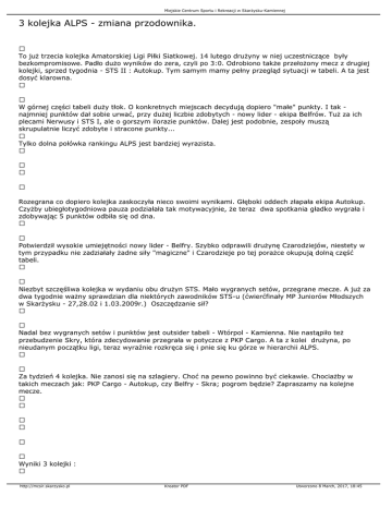 Miejskie Centrum Sportu i Rekreacji w Skarżysku-Kamiennej 3 kolejka ALPS - zmiana przodownika. To już trzecia kolejka Amatorskiej Ligi Piłki Siatkowej. 14 lutego drużyny w niej uczestniczące były bezkompromisowe. Padło dużo wyników do zera, czyli po 3:0. Odrobiono także przełożony mecz z drugiej kolejki, sprzed tygodnia - STS II : Autokup. Tym samym mamy pełny przegląd sytuacji w tabeli. A ta jest dosyć klarowna. W górnej części tabeli duży tłok. O konkretnych miejscach decydują dopiero "małe" punkty. I tak najmniej punktów dał sobie urwać, przy dużej liczbie zdobytych - nowy lider - ekipa Belfrów. Tuż za ich plecami Nerwusy i STS I, ale o gorszym ilorazie punktów. Dalej jest podobnie, zespoły muszą skrupulatnie liczyć zdobyte i stracone punkty... Tylko dolna połówka rankingu ALPS jest bardziej wyrazista. Rozegrana co dopiero kolejka zaskoczyła nieco swoimi wynikami. Głęboki oddech złapała ekipa Autokup. Czyżby ubiegłotygodniowa pauza podziałała tak motywacyjnie, że teraz dwa spotkania gładko wygrała i zdobywając 5 punktów odbiła się od dna. Potwierdził wysokie umiejętności nowy lider - Belfry. Szybko odprawili drużynę Czarodziejów, niestety w tym przypadku nie zadziałały żadne siły "magiczne" i Czarodzieje po tej porażce okupują dolną część tabeli. Niezbyt szczęśliwa kolejka w wydaniu obu drużyn STS. Mało wygranych setów, przegrane mecze. A już za dwa tygodnie ważny sprawdzian dla niektórych zawodników STS-u (ćwierćfinały MP Juniorów Młodszych w Skarżysku - 27,28.02 i 1.03.2009r.) Oszczędzanie sił? Nadal bez wygranych setów i punktów jest outsider tabeli - Wtórpol - Kamienna. Nie nastąpiło też przebudzenie Skry, która zdecydowanie przegrała w potyczce z PKP Cargo. A ta z kolei drużyna, po nieudanym początku ligi, teraz wyraźnie rozkręca się i pnie się ku górze w hierarchii ALPS. Za tydzień 4 kolejka. Nie zanosi się na szlagiery. Choć na pewno powinno być ciekawie. Chociażby w takich meczach jak: PKP Cargo - Autokup, czy Belfry - Skra; pogrom będzie? Zapraszamy na kolejne mecze. Wyniki 3 kolejki : http://mcsir.skarzysko.pl Kreator PDF Utworzono 8 March, 2017, 18:45 Miejskie Centrum Sportu i Rekreacji w Skarżysku-Kamiennej Belfry - Czarodzieje PKP Cargo - Skra Autokup - Oldstars Nerwusy - Wtórpol Kamienna STS II - Domino Jastrząb STS I - Oldboy'e * STS II - Autokup 3:0 (25:10, 25:10, 25:15), 3:0 (25:8, 25:8, 25:15), 3:0 (25:9, 25:18, 25:17), 3:0 (25:7, 25:11, 25:16), 0:3 (12:25, 19:25, 10:25) 2:1 (26:28, 25:13, 25:17), 1:2 (28:26, 16:25, 16:25) * - mecz z 2 kolejki ALPS Tabela po 3 kolejkach: Lp. Zespół Pkt. Sety Iloraz "małych" punktów. 1. Belfry 7 7-2 http://mcsir.skarzysko.pl Kreator PDF Utworzono 8 March, 2017, 18:45 Miejskie Centrum Sportu i Rekreacji w Skarżysku-Kamiennej 1,60 2. Nerwusy 7 7-2 1,34 3. STS I 7 7-2 1,20 4. Domino Jastrząb 6 6-3 1,29 5. PKP Cargo http://mcsir.skarzysko.pl Kreator PDF Utworzono 8 March, 2017, 18:45 Miejskie Centrum Sportu i Rekreacji w Skarżysku-Kamiennej 6 6-3 1,25 6. Oldboy'e 6 6-3 1,20 7. Autokup 5 5-4 1,11 8. STS II 4 4-5 0,91 http://mcsir.skarzysko.pl Kreator PDF Utworzono 8 March, 2017, 18:45 Miejskie Centrum Sportu i Rekreacji w Skarżysku-Kamiennej 9. Oldstars 3 3-6 0,88 10. Czarodzieje 2 2-7 0,67 11. Skra 1 1-8 0,64 12. Wtórpol-Kamienna 0 0-9 http://mcsir.skarzysko.pl Kreator PDF Utworzono 8 March, 2017, 18:45 Miejskie Centrum Sportu i Rekreacji w Skarżysku-Kamiennej 0,47 Zapowiedź 4 kolejki (21.02): Mecze o godz. 9.00: 1. Belfry - Skra 2. PKP Cargo - Autokup Mecze o godz. 11.00: 3. Nerwusy - Czarodzieje 4. STS I - Wtórpol Kamienna Mecze o godz. 12.30: 5. STS II - Oldboy'e 6. Domino - Jastrząb - Oldstars Krótka fotorelacja z 3 kolejki ALPS: Przywitanie drużyn Oldstars i Autokup zdjęcia dzięki portalowi skarzysko24.pl http://mcsir.skarzysko.pl Kreator PDF Utworzono 8 March, 2017, 18:45 Miejskie Centrum Sportu i Rekreacji w Skarżysku-Kamiennej http://mcsir.skarzysko.pl Kreator PDF Utworzono 8 March, 2017, 18:45