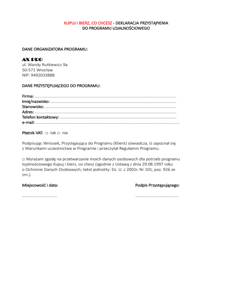 KUPUJ I BIERZ, CO CHCESZ - DEKLARACJA PRZYSTĄPIENIA DO PROGRAMU LOJALNOŚCIOWEGO DANE ORGANIZATORA PROGRAMU: AX PRO ul. Wandy Rutkiewicz 9a 50-571 Wrocław NIP: 9492033888 DANE PRZYSTĘPUJĄCEGO DO PROGRAMU: Firma: …......................................................................................................................... Imię/nazwisko: …........................................................................................................... Stanowisko: …................................................................................................................ Adres: …......................................................................................................................... Telefon kontaktowy: …................................................................................................... e-mail: …........................................................................................................................... Płatnik VAT: □ tak □ nie Podpisując Wniosek, Przystępujący do Programu (Klient) oświadcza, iż zapoznał się z Warunkami uczestnictwa w Programie i przeczytał Regulamin Programu. □ Wyrażam zgodę na przetwarzanie moich danych osobowych dla potrzeb programu lojalnościowego Kupuj i bierz, co chesz (zgodnie z Ustawą z dnia 29.08.1997 roku o Ochronie Danych Osobowych; tekst jednolity: Dz. U. z 2002r. Nr 101, poz. 926 ze zm.). Miejscowość i data: Podpis Przystępującego: …............................ .......…............................
