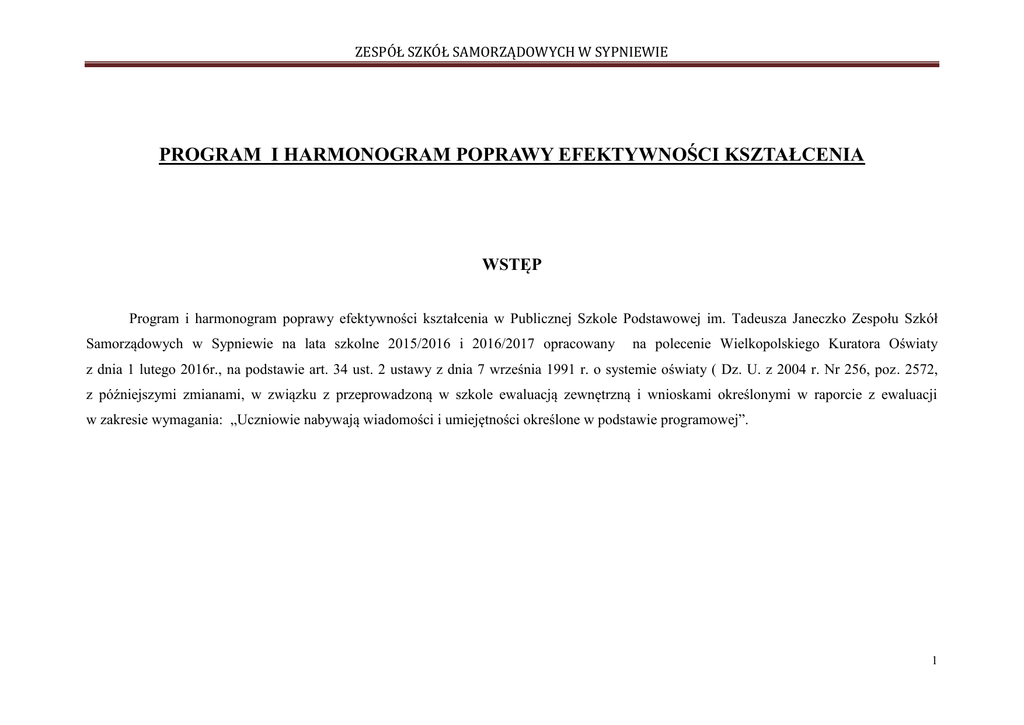 ZESPÓŁ SZKÓŁ SAMORZĄDOWYCH W SYPNIEWIE PROGRAM I HARMONOGRAM POPRAWY EFEKTYWNOŚCI KSZTAŁCENIA WSTĘP Program i harmonogram poprawy efektywności kształcenia w Publicznej Szkole Podstawowej im. Tadeusza Janeczko Zespołu Szkół Samorządowych w Sypniewie na lata szkolne 2015/2016 i 2016/2017 opracowany na polecenie Wielkopolskiego Kuratora Oświaty z dnia 1 lutego 2016r., na podstawie art. 34 ust. 2 ustawy z dnia 7 września 1991 r. o systemie oświaty ( Dz. U. z 2004 r. Nr 256, poz. 2572, z późniejszymi zmianami, w związku z przeprowadzoną w szkole ewaluacją zewnętrzną i wnioskami określonymi w raporcie z ewaluacji w zakresie wymagania: „Uczniowie nabywają wiadomości i umiejętności określone w podstawie programowej”. 1 ZESPÓŁ SZKÓŁ SAMORZĄDOWYCH W SYPNIEWIE CELE PROGRAMU CEL GŁÓWNY Poprawa efektywności kształcenia w Publicznej Szkole Podstawowej w Sypniewie – osiągnięcie poziomu podstawowego z wymagania „Uczniowie nabywają wiadomości i umiejętności określone w podstawie programowej”. CELE SZCZEGÓŁOWE: zintensyfikowanie działań mających na celu wykorzystywanie przez uczniów wiadomości i umiejętności określonych w podstawie programowej podczas wykonywania zadań i rozwiązywania problemów, udoskonalenie systemu monitorowania i analizowania osiągnięć każdego ucznia, a także formułowania i wdrażania wniosków z tych analiz, kształtowanie umiejętności: czytania, myślenia matematycznego, myślenia naukowego, komunikowania się w języku ojczystym i w językach obcych, zarówno w mowie, jak i w piśmie, umiejętności sprawnego posługiwania się nowoczesnymi technologiami informacyjno-komunikacyjnymi; umiejętności wyszukiwania, selekcjonowania i krytycznej analizy informacji; umiejętności rozpoznawania własnych potrzeb edukacyjnych oraz uczenia się, umiejętności pracy zespołowej; doskonalenie efektów procesu dydaktycznego, pedagogizacja rodziców, uświadomienie im potrzeby ścisłej współpracy ,,szkoły” i ,,domu” w celu osiągnięcia lepszych wyników, współdziałanie zespołu nauczycieli uczących w jednym oddziale, współdziałanie nauczycieli w zespołach przedmiotowych, zaplanowanie ewaluacji wprowadzonego programu, uwzględniając kryteria sukcesu. 2 ZESPÓŁ SZKÓŁ SAMORZĄDOWYCH W SYPNIEWIE ZADANIA DYREKTORA 1. Wzmocnienie nadzoru nad prawidłową realizacją podstawy programowej z uwzględnieniem zalecanych warunków i sposobów jej realizacji. 2. Zapewnienie nauczycielom właściwej bazy lokalowej i pomocy dydaktycznych niezbędnych do realizacji podstawy programowej i wybranych programów nauczania. 3. Wyposażenie sal lekcyjnych w komputer, rzutnik multimedialny z dostępem do internetu. 4. Zapoznanie Rady Rodziców z założeniami programu i harmonogramu poprawy efektywności kształcenia. 5. Organizowanie pracy szkoły z uwzględnieniem udziału uczniów w zajęciach pozalekcyjnych w celu podniesienia wiedzy i umiejętności uczniów. 6. Nadzorowanie przeprowadzenia prelekcji dla rodziców dotyczących: motywacji do nauki oraz organizacji czasu pracy ucznia. 7. Organizowanie spotkań z udziałem rodziców i uczniów, nauczycieli, dyrektora w celu omówienia wyników sprawdzianu. 8. Nagradzanie zespołu klasowego za podniesienie wyników nauczania w danym roku szkolnym. 3 ZESPÓŁ SZKÓŁ SAMORZĄDOWYCH W SYPNIEWIE ZADANIA NAUCZYCIELI ( działania wychowawców, pedagoga, nauczycieli ) 1. Systematyczna realizacja podstawy programowej z uwzględnieniem zalecanych warunków i sposobów jej realizacji. 2. Opracowanie i przeprowadzenie sprawdzianu próbnego dla klasy V i VI. 3. Opracowanie analiz i wniosków z przeprowadzonych testów i sprawdzianu oraz ich wdrażanie dla kl. V i VI. 4. Poinformowanie rodziców o wynikach próbnego sprawdzianu. 5. Wykorzystanie nowoczesnych technologii informacyjno-komunikacyjnych na zajęciach ( sala komputerowa, biblioteka). 6. Dzielenie się doświadczeniem i informacjami ze szkoleń i kursów z nauczycielami na zespołach przedmiotowych. 7. Zwiększenie ilości zajęć lekcyjnych prowadzonych metodami aktywizującymi. 8. Pedagogizacja rodziców odnośnie motywacji uczniów do nauki. 9. Przeprowadzenie konkursów przedmiotowych. 10. Wzbogacanie własnego warsztatu pracy. 11. Ocenianie bieżące. 4 ZESPÓŁ SZKÓŁ SAMORZĄDOWYCH W SYPNIEWIE PRZEWIDYWANE OSIĄGNIĘCIA UCZNIÓW Po wdrożeniu podjętych działań nastąpi: wzrost motywacji uczniów do nauki i osiągania lepszych wyników w nauczaniu poprzez dostrzeżenie w życiu codziennym użyteczności wiedzy, wzrost świadomości rodziców w zakresie ich udziału w procesie edukacyjnym swoich dzieci. 5 ZESPÓŁ SZKÓŁ SAMORZĄDOWYCH W SYPNIEWIE EWALUACJA PROGRAMU I HARMONOGRAMU POPRAWY EFEKTYWNOŚCI KSZTAŁCENIA Cele ewaluacji: Uzyskanie informacji o przebiegu realizacji programu. Poznanie ewentualnych trudności i braków, które wystąpiły w trakcie realizacji. Porównanie wyników testów diagnozujących oraz próbnych sprawdzianów. Ocena skuteczności i efektywności podejmowanych działań naprawczych. Ewaluacja: 1. Za realizację programu odpowiedzialni są wszyscy nauczyciele uczący w Publicznej Szkole Podstawowej im. T. Janeczko . 2. Realizację programu koordynuje dyrektor szkoły wraz z zespołem ds. poprawy efektywności kształcenia. 3. Wdrażanie i stopień realizacji programu oceniane będą na bieżąco i okresowo. 4. Za semestralne sprawozdania z realizacji przebiegu programu odpowiedzialni są liderzy zespołów przedmiotowych. Wnioski będą mogły stanowić podstawę do wprowadzenia zmian w niniejszym programie. 5. Dokumentację realizacji programu stanowią: karty monitoringu realizacji podstawy programowej, wszelkie sprawozdania z prac zespołów przedmiotowych nauczycieli, wyniki i opracowania przeprowadzonych analiz ze sprawdzianu, 6 ZESPÓŁ SZKÓŁ SAMORZĄDOWYCH W SYPNIEWIE Cel Uczenie się uczniów jest na bieżąco monitorowane. Proces dydaktyczny jest planowany i organizowany 