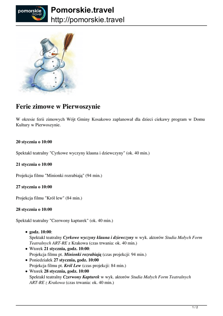 Pomorskie.travel http://pomorskie.travel Ferie zimowe w Pierwoszynie W okresie ferii zimowych Wójt Gminy Kosakowo zaplanował dla dzieci ciekawy program w Domu Kultury w Pierwoszynie. 20 stycznia o 10:00 Spektakl teatralny "Cyrkowe wyczyny klauna i dziewczyny" (ok. 40 min.) 21 stycznia o 10:00 Projekcja filmu "Minionki rozrabiają" (94 min.) 27 stycznia o 10:00 Projekcja filmu "Król lew" (84 min.) 28 stycznia o 10:00 Spektakl teatralny "Czerwony kapturek" (ok. 40 min.) godz. 10:00: Spektakl teatralny Cyrkowe wyczyny klauna i dziewczyny w wyk. aktorów Studia Małych Form Teatralnych ART-RE z Krakowa (czas trwania: ok. 40 min.) Wtorek 21 stycznia, godz. 10:00: Projekcja filmu pt. Minionki rozrabiają (czas projekcji: 94 min.) Poniedziałek 27 stycznia, godz. 10:00 Projekcja filmu pt. Król Lew (czas projekcji: 84 min.) Wtorek 28 stycznia, godz. 10:00 Spektakl teatralny Czerwony Kapturek w wyk. aktorów Studia Małych Form Teatralnych ART-RE z Krakowa (czas trwania: ok. 40 min.) 1/2 Pomorskie.travel http://pomorskie.travel - See more at: http://www.kosakowo.pl/strona/?q=node/1432#sthash.wMGQ5IZp.dpuf Wstęp na wydarzenia jest bezpłatny. godz. 10:00: Spektakl teatralny Cyrkowe wyczyny klauna i dziewczyny w wyk. aktorów Studia Małych Form Teatralnych ART-RE z Krakowa (czas trwania: ok. 40 min.) Wtorek 21 stycznia, godz. 10:00: Projekcja filmu pt. Minionki rozrabiają (czas projekcji: 94 min.) Poniedziałek 27 stycznia, godz. 10:00 Projekcja filmu pt. Król Lew (czas projekcji: 84 min.) Wtorek 28 stycznia, godz. 10:00 Spektakl teatralny Czerwony Kapturek w wyk. aktorów Studia Małych Form Teatralnych ART-RE z Krakowa (czas trwania: ok. 40 min.) - See more at: http://www.kosakowo.pl/strona/?q=node/1432#sthash.wMGQ5IZp.dpuf Marta Balicka 2/2 Powered by TCPDF (www.tcpdf.org)