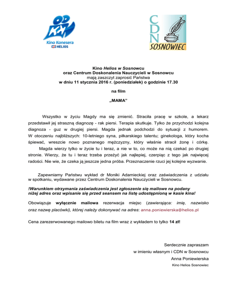 Kino Helios w Sosnowcu oraz Centrum Doskonalenia Nauczycieli w Sosnowcu mają zaszczyt zaprosić Państwa w dniu 11 stycznia 2016 r. (poniedziałek) o godzinie 17.30 na film „MAMA” Wszystko w życiu Magdy ma się zmienić. Straciła pracę w szkole, a lekarz przedstawił jej straszną diagnozę - rak piersi. Terapia skutkuje. Tylko że przychodzi kolejna diagnoza - guz w drugiej piersi. Magda jednak podchodzi do sytuacji z humorem. W otoczeniu najbliższych: 10-letniego syna, piłkarskiego talentu; ginekologa, który kocha śpiewać, wreszcie nowo poznanego mężczyzny, który właśnie stracił żonę i córkę. Magda wierzy tylko w życie tu i teraz, a nie w to, co może na nią czekać po drugiej stronie. Wierzy, że tu i teraz trzeba przeżyć jak najlepiej, czerpiąc z tego jak najwięcej radości. Nie wie, że czeka ją jeszcze jedna próba. Przeznaczenie rzuci jej kolejne wyzwanie. Zapewniamy Państwu wykład dr Moniki Adamieckiej oraz zaświadczenia z udziału w spotkaniu, wydawane przez Centrum Doskonalenia Nauczycieli w Sosnowcu. !Warunkiem otrzymania zaświadczenia jest zgłoszenie się mailowe na podany niżej adres oraz wpisanie się przed seansem na listę udostępnioną w kasie kina! Obowiązuje wyłącznie mailowa rezerwacja miejsc (zawierająca: imię, nazwisko oraz nazwę placówki), której należy dokonywać na adres: [email protected] Cena zarezerwowanego mailowo biletu na film wraz z wykładem to tylko 14 zł! Serdecznie zapraszam w imieniu własnym i CDN w Sosnowcu Anna Poniewierska Kino Helios Sosnowiec