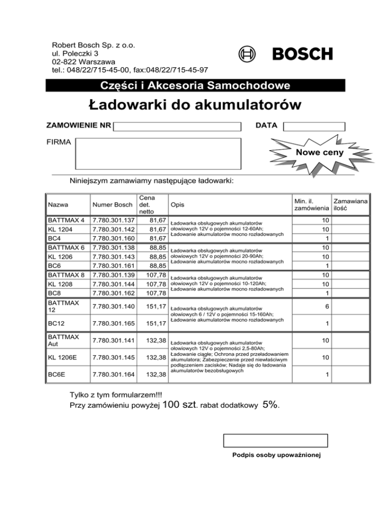 Robert Bosch Sp. z o.o. ul. Poleczki 3 02-822 Warszawa tel.: 048/22/715-45-00, fax:048/22/715-45-97 Części i Akcesoria Samochodowe Ładowarki do akumulatorów ZAMOWIENIE NR DATA FIRMA Nowe ceny Niniejszym zamawiamy następujące ładowarki: BATTMAX 4 Cena Opis det. netto 7.780.301.137 81,67 Ładowarka obsługowych akumulatorów KL 1204 7.780.301.142 81,67 BC4 7.780.301.160 81,67 BATTMAX 6 7.780.301.138 88,85 KL 1206 7.780.301.143 88,85 BC6 7.780.301.161 88,85 BATTMAX 8 7.780.301.139 107,78 KL 1208 7.780.301.144 107,78 BC8 7.780.301.162 107,78 BATTMAX 12 7.780.301.140 151,17 BC12 7.780.301.165 151,17 BATTMAX Aut 7.780.301.141 132,38 KL 1206E 7.780.301.145 132,38 BC6E 7.780.301.164 132,38 Nazwa Numer Bosch Min. il. Zamawiana zamówienia ilość ołowiowych 12V o pojemności 12-60Ah; Ładowanie akumulatorów mocno rozładowanych Ładowarka obsługowych akumulatorów ołowiowych 12V o pojemności 20-90Ah; Ładowanie akumulatorów mocno rozładowanych Ładowarka obsługowych akumulatorów ołowiowych 12V o pojemności 10-120Ah; Ładowanie akumulatorów mocno rozładowanych Ładowarka obsługowych akumulatorów ołowiowych 6 / 12V o pojemności 15-160Ah; Ładowanie akumulatorów mocno rozładowanych Ładowarka obsługowych akumulatorów ołowiowych 12V o pojemności 2,5-80Ah; Ładowanie ciągłe; Ochrona przed przeładowaniem akumulatora; Zabezpieczenie przed niewłaściwym podłączeniem zacisków; Nadaje się do ładowania akumulatorów bezobsługowych Tylko z tym formularzem!!! Przy zamówieniu powyżej 100 szt. rabat dodatkowy 5%. Podpis osoby upoważnionej 10 10 1 10 10 1 10 10 1 6 1 10 10 1