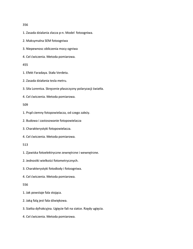 356 1. Zasada dzialania zlacza p-n. Model fotoogniwa. 2. Maksymalna SEM fotoogniwa 3. Niepewnosc obliczenia mocy ogniwa 4. Cel ćwiczenia. Metoda pomiarowa. 455 1. Efekt Faradaya. Stała Verdeta. 2. Zasada działania tesla metru. 3. Siła Lorentza. Skręcenie płaszczyzny polaryzacji światła. 4. Cel ćwiczenia. Metoda pomiarowa. 509 1. Prąd ciemny fotopowielacza, od czego zależy. 2. Budowa i zastosowanie fotopowielacza 3. Charakterystyki fotopowielacza. 4. Cel ćwiczenia. Metoda pomiarowa. 513 1. Zjawiska fotoelektryczne zewnętrzne i wewnętrzne. 2. Jednostki wielkości fotometrycznych. 3. Charakterystyki fotodiody i fotoogniwa. 4. Cel ćwiczenia. Metoda pomiarowa. 556 1. Jak powstaje fala stojąca. 2. Jaką falą jest fala dźwiękowa. 3. Siatka dyfrakcyjna. Ugięcie fali na siatce. Rzędy ugięcia. 4. Cel ćwiczenia. Metoda pomiarowa. 557 1. Polaryzacja światła i jej rodzaje. 2. Dwójłomność światła. 3. Efekt Kerra. 4. Cel ćwiczenia. Metoda pomiarowa.
