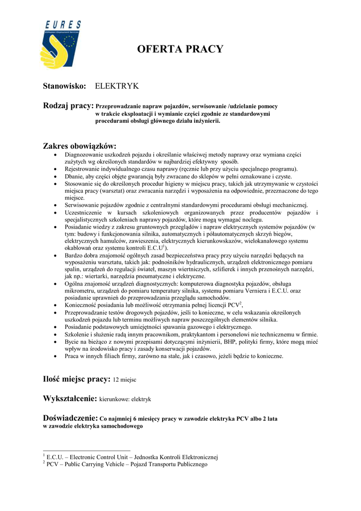 OFERTA PRACY Stanowisko: ELEKTRYK Rodzaj pracy: Przeprowadzanie napraw pojazdów, serwisowanie /udzielanie pomocy w trakcie eksploatacji i wymianie części zgodnie ze standardowymi procedurami obsługi głównego działu inżynierii. Zakres obowiązków: • • • • • • • • • • • • • • • Diagnozowanie uszkodzeń pojazdu i określanie właściwej metody naprawy oraz wymiana części zużytych wg określonych standardów w najbardziej efektywny sposób. Rejestrowanie indywidualnego czasu naprawy (ręcznie lub przy użyciu specjalnego programu). Dbanie, aby części objęte gwarancją były zwracane do sklepów w pełni oznakowane i czyste. Stosowanie się do określonych procedur higieny w miejscu pracy, takich jak utrzymywanie w czystości miejsca pracy (warsztat) oraz zwracania narzędzi i wyposażenia na odpowiednie, przeznaczone do tego miejsce. Serwisowanie pojazdów zgodnie z centralnymi standardowymi procedurami obsługi mechanicznej. Uczestniczenie w kursach szkoleniowych organizowanych przez producentów pojazdów i specjalistycznych szkoleniach naprawy pojazdów, które mogą wymagać noclegu. Posiadanie wiedzy z zakresu gruntownych przeglądów i napraw elektrycznych systemów pojazdów (w tym: budowy i funkcjonowania silnika, automatycznych i półautomatycznych skrzyń biegów, elektrycznych hamulców, zawieszenia, elektrycznych kierunkowskazów, wielokanałowego systemu okablowań oraz systemu kontroli E.C.U1). Bardzo dobra znajomość ogólnych zasad bezpieczeństwa pracy przy użyciu narzędzi będących na wyposażeniu warsztatu, takich jak: podnośników hydraulicznych, urządzeń elektronicznego pomiaru spalin, urządzeń do regulacji świateł, maszyn wiertniczych, szlifierek i innych przenośnych narzędzi, jak np.: wiertarki, narzędzia pneumatyczne i elektryczne. Ogólna znajomość urządzeń diagnostycznych: komputerowa diagnostyka pojazdów, obsługa mikrometru, urządzeń do pomiaru temperatury silnika, systemu pomiaru Verniera i E.C.U. oraz posiadanie uprawnień do przeprowadzania przeglądu samochodów. Konieczność posiadania lub możliwość otrzymania pełnej licencji PCV2, Przeprowadzanie testów drogowych pojazdów, jeśli to konieczne, w celu wskazania określonych uszkodzeń pojazdu lub terminu możliwych napraw poszczególnych elementów silnika. Posiadanie podstawowych umiejętności spawania gazowego i elektrycznego. Szkolenie i służenie radą innym pracownikom, praktykantom i personelowi nie technicznemu w firmie. Bycie na bieżąco z nowymi przepisami dotyczącymi inżynierii, BHP, polityki firmy, które mogą mieć wpływ na środowisko pracy i zasady konserwacji pojazdów. Praca w innych filiach firmy, zarówno na stałe, jak i czasowo, jeżeli będzie to konieczne. Ilość miejsc pracy: 12 miejsc Wykształcenie: kierunkowe: elektryk Doświadczenie: Co najmniej 6 miesięcy pracy w zawodzie elektryka PCV albo 2 lata w zawodzie elektryka samochodowego 1 2 E.C.U. – Electronic Control Unit – Jednostka Kontroli Elektronicznej PCV – Public Carrying Vehicle – Pojazd Transportu Publicznego Wynagrodzenie brutto: średnio 20 000 funtów szterlingów brutto rocznie (istnieje możliwość pracy w nadgodzinach). Znajomość języka: nie jest konieczna, ale mile widziana znajomość języka angielskiego na poziomie co najmniej podstawowym Prawo jazdy: wymagane, oraz posiadanie aktualnych uprawnień na wózki widłowe Miejsce pracy: firma transportowa w Wielkiej Brytanii Dodatkowe wymagania: • • • • Gotowość do ciągłego uczenia się i doskonalenia, Orientacja na realizację celów przedsiębiorstwa, Umiejętność pracy zespołowej, Świadomość własnych obowiązków odnośnie zdrowia i bezpieczeństwa pracy na danym stanowisku. Dla kandydatów, którzy zostaną osoby zakwalifikowani, odbędzie się dwumiesięczne szkolenie stacjonarne w Krakowie. Koszty zakwaterowania i wyżywienia pokrywa organizator. Koszty dojazdu do Krakowa pokrywa uczestnik. Szkolenie to obejmuje m.in. naukę języka angielskiego oraz zasad publicznych usług transportowych w Wielkiej Brytanii. Po pozytywnym zakończeniu szkolenia osoby otrzymają od listopada 2004r., pracę w Wielkiej Brytanii. Wypełnione ankiety (pobrane w urzędzie) prosimy składać w formie elektronicznej w Wojewódzkim Urzędzie Pracy w ………., Decyduje kolejność zgłoszeń. Wyboru pracowników zakwalifikowanych na szkolenia do pracy w Anglii dokona pracodawca angielski. Kandydaci powinni legitymować się ważnym paszportem na okres minimum 1 rok. OFERTA WAŻNA DO DNIA 27/08/2004 r.