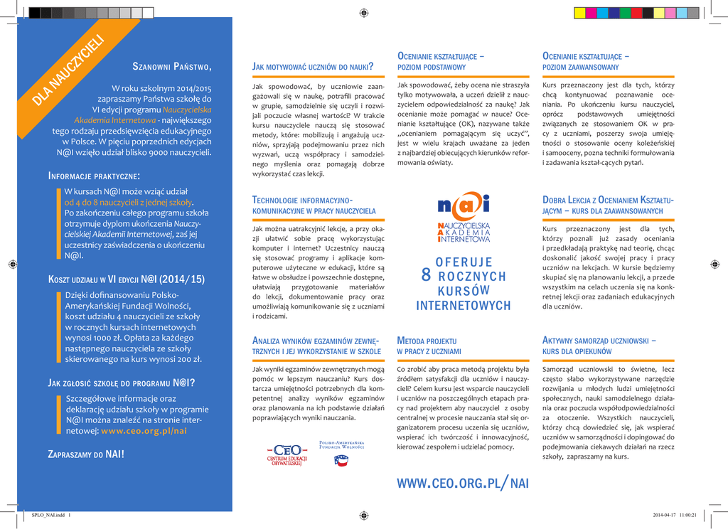 el i zy ci au c S zanowni P ańst wo , Dl an W roku szkolnym 2014/2015 zapraszamy Państwa szkołę do VI edycji programu Nauczycielska Akademia Internetowa - największego tego rodzaju przedsięwzięcia edukacyjnego w Polsce. W pięciu poprzednich edycjach N@I wzięło udział blisko 9000 nauczycieli. I nformacje prakt yczne : W kursach N@I może wziąć udział od 4 do 8 nauczycieli z jednej szkoły. Po zakończeniu całego programu szkoła otrzymuje dyplom ukończenia Nauczycielskiej Akademii Internetowej, zaś jej uczestnicy zaświadczenia o ukończeniu N@I. Koszt udziału w VI edycji N@I (2014/15) Dzięki dofinansowaniu PolskoAmerykańskiej Fundacji Wolności, koszt udziału 4 nauczycieli ze szkoły w rocznych kursach internetowych wynosi 1000 zł. Opłata za każdego następnego nauczyciela ze szkoły skierowanego na kurs wynosi 200 zł. Jak zgłosić szkołę do programu N@I? Szczegółowe informacje oraz deklarację udziału szkoły w programie N@I można znaleźć na stronie internetowej: www.ceo.org.pl/nai Zapraszamy do NAI! Jak motywować uczniów do nauki? Jak spowodować, by uczniowie zaangażowali się w naukę, potrafili pracować w grupie, samodzielnie się uczyli i rozwijali poczucie własnej wartości? W trakcie kursu nauczyciele nauczą się stosować metody, które: mobilizują i angażują uczniów, sprzyjają podejmowaniu przez nich wyzwań, uczą współpracy i samodzielnego myślenia oraz pomagają dobrze wykorzystać czas lekcji. Ocenianie kształtujące – Ocenianie kształtujące – Jak spowodować, żeby ocena nie straszyła tylko motywowała, a uczeń dzielił z nauczycielem odpowiedzialność za naukę? Jak ocenianie może pomagać w nauce? Ocenianie kształtujące (OK), nazywane także „ocenianiem pomagającym się uczyć”, jest w wielu krajach uważane za jeden z najbardziej obiecujących kierunków reformowania oświaty. Kurs przeznaczony jest dla tych, którzy chcą kontynuować poznawanie oceniania. Po ukończeniu kursu nauczyciel, oprócz podstawowych umiejętności związanych ze stosowaniem OK w pracy z uczniami, poszerzy swoja umiejętności o stosowanie oceny koleżeńskiej i samooceny, pozna techniki formułowania i zadawania kształ-cących pytań. poziom podstawowy poziom zaawansowany Technologie informacyjno- Dobra Lekcja z Ocenianiem Kształtującym – kurs dla zaawansowanych Jak można uatrakcyjnić lekcje, a przy okazji ułatwić sobie pracę wykorzystując komputer i internet? Uczestnicy nauczą się stosować programy i aplikacje komputerowe użyteczne w edukacji, które są łatwe w obsłudze i powszechnie dostępne, ułatwiają przygotowanie materiałów do lekcji, dokumentowanie pracy oraz umożliwiają komunikowanie się z uczniami i rodzicami. Kurs przeznaczony jest dla tych, którzy poznali już zasady oceniania i przedkładają praktykę nad teorię, chcąc doskonalić jakość swojej pracy i pracy uczniów na lekcjach. W kursie będziemy skupiać się na planowaniu lekcji, a przede wszystkim na celach uczenia się na konkretnej lekcji oraz zadaniach edukacyjnych dla uczniów. komunikacyjne w pracy nauczyciela oferuje 8 rocznych kursó w internetowych Analiza wyników egzaminów zewnę- Metoda projektu Aktywny samorząd uczniowski – Jak wyniki egzaminów zewnętrznych mogą pomóc w lepszym nauczaniu? Kurs dostarcza umiejętności potrzebnych dla kompetentnej analizy wyników egzaminów oraz planowania na ich podstawie działań poprawiających wyniki nauczania. Co zrobić aby praca metodą projektu była źródłem satysfakcji dla uczniów i nauczycieli? Celem kursu jest wsparcie nauczycieli i uczniów na poszczególnych etapach pracy nad projektem aby nauczyciel z osoby centralnej w procesie nauczania stał się organizatorem procesu uczenia się uczniów, wspierać ich twórczość i innowacyjność, kierować zespołem i udzielać pomocy. Samorząd uczniowski to świetne, lecz często słabo wykorzystywane narzędzie rozwijania u młodych ludzi umiejętności społecznych, nauki samodzielnego działania oraz poczucia współodpowiedzialności za otoczenie. Wszystkich nauczycieli, którzy chcą dowiedzieć się, jak wspierać uczniów w samorządności i dopingować do podejmowania ciekawych działań na rzecz szkoły, zapraszamy na kurs. trznych i jej wykorzystanie w szkole w pracy z uczniami kurs dla opiekunów www.ceo.org.pl/nai SPLO_NAI.indd 1 2014-04-17 11:00:21 t ek yr aD Dl Zapraszamy na a or podyplomowe studia dla dyrektorów szkół ceoce Studia Podyplomowe Liderów Oświaty to dwuletnie studia dla dyrektorów i wicedyrektorów szkół, którzy poprzez rozwój własny i pracę z radą pedagogiczną, chcą poprawić jakość pracy swojej szkoły. Proponowane przez nas studia to: wykłady, seminaria, warsztaty, zajęcia praktyczne i dzielenie się swoimi doświadczeniami przez uczestników. Ważnym elementem studiów jest planowanie zmiany, wpływającej na jakość nauczania i uczenia się uczniów, którą dyrektor wprowadza w swojej szkole. Studia prowadzone są od 2007 roku przez Centrum Edukacji Obywatelskiej, Collegium Civitas, Polsko-Amerykańską Fundacje Wolności i Ogólnopolskie Stowarzyszenie Kadry Kierowniczej Oświaty. SPLO_NAI.indd 2 S tudia Podyplomowe Liderów O świat y sprawią, że: • Staniesz się szkolnym liderem nauczania. • Zostaniesz liderem rozwoju jakościowego szkoły. • Poznasz zasady strategicznego zarządzania. • Zaprojektujesz w szkole zmianę dotycząca uczenia się i nauczania. Zapewniamy doskonałą kadrę: • Uznanych polskich ekspertów z dziedziny edukacji i zarządzania. • Przedstawicieli MEN. • Wykładowców zagranicznych z London University, uczelni holenderskich, OECD, uniwersytetów amerykańskich w tym z The Annenberg Institute for School Reform i Teachers College Columbia University. Czas trwania i forma zajęć: • 2 lata (4 semestry). • Zjazdy: 5 zjazdów dwudniowych (w Collegium Civitas w Pałacu Kultury i Nauki w Warszawie) oraz 1 lub 2 zjazdy poza W