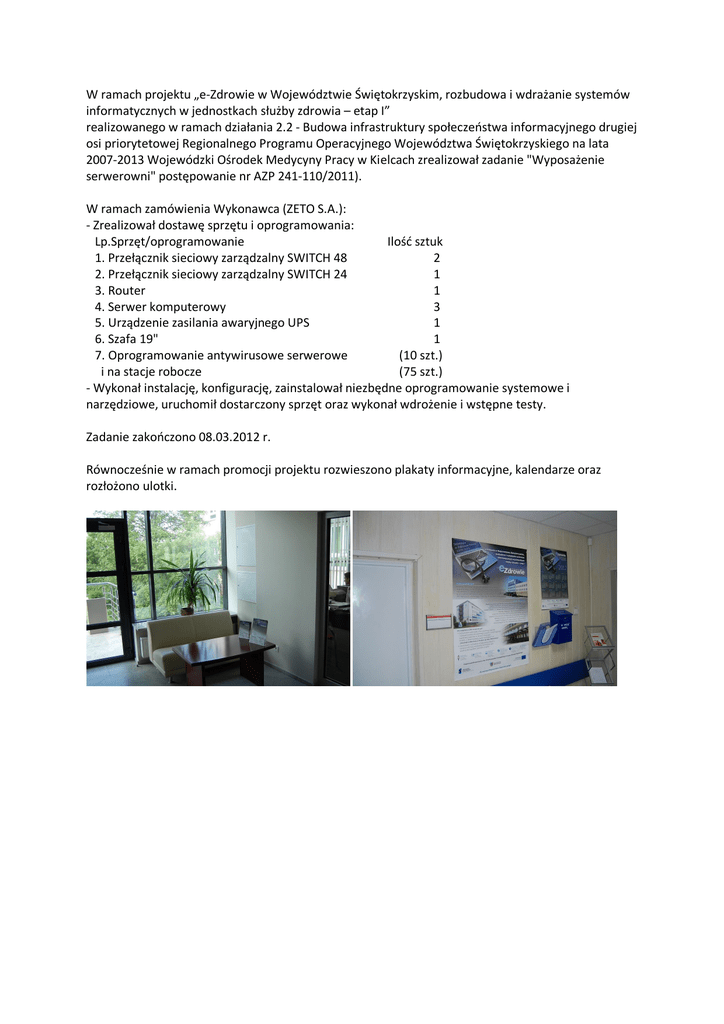 W ramach projektu „e-Zdrowie w Województwie Świętokrzyskim, rozbudowa i wdrażanie systemów informatycznych w jednostkach służby zdrowia – etap I” realizowanego w ramach działania 2.2 - Budowa infrastruktury społeczeństwa informacyjnego drugiej osi priorytetowej Regionalnego Programu Operacyjnego Województwa Świętokrzyskiego na lata 2007-2013 Wojewódzki Ośrodek Medycyny Pracy w Kielcach zrealizował zadanie "Wyposażenie serwerowni" postępowanie nr AZP 241-110/2011). W ramach zamówienia Wykonawca (ZETO S.A.): - Zrealizował dostawę sprzętu i oprogramowania: Lp.Sprzęt/oprogramowanie Ilość sztuk 1. Przełącznik sieciowy zarządzalny SWITCH 48 2 2. Przełącznik sieciowy zarządzalny SWITCH 24 1 3. Router 1 4. Serwer komputerowy 3 5. Urządzenie zasilania awaryjnego UPS 1 6. Szafa 19" 1 7. Oprogramowanie antywirusowe serwerowe (10 szt.) i na stacje robocze (75 szt.) - Wykonał instalację, konfigurację, zainstalował niezbędne oprogramowanie systemowe i narzędziowe, uruchomił dostarczony sprzęt oraz wykonał wdrożenie i wstępne testy. Zadanie zakończono 08.03.2012 r. Równocześnie w ramach promocji projektu rozwieszono plakaty informacyjne, kalendarze oraz rozłożono ulotki.