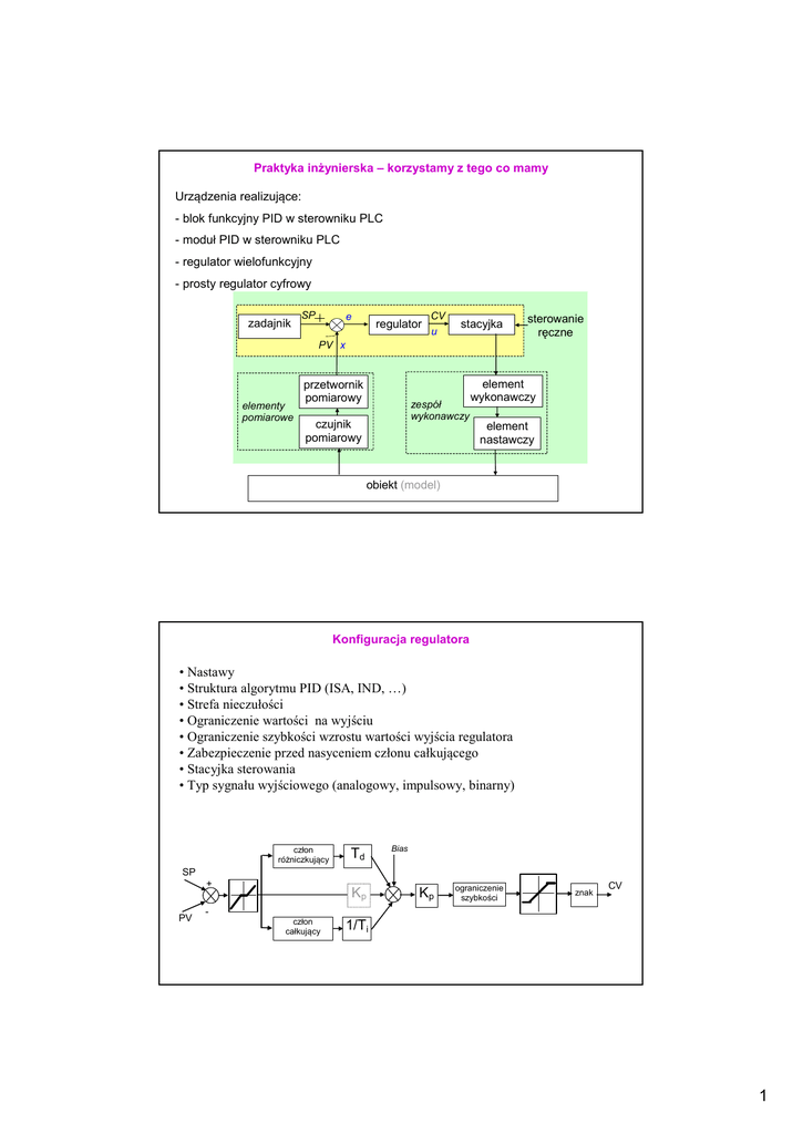 Praktyka inżynierska – korzystamy z tego co mamy Urządzenia realizujące: - blok funkcyjny PID w sterowniku PLC - moduł PID w sterowniku PLC - regulator wielofunkcyjny - prosty regulator cyfrowy zadajnik SP e regulator CV u stacyjka sterowanie ręczne PV x elementy pomiarowe przetwornik pomiarowy zespół wykonawczy czujnik pomiarowy element wykonawczy element nastawczy obiekt (model) Konfiguracja regulatora • Nastawy • Struktura algorytmu PID (ISA, IND, …) • Strefa nieczułości • Ograniczenie wartości na wyjściu • Ograniczenie szybkości wzrostu wartości wyjścia regulatora • Zabezpieczenie przed nasyceniem członu całkującego • Stacyjka sterowania • Typ sygnału wyjściowego (analogowy, impulsowy, binarny) człon różniczkujący Td Bias SP + PV Kp Kp ograniczenie szybkości znak CV człon całkujący 1/Ti 1 Funkcje regulatora • Algorytm PID PID-IND (INDependent algorithm) PID-ISA (Ideal Standard Algorithm) • Auto-tuning (pre-tuning) • Adaptacja (self-tuning, …) • Komunikacja • inne (sterowanie ręczne, lokalna wizualizacja i archiwacja, ...) Auto-tuning (samonastrajanie) • 1metoda ZiegleraZieglera-Nicholsa (odpowiedzi skokowej) • identyfikacja modelu (przy otwartej pętli) • nastawy wg tabel dla różnych klas obiektów K0e − sT0 Ts + 1 h(t) Regulator Kp Ti PI 0,9T K 0T0 3,33T0 PID 1,2T K 0T0 2T0 Td K0 t 0,5T0 T0 T Uwagi: • Esperyment Zieglera-Nicholsa (1942) zautomatyzowany w latach '70 (+) prosty eksperyment (-) identyfikacja modelu obiektu przy rozwartej pętli regulacji • PID-ISA • A jeśli To≈0? np.: https://engineering.purdue.edu/~zak/ECE680/Ziegler-Nichls_1942.pdf 2 Auto-tuning (samonastrajanie) Ziegler-Nichols kp P TC h(t) Td 1/a PI 0.9/a 3τ PID 1.2/a 2τ t Chien, Hrones, Reswick Przereg. 0% kp TC P 0.3/a PI 0.35/a 1.2T PID 0.6/a T K0 τ τ/2 a 20% kp Td TC T Td 0.7/a τ/2 0.6/a 1.2T 0.95/a 1.4T 0.47τ Cohen - Coon Reg. P PI kp TC 1 0,35τ 1 + a 1 − τ 0.9 0.92τ 1 + a 1 − τ PD 1.24 0.13τ 1 + a 1−τ PID 1.35 0.18τ 1 + a 1 −τ Td 3.3 − 3.0τ τ 1 + 1.2τ 0.27 − 0.36τ τ 1 − 0.87τ 2.5 − 3.0τ τ 1 − 0.39τ 0.37 − 0.37τ τ 1 − 0.81τ τ= τ τ +T Auto-tuning - SIPART I. II. III. IV. V. VI. Sprawdzenie stałości PV przez okres 0,1 tU Wmuszenie skokowe CV i zapis odpowiedzi skokowej Zbadanie warunków wiarygodności eksperymentu Obliczenie parametrów modelu Strejca G(s)=k/(Ts+1)n (dla 1<=n<=8) Wyliczenie nastaw i sugestia algorytmu (PI lub PID) Wybór algorytmu i akceptacja nastaw przez operatora 3 Auto-tuning (samonastrajanie) • 2 metoda ZiegleraZieglera-Nicholsa (metoda cyklu granicznego) • nastaw działanie proporcjonalne • zwiększaj wzmocnienie i odczytaj okres oscylacji • nastawy wg wzorów dla różnych regulatorów Ti Regulator kp P 0,5k pkryt PI 0,45k pkryt 0,85Tosc 0,6k pkryt 0,5Tosc PID Td 0,12Tosc Modyfikacja Pessena: kp=0,2kpkryt; Ti=0,33Tosc; Td=0,5Tosc Modyfikacja Hanssena-Offereinsa (eliminacja pomiaru Tosc): PI: PID: • ustaw tylko działanie P (Ti=max) • zwiększaj kp do granicy stabilności; • odczytaj kpkryt → ustaw kp=0,45 kpkryt • zmniejszaj Ti do granicy stabilności; • odczytaj Tikryt → ustaw Ti=3Tikryt • dobierz nastawy dla działania PI • zwiększaj Td (do Tdmax) do maksymalnego tłumienia • ustaw Td=1/3Tdmax oraz Ti=4,5Tdmax • zmniejszaj kp do uzyskania pożądanego tłumienia np.: http://www.ceasiamag.com/article-2255-autotuningcontrolusingzieglernichols-Asia.html Auto-tuning (samonastrajanie) • 2 metoda Zieglera-Nicholsa – modyfikacja Äströma-Hägglunda • przełącz na sterowanie dwupołożeniowe • odczytaj amplitudę i okres oscylacji – Aosc, Tosc (ωosc = 2π / Tosc ) • nastawy wg uproszczonych wzorów Zieglera-Nicholsa • dla małych opóźnień kp=0,5 Ti=4/ωosc • dla dużych opóźnień: kp=0,25 Ti=1,6/ωosc Karl Äström, Tore Hägglund, 1984, Institute of Technology Lund (Szwecja) + bez rozwierania pętli - konieczność wprowadzania układu w stan oscylacji np.: http://www.ceasiamag.com/article-2255-autotuningcontrolusingzieglernichols-Asia.html 4 Adaptacja Układ z programowanymi zmianami parametrów regulatora Układy z identyfikacją modelu z pośrednią z bezpośrednią 5 Self-tuning - algorytm adaptacyjny EXACT (FOXBORO) I. II. III. IV. V. Oczekiwanie na istotne zakłócenie tzn. o amplitudzie większej niż trzykrotny poziom szumów – start algorytmu EXACT; Rejestruje trzy kolejne amplitudy E1, E2, E3 oraz okres T. Wyznacza przeregulowanie o=E1/E2 oraz tłumienie d=(E2+E3)/(E1+E2) Porównuje o, d z zadanymi wartościami o*, d* W razie konieczności koryguje nastawy • Auto-tuning (pre-tuning) • dobór nastaw przed uruchomieniem • zatrzymanie procesu, eksperyment, zatwierdzenie nastaw • Adaptacja (self-tuning, …) • korekcja nastaw w trakcie pracy • zmiana punktu pracy (układy nieliniowe) • zmiana parametrów (niestacjonarność, zużycie, ...) 6
