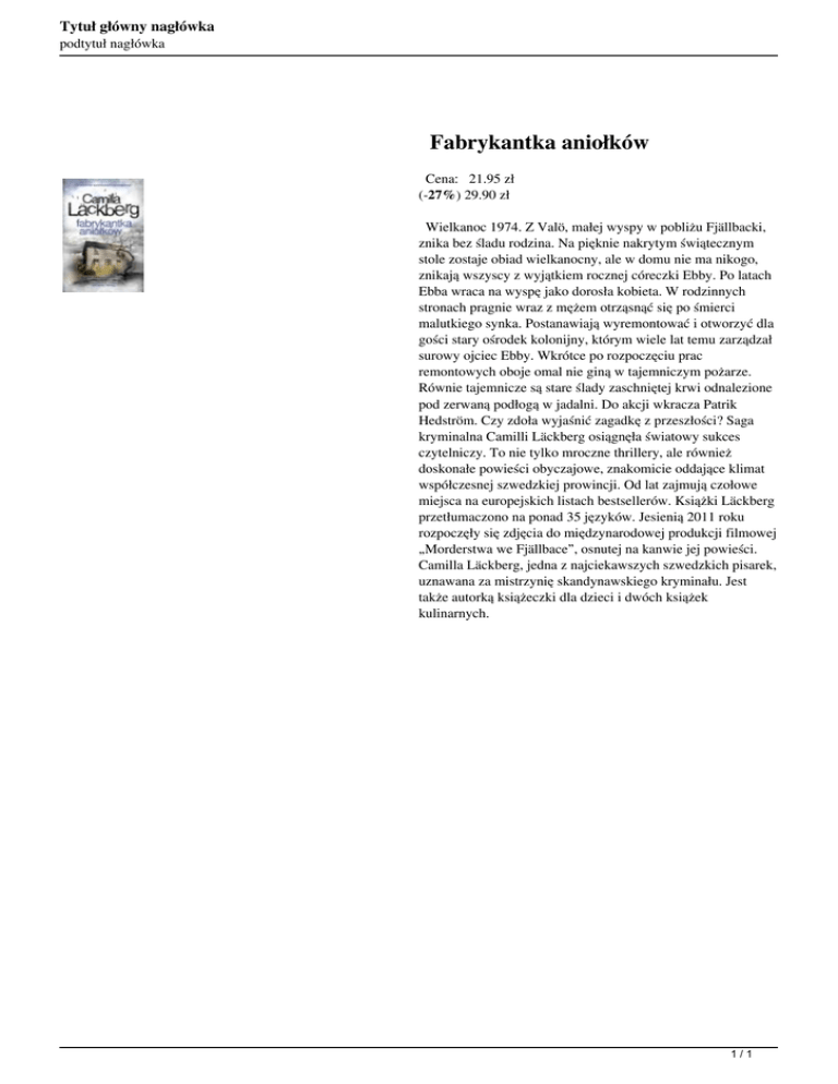 Tytuł główny nagłówka podtytuł nagłówka Fabrykantka aniołków Cena: 21.95 zł (-27%) 29.90 zł Wielkanoc 1974. Z Valö, małej wyspy w pobliżu Fjällbacki, znika bez śladu rodzina. Na pięknie nakrytym świątecznym stole zostaje obiad wielkanocny, ale w domu nie ma nikogo, znikają wszyscy z wyjątkiem rocznej córeczki Ebby. Po latach Ebba wraca na wyspę jako dorosła kobieta. W rodzinnych stronach pragnie wraz z mężem otrząsnąć się po śmierci malutkiego synka. Postanawiają wyremontować i otworzyć dla gości stary ośrodek kolonijny, którym wiele lat temu zarządzał surowy ojciec Ebby. Wkrótce po rozpoczęciu prac remontowych oboje omal nie giną w tajemniczym pożarze. Równie tajemnicze są stare ślady zaschniętej krwi odnalezione pod zerwaną podłogą w jadalni. Do akcji wkracza Patrik Hedström. Czy zdoła wyjaśnić zagadkę z przeszłości? Saga kryminalna Camilli Läckberg osiągnęła światowy sukces czytelniczy. To nie tylko mroczne thrillery, ale również doskonałe powieści obyczajowe, znakomicie oddające klimat współczesnej szwedzkiej prowincji. Od lat zajmują czołowe miejsca na europejskich listach bestsellerów. Książki Läckberg przetłumaczono na ponad 35 języków. Jesienią 2011 roku rozpoczęły się zdjęcia do międzynarodowej produkcji filmowej „Morderstwa we Fjällbace”, osnutej na kanwie jej powieści. Camilla Läckberg, jedna z najciekawszych szwedzkich pisarek, uznawana za mistrzynię skandynawskiego kryminału. Jest także autorką książeczki dla dzieci i dwóch książek kulinarnych. 1/1 Powered by TCPDF (www.tcpdf.org)