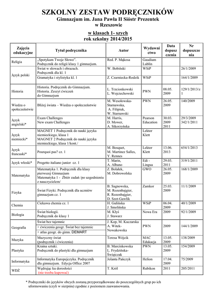 SZKOLNY ZESTAW PODRĘCZNIKÓW Gimnazjum im. Jana Pawła II Sióstr Prezentek w Rzeszowie w klasach 1- szych rok szkolny 2014/2015 Zajęcia edukacyjne Religia Język polski Tytuł podręcznika „Spotykam Twoje Słowo”. Podręcznik do religii klasy 1 gimnazjum. Świat w słowach i obrazach. Podręcznik dla kl. 1 Gramatyka i stylistyka kl. 1 Historia. Podręcznik do Gimnazjum. Historia. Zeszyt ćwiczeń do Gimnazjum Historia Wiedza o społeczeństwie Bliżej świata – Wiedza o społeczeństwie Język angielski* Exam Challenges New exam Challenges Język niemiecki* MAGNET 1 Podręcznik do nauki języka niemieckiego, klasa 1 MAGNET 2 Podręcznik do nauki języka niemieckiego, klasa 1/kont./ Język francuski* Pourquoi pas? cz. 1 Język włoski* Progetto italiano junior cz. 1 Matematyka Matematyka 1. Podręcznik dla klasy pierwszej Gimnazjum Matematyka 1 - Zbiór zadań /po uzgodnieniu z nauczycielem/ Fizyka Świat Fizyki. Podręcznik dla uczniów gimnazjum cz. 1 Ciekawa chemia cz. 1 Chemia Autor Red. P. Mąkosa W. Bobiński L. Trzcionkowski L. Wojciechowski M. WesołowskaStarnawska, A. Filipiuk, W. Starnawski M. Harris, D. Mower, A. Sikorzyńska 08.05. 2009 129/1/2013/z 1 PWN 26.05. 2009 140/2009 Pearson Education 30.03. 2009 2011 29/3/2009 342/1/2011 PWN 13.06. 2013 654/1/2013 Edi Lingua GWO 29.03. 2011 26.05. 2009 319/1/2011 B. Sagnowska, M. Rozenbajgier, R. Rozenbajgier, D. Szot-Gawlik H. Gulińska J. Smolińska M. Kłyś J. Stawarz Zamkor 25.03. 2009 11/1/2009 WSiP 40/1/2009 Nowa Era 06.04. 2009 2009 PWN 2009 144/1/2009 MAC Edukacja PWN 13.05. 2009 13.05. 2009 138/2009 Helion 17.04. 2009 2011 75/2009 Geografia Muzyczny świat (podręcznik i ćwiczenia) Kraina sztuki. Podręcznik do plastyki dla gimnazjum Teresa Wójcik WDŻ 164/1/2009 Lektor Klett J. Kop, M. Kuczarska A. WitekNowakowska Informatyka Europejczyka. Podręcznik dla gimnazjum. Edycja Office 2007 Wędrując ku dorosłości (nie trzeba kupować) 26/1/2009 M. Bosquet, M. Martinez Salles, Y. Rennes T. Marin, A. Albano Z. Bolałek, M. Dobrowolska Świat bez tajemnic + ćwiczenia geogr. Świat bez tajemnic + atlas geogr. do gimn. DEMART Informatyka Gaudium Lublin WSiP Nr dopuszcze nia Lektor Klett Świat biologii. Podręcznik do klasy 1 Plastyka Data dopusz czenia Z. Czarniecka-Rodzik WSiP Biologia Muzyka Wydawni ctwo B. Marcinkowska L. FrydzińskaŚwiątczak Jolanta Pańczyk T. Król Rubikon * Podręczniki do języków obcych zostaną przyporządkowane do poszczególnych grup po ich uformowaniu (czyli w sierpniu) zgodnie z poziomem zaawansowania. 168/1/2009 92/1/2009 154/2009 205/2011 SZKOLNY ZESTAW PODRĘCZNIKÓW Gimnazjum im. Jana Pawła II Sióstr Prezentek w Rzeszowie w klasach 2- ich rok szkolny 2014/2015 Zajęcia edukacyjne Tytuł podręcznika Z Tobą idę przez życie Religia Język polski Świat w słowach i obrazach. Podręcznik dla kl. 2 Gramatyka i stylistyka kl. 2 Historia. Czasy nowożytne. Podręcznik dla Gimnazjum. Klasa 2 Historia Wiedza o społeczeństwie Język angielski Język niemiecki Język francuski Język włoski* Matematyka Fizyka Zeszyt ćwiczeń na mapach konturowych. Klasa 1 – 3 Historia. Czasy nowożytne. Zeszyt ćwiczeń dla Gimnazjum. Klasa 2 Bliżej świata –Wiedza o społeczeństwie Data dopusz czenia Nr dopuszcze nia Gaudium 2013 Lublin WSiP 26/2/2009 Z. CzarnieckaRodzik J. Chachaj J. Drob WSiP 164/2/2009 PWN 2010 PWN 2010 PWN 26.05. 2009 Pearson Education 129/2/2010 W. Chybowski 140/2009 Edi - Lingua Matematyka 2. Podręcznik. T. Marin, A. Albano M. Dobrowolska GWO 30.03. 29/3/2009 2009 342/1/2011 2011 ten podręcznik nie ma numeru 2009 51/1/2009 51/2/2009 05.06. 654/2/2014 2014 03.02. 319/2/2012 2012 2010 168/2/2010 Świat fizyki. Podręcznik cz. 2 B. Sagnowska Zamkor 2010 11/2/2010 H. Gulińska WSiP 40/1/2009 Cambridge Longman LektorKlett LektorKlett „Pourquoi pas” cz.2 Progetto italiano junior cz. 2 M. Kłyś J. Stawarz Świat bez tajemnic, kl.2 J. Kop, + ćwiczenia geogr. Świat bez tajemnic M. Kucharska A. Witek+ atlas geogr. Do gim. DEMART Nowakowska Informatyka Europejczyka. Podręcznik Jolanta Pańczyk dla gimnazjum. Edycja Office 2007 Nowa Era 06.04. 2009 2010 PWN 2009 144/2/2009 Helion 17.04. 2009 75/2009 Wędrując ku dorosłości (nie trzeba kupować) Rubikon 2011 205/2011 Ciekawa chemia. Podręcznik cz. 2 Biologia Świat biologii. Podręcznik do klasy 2 Informatyka Wydawni ctwo ks. red. Paweł Mąkosa W. Bobiński E. Ciosek A. Kowal U. Małek M. WesołowskaStarnawska, A. Filipiuk, Kontynuacja podręcznika z kl. 1 W. Starnawski Exam Challenges M. Harris, New exam Challenges D. Mower, A. Sikorzyńska FC COMPLETE G. Brook Bell, Grover Magnet 2 Magnet 3 (gr. kontyn.) Chemia Geografia Autor 92/2/2010 Zaj. artystyczne WDŻ Teresa Król * Podręczniki do języków obcych zostaną przyporządkowane do poszczególnych grup po ich uformowaniu (czyli w sierpniu) zgodnie z poziomem zaawansowania SZKOLNY ZESTAW PODRĘCZNIKÓW Gimnazjum im. Jana Pawła II Sióstr Prezentek w Rzeszowie w klasach 3- ich rok szkolny 2014/2015 Zajęcia edukacyjne Religia Język polski Historia Tytuł podręcznika Język angielski * Zespół autorów WAM 2006 ks. Zbigniew Marek Zeszyt ćwiczeń E. Ciosek A. Kowal U. Małek R. Czupryk FC COMPLETE Język niemiecki * Kompass 3 Kompass 4 Język francuski* Le Mag cz.3 Język włoski* Progetto italiano junior cz. 3 Matematyka Fizyka Chemia Biologia Geografia Plastyka Zajęcia techniczne Data Wydawnictwo dopuszcze nia „W drodze do Emaus. Jezus prowadzi i zbawia. Podręcznik do religii dla III klasy gimnazjum. Słowa na czasie. Podręcznik do kształcenia literackiego i kulturowego dla klasy trzeciej gimnazjum. Słowa na czasie. Podręcznik do kształcenia językowego z ćwiczeniami. Historia. Wiek XIX . Podręcznik dla gimnazjum kl. 3 Wiedza o kulturze Podręcznik dostępny w wersji elektronicznej. Exam Challenges WOK Autor Nr dopuszczenia NOWA ERA NOWA ERA J. Chachaj J. Drob M. Harris, D. Mower, A. Sikorzyńska G. Brook Bell, Grover A. Sibiga M. Jezierska-Wiejak