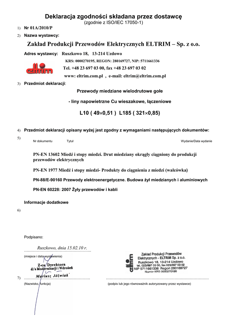 Deklaracja zgodności składana przez dostawcę (zgodnie z ISO/IEC 17050-1) 1) Nr 01A/2010/P 2) Nazwa wystawcy: Zakład Produkcji Przewodów Elektrycznych ELTRIM – Sp. z o.o. Adres wystawcy: Ruszkowo 18, 13-214 Uzdowo KRS: 0000270195, REGON: 280169727, NIP: 5711661336 Tel. +48 23 697 03 00, fax +48 23 697 03 02 www: eltrim.com.pl , e-mail: [email protected] 3) Przedmiot deklaracji: Przewody miedziane wielodrutowe gołe - liny napowietrzne Cu wieszakowe, łączeniowe L10 ( 49× ×0,51 ) L185 ( 321× ×0,85) 4) Przedmiot deklaracji opisany wyżej jest zgodny z wymaganiami następujących dokumentów: 5) Nr dokumentu Tytuł Wydanie/Data wydanie PN-EN 13602 Miedź i stopy miedzi. Drut miedziany okrągły ciągniony do produkcji przewodów elektrycznych PN-EN 1977 Miedź i stopy miedzi- Produkty do ciągnienia z miedzi (walcówka) PN-88/E-90160 Przewody elektroenergetyczne. Budowa żył miedzianych i aluminiowych PN-EN 60228: 2007 Żyły przewodów i kabli Informacje dodatkowe 6) Podpisano: Ruszkowo, dnia 15.02.10 r. …………………………………………….. (miejsce i data wystawienia) 7) ……………………………………………. (Nazwisko, funkcja) ……………………………………………………………………… (podpis lub jego równoważnik autoryzowany przez wystawce)