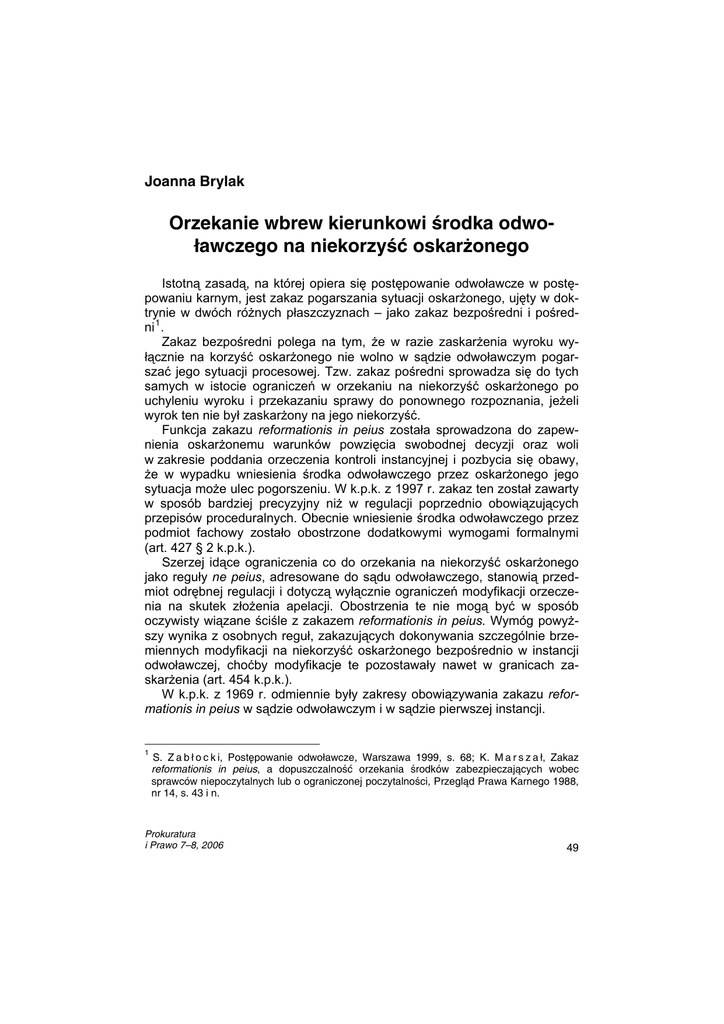 Orzekanie wbrew kierunkowi środka odwoławczego... Joanna Brylak Orzekanie wbrew kierunkowi środka odwoławczego na niekorzyść oskarżonego Istotną zasadą, na której opiera się postępowanie odwoławcze w postępowaniu karnym, jest zakaz pogarszania sytuacji oskarżonego, ujęty w doktrynie w dwóch różnych płaszczyznach – jako zakaz bezpośredni i pośredni 1 . Zakaz bezpośredni polega na tym, że w razie zaskarżenia wyroku wyłącznie na korzyść oskarżonego nie wolno w sądzie odwoławczym pogarszać jego sytuacji procesowej. Tzw. zakaz pośredni sprowadza się do tych samych w istocie ograniczeń w orzekaniu na niekorzyść oskarżonego po uchyleniu wyroku i przekazaniu sprawy do ponownego rozpoznania, jeżeli wyrok ten nie był zaskarżony na jego niekorzyść. Funkcja zakazu reformationis in peius została sprowadzona do zapewnienia oskarżonemu warunków powzięcia swobodnej decyzji oraz woli w zakresie poddania orzeczenia kontroli instancyjnej i pozbycia się obawy, że w wypadku wniesienia środka odwoławczego przez oskarżonego jego sytuacja może ulec pogorszeniu. W k.p.k. z 1997 r. zakaz ten został zawarty w sposób bardziej precyzyjny niż w regulacji poprzednio obowiązujących przepisów proceduralnych. Obecnie wniesienie środka odwoławczego przez podmiot fachowy zostało obostrzone dodatkowymi wymogami formalnymi (art. 427 § 2 k.p.k.). Szerzej idące ograniczenia co do orzekania na niekorzyść oskarżonego jako reguły ne peius, adresowane do sądu odwoławczego, stanowią przedmiot odrębnej regulacji i dotyczą wyłącznie ograniczeń modyfikacji orzeczenia na skutek złożenia apelacji. Obostrzenia te nie mogą być w sposób oczywisty wiązane ściśle z zakazem reformationis in peius. Wymóg powyższy wynika z osobnych reguł, zakazujących dokonywania szczególnie brzemiennych modyfikacji na niekorzyść oskarżonego bezpośrednio w instancji odwoławczej, choćby modyfikacje te pozostawały nawet w granicach zaskarżenia (art. 454 k.p.k.). W k.p.k. z 1969 r. odmiennie były zakresy obowiązywania zakazu reformationis in peius w sądzie odwoławczym i w sądzie pierwszej instancji. 1 S. Z a b ł o c k i, Postępowanie odwoławcze, Warszawa 1999, s. 68; K. M a r s z a ł, Zakaz reformationis in peius, a dopuszczalność orzekania środków zabezpieczających wobec sprawców niepoczytalnych lub o ograniczonej poczytalności, Przegląd Prawa Karnego 1988, nr 14, s. 43 i n. Prokuratura i Prawo 7–8, 2006 49 J. Brylak W sądzie pierwszej instancji zakaz reformationis in peius ograniczał się wyłącznie do wymiaru kary, co nie wykluczało orzekania na niekorzyść oskarżonego w inny sposób, np. w zakresie kwalifikacji prawnej czynu, powództwa adhezyjnego czy kosztów procesu. W k.p.k. z 1997 r. zakres obowiązywania zakazu reformationis in peius w sądzie odwoławczym oraz w sądzie pierwszej instancji orzekającym po uchyleniu wyroku i przekazaniu sprawy do ponownego rozpatrzenia wskutek wniesienia apelacji jest identyczny (art. 434 § 1 i 443 k.p.k.). Wyłączenie możliwości wydania orzeczenia surowszego niż uchylone nie ogranicza się obecnie tylko do niedopuszczalności wymierzenia surowszej kary. Ustawodawca ujednolicił omawiany zakaz zarówno w odniesieniu do postępowania odwoławczego, jak i postępowania po uchyleniu zaskarżonego orzeczenia i przekazaniu sprawy do ponownego rozpoznania. Jeżeli więc uchylone orzeczenie nie było zaskarżone na niekorzyść oskarżonego, to nie ma znaczenia, czy przy ponownym rozpoznaniu sprawy ujawniły się nowe okoliczności obciążające oskarżonego czy nie – orzekanie surowsze w porównaniu z uchylonym orzeczeniem jest niedopuszczalne. Z orzeczeniem niekorzystnym czy też surowszym niż uchylone mamy do czynienia wtedy, gdy orzeczenie zawiera rozstrzygnięcia pogarszające sytuację oskarżonego w stosunku do tej, jaka wynikała z zaskarżonego orzeczenia. Takim orzeczeniem jest każde, z którym wiąże się realne zwiększenie dolegliwości dla oskarżonego w porównaniu z orzeczeniem uchylonym, dlatego ocena surowości orzeczenia powinna być relatywizowana do konkretnego przypadku 2 . Dalsza zmiana dokonana w k.p.k. z 1997 r., w porównaniu z poprzednio obowiązującym stanem prawnym polega na tym, że środek odwoławczy złożony przez podmioty wskazane w art. 427 § 2 k.p.k. musi zawierać zarzuty stawiane rozstrzygnięciu oraz uzasadnienie. W takiej sytuacji sąd związany jest w orzekaniu na niekorzyść oskarżonego nie tylko granicami zaskarżenia, ale dodatkowo zobligowany jest do oceny tego, jakie uchybienia podniesiono w środku odwoławczym. Jeśli natomiast środek odwoławczy wniesiony został na niekorzyść oskarżonego przez inny podmiot uprawniony, to sąd odwoławczy winien rozpoznać go w granicach zaskarżenia, biorąc pod uwagę wszystkie uchybienia wymienione w art. 438 k.p.k. i nie bacząc na to tylko, jakie podstawy odwoławcze wymienione zostały we wniesionym środku. Jeżeli środek został złożony przez podmiot fachowy, sąd odwoławczy jest związany granicami zaskarżenia i może orzec na niekorzyść oskarżonego tylko wówczas, gdy stwierdza istnienie bądź to uchybienia podniesionego 2 A. K a f t a l, System środków odwoławczych w polskim procesie karnym, Warszawa 1972, s. 102. 50 Prokuratura i Prawo 7–8, 2006 Orzekanie wbrew kierunkowi środka odwoławczego... w środku odwoławczym, bądź takiego, które podlega uwzględnieniu z urzędu. Zasadnicza zmiana w systemie wymiaru kar i środków karnych, dokonana w kodeksie karnym z 1997 roku w porównaniu z regulacją z 1969 roku spowodowała, iż wiele poglądów wyrażonych w orzecznictwie Sądu Najwyższego w zakresie odpowiedzi na pytanie, czy poczynienie określonej zmiany przez sąd odwoławczy naruszałoby zakaz reformationis in peius, uległo zdezaktualizowaniu. Obecnie wymaga rozważenia, czy np. zwiększenie wymiaru grzywny w stawkach dziennych z jednoczesnym warunkowym zawieszeniem wy