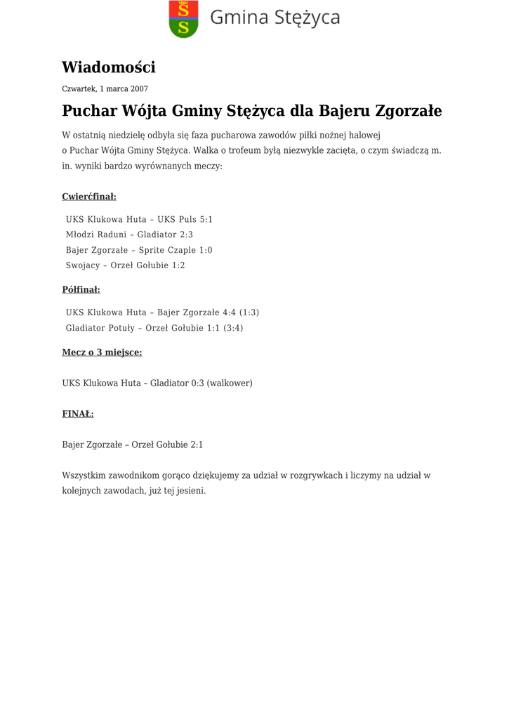 Wiadomości Czwartek, 1 marca 2007 Puchar Wójta Gminy Stężyca dla Bajeru Zgorzałe W ostatnią niedzielę odbyła się faza pucharowa zawodów piłki nożnej halowej o Puchar Wójta Gminy Stężyca. Walka o trofeum byłą niezwykle zacięta, o czym świadczą m. in. wyniki bardzo wyrównanych meczy: Cwierćfinał: UKS Klukowa Huta – UKS Puls 5:1 Młodzi Raduni – Gladiator 2:3 Bajer Zgorzałe – Sprite Czaple 1:0 Swojacy – Orzeł Gołubie 1:2 Półfinał: UKS Klukowa Huta – Bajer Zgorzałe 4:4 (1:3) Gladiator Potuły – Orzeł Gołubie 1:1 (3:4) Mecz o 3 miejsce: UKS Klukowa Huta – Gladiator 0:3 (walkower) FINAŁ: Bajer Zgorzałe – Orzeł Gołubie 2:1 Wszystkim zawodnikom gorąco dziękujemy za udział w rozgrywkach i liczymy na udział w kolejnych zawodach, już tej jesieni.