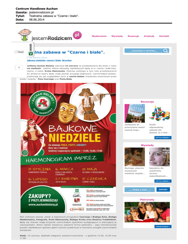 Centrum Handlowe Auchan Gazeta: jestemrodzicem.pl Tytu³: Teatralna zabawa w "Czarne i bia³e". Data: 08.06.2014 Wydarzenia Wywiady Teatralna zabawa w "Czarne i białe". Tweet Recenzje Artykuły Kontakt __wyszukaj w serwisie__ Dodano: 08 czerwca 2014r. Tagi: bajkowe niedziele, czarne i białe, Wrocław Park Handlowy Auchan Bielany zaprasza 15 czerwca na przedstawienie dla dzieci z cyklu 0 "Bajkowe niedziele". Gośćmi, którzy odwiedzą najmłodszych będą m.in. czarne i białe koty, niedźwiedzie, a także Sroka Kłamczucha. Podczas szóstego w tym roku przedstawienia najmłodsi amatorzy teatru będą mogli poznać przygody bajkowych, czarno-białych postaci. Dzieci przekonają się jak wygląd ałoby życie w czarno-białym miasteczku stworzonym przez poetę i malarkę - Pana Czarnego oraz Panią Białą. Recenzje Zachęcamy do przeczytania dwóch recenzji ksią ż... Wybór odpowiedniej zabawki dla dziecka, to w dzis... CZYTAJ WIĘCEJ > Wywiady Słuchając utworów muzycznych Specjalnie dla czytelników wokalisty zespołu... serwisu JestemRodzicem... CZYTAJ WIĘCEJ > ___Podaj e-mail___ ZAPISZ! Patronaty Mali widzowie wezmą udział w bajkowych przygodach Czarnego i Białego Kota, Białego Niedźwiedzia, Fotografa, Sroki Kłamczuchy, Białego Kruka oraz Rodziny Tralalińskich. Będą się również mogły przyjrzeć czarno-białym zjawiskom występującym w otaczającej je rzeczywistości. Wiele radości dostarczy zapewne forma spektaklu - jego interaktywność pozwoli najmłodszym gościom galerii czynnie uczestniczyć w tworzeniu przygód czarno-białych bohaterów. Kiedy: 15 czerwca. Spektakl odegrany zostanie trzykrotnie - o godzinie 13.00, 15.00 oraz 17.00. POKAŻ W IĘCEJ > Centrum Handlowe Auchan Gazeta: jestemrodzicem.pl Tytu³: Teatralna zabawa w "Czarne i bia³e". Data: 08.06.2014 Gdzie: Auchan Bielany, Francuska 6, 55-040 Bielany Wrocławskie Cena: Bezpłatnie Autor: Redakcja Poinformujemy Cię o kolejnych treściach. JestemRodzicem.pl Serwis dla rodziców, ___Podaj e-mail___ ZAPISZ! wydarzenia, wywiady, recenzje Poinformuj nas o ciekawym artykule! | + < Śc i eżka edukacyjna dla dzieci - "Zielony Spacer z rozpoznawaniem roś lin jadalnych" Partnerzy serwisu: