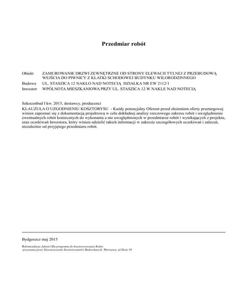 Przedmiar robót Obiekt Budowa Inwestor ZAMUROWANIE DRZWI ZEWNĘTRZNE OD STRONY ELEWACJI TYLNEJ Z PRZEBUDOWĄ WEJŚCIA DO PIWNICY Z KLATKI SCHODOWEJ BUDYNKU WILORODZINNEGO UL. STASZICA 12 NAKŁO NAD NOTECIĄ DZIAŁKA NR EW 2112/1 WPÓLNOTA MIESZKANIOWA PRZY UL. STASZICA 12 W NAKLE NAD NOTECIĄ Sekocenbud I kw. 2015, dostawcy, producenci KLAUZULA O UZGODNIENIU KOSZTORYSU - Każdy potencjalny Oferent przed złożeniem oferty przetargowej winien zapoznać się z dokumentacją projektową w celu dokładnej analizy rzeczowego zakresu robót i uwzględnienie ewentualnych robót koniecznych do wykonania a nie uwzględnionych w przedmiarze robót i wynikających z projektu, oraz oczekiwań Inwestora, który winien udzielić takich informacji w zakresie szczegółowych oczekiwań i zaleceń, niezależnie od przyjętego przedmiaru robót. Bydgoszcz maj 2015 " ekomendacja Jakości"dla programu do kosztorysowania Rodos R przyznana przez Stowarzyszenie Kosztorysantów Budowlanych, Warszawa, ul.Hoża 50 Rodos 6.8.12.8 [11088] Strona 2/6 Tabela elementów ZAMUROWANIE DRZWI ZEWNĘTRZNE OD STRONY ELEWACJI TYLNEJ Z PRZEBUDOWĄ WEJŚCIA DO PIWNICY Z KLATKI SCHODOWEJ BUDYNKU WILORODZINNEGO Nr Opis robót 1. Roboty rozbiórkowe i odtworzeniowe Rodos 6.8.12.8 [11088] Strona 3/6 Przdmiar ZAMUROWANIE DRZWI ZEWNĘTRZNE OD STRONY ELEWACJI TYLNEJ Z PRZEBUDOWĄ WEJŚCIA DO PIWNICY Z KLATKI SCHODOWEJ BUDYNKU WILORODZINNEGO Nr Podstawa Opis robót Jm Ilość 1. Roboty rozbiórkowe i odtworzeniowe 1 KNR 4-01 Rozebranie ścianek grubości 1/2 cegły z cegieł na zaprawie cementowo-wapiennej 0348/03 2,07*(0,87+0,22)-0,75*2,0 m2 0,756 razem m2 0,756 2 KNR 4-01 Wykucie z muru ościeżnic stalowych lub krat drzwiowych o powierzchni do 2m2 0354/09 szt 1,000 3 KNR 4-01 Wykucie z muru ościeżnic stalowych lub krat drzwiowych o powierzchni ponad 2m2 0354/10 1,2*2,0 m2 2,400 1,2*2,0 m2 2,400 razem m2 4,800 4 KNR 4-01 Wykucie otworów drzwiowych i okiennych w ścianach z cegły o grubości ponad 1/2 cegły na zaprawie 0329/03 wapiennej lub cementowo-wapiennej, analogia: poszerzenie otworu drzwiowego 0,2*2,1*0,45 m3 0,189 razem m3 0,189 5 KNR 4-01 Uzupełnienie ścianek lub zamurowań otworów w ścianach z cegły na zaprawie cementowo-wapiennej 0304/01 0,45*1,2*2,0 m3 1,080 razem m3 1,080 6 KNR 4-01 Wywiezienie gruzu spryzmowanego samochodami skrzyniowymi na odległość do 1km, analogia: wywóz 0108/09 materiałów z rozbiórki 0,13*(2,07*(0,87+0,22)-0,75*2,0) m3 0,098 (1,2*2,0+0,75*2,0)*0,05 m3 0,195 1,2*2,0*0,05 m3 0,120 0,189 m3 0,189 razem m3 0,602 7 KNR 4-01 Wywiezienie gruzu spryzmowanego samochodami skrzyniowymi - na każdy następny 1km ponad 1km, analogia: 0108/10 wywóz materiałów z rozbiórki (Krotność= 14) m3 0,602 8 Kalkulacja Opłata za utylizację gruzu indywidualna 0,602*1,75 t 1,054 razem t 1,054 9 KNR 4-01 Wykonanie tynków zwykłych wewnętrznych kategorii III z zaprawy cementowo-wapiennej na ościeżach o 0708/02 szerokości do 25cm na podłożach z cegieł, pustaków ceramicznych, betonów 2,07*2+0,87+0,22 m 5,230 razem m 5,230 10 KNR 4-01 Uzupełnienie tynków wewnętrznych zwykłych kategorii III z zaprawy cementowo-wapiennej o powierzchni w 0711/03 jednym miejscu do 5m2 na ścianach płaskich i słupach prostokątnych na podłożach z cegły, pustaków ceramicznych, gazo- i pianobetonu 1,2*2,0 m2 2,400 razem m2 2,400 11 KNR 4-01 Uzupełnienie tynków wewnętrznych zwykłych kategorii III z zaprawy cementowej o powierzchni w jednym 0711/06 miejscu do 5m2 na ścianach płaskich i słupach prostokątnych na podłożach z cegły, pustaków ceramicznych, gazo- i pianobetonu 1,2*2,0 m2 2,400 razem m2 2,400 12 KNR 2-02 Dwukrotne malowanie farbami emulsyjnymi wewnętrznych tynków gładkich bez gruntowania 1505/01 2,4+(2,07*2+0,87+0,22)*0,15 m2 3,185 razem m2 3,185 13 KNR 2-02 Dwukrotne malowanie farbami emulsyjnymi powierzchni zewnętrznych tynków gładkich bez gruntowania 1505/10 m2 2,400 14 Kalkulacja Dostawa i montaż drzwi (wraz z oscieżnicą) indywidualna kpl 1,000 Rodos 6.8.12.8 [11088] Strona 4/6 Zestawienie robocizny ZAMUROWANIE DRZWI ZEWNĘTRZNE OD STRONY ELEWACJI TYLNEJ Z PRZEBUDOWĄ WEJŚCIA DO PIWNICY Z KLATKI SCHODOWEJ BUDYNKU WILORODZINNEGO Lp Nazwa Jm Ilość Cena Wartość 1 Cieśle gr.II r-g 0,270 2 Malarze gr.II r-g 0,665 3 Murarze gr.II r-g 7,441 4 Robotnicy gr.I r-g 20,083 5 Robotnicy gr.II r-g 0,641 6 Tynkarze gr.III r-g 5,683 Razem 34,783 Rodos 6.8.12.8 [11088] Strona 5/6 Zestawienie materiałów ZAMUROWANIE DRZWI ZEWNĘTRZNE OD STRONY ELEWACJI TYLNEJ Z PRZEBUDOWĄ WEJŚCIA DO PIWNICY Z KLATKI SCHODOWEJ BUDYNKU WILORODZINNEGO Lp Nazwa Jm Ilość Cena Wartość 1 Cegła budowlana pełna szt 401,760 2 Cement portlandzki 25 z dodatkami t 0,043 3 Cement portlandzki 35 kg 66,744 4 Drzwi (wraz z oscieżnicą) m2 1,000 5 Farba do tynków zewn. dm3 0,727 6 Farba emulsyjna dm3 0,921 7 Piasek do zapraw m3 0,534 8 Wapno gaszone (ciasto) m3 0,022 9 Wapno suchogaszone (hydratyzowane) kg 37,260 10 Woda m3 0,214 Razem Materiały pomocnicze Razem Rodos 6.8.12.8 [11088] Strona 6/6 Zestawienie sprzętu ZAMUROWANIE DRZWI ZEWNĘTRZNE OD STRONY ELEWACJI TYLNEJ Z PRZEBUDOWĄ WEJŚCIA DO PIWNICY Z KLATKI SCHODOWEJ BUDYNKU WILORODZINNEGO Lp Nazwa Jm Ilość Cena Wartość 1 Samochód skrzyniowy 5t m-g 0,602 2 Środek transportowy (1) m-g 0,002 3 Wyciąg jednomasztowy elektryczny 0,5t m-g 2,571 Razem 3,175
