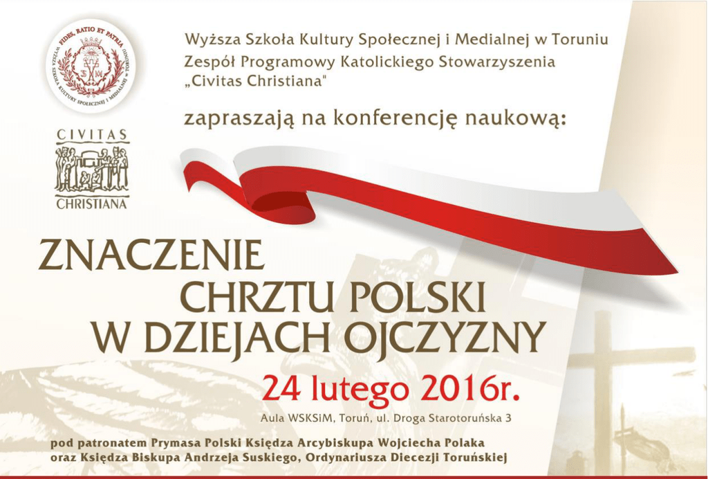 PROGRAM KONFERENCJI 11:00 - rozpoczęcie konferencji, wystąpienie wstępne JM Rektor o. dr Zdzisław Klafka CSsR, Przewodniczący Katolickiego Stowarzyszenia "Civitas Christiana" - Tomasz Nakielski 11:15 - prof. dr hab. Krzysztof Ożóg (Instytut Historii UJ, Kraków) - „Chrzest Mieszka I - jako fundament Polski”, 11:45 - dr Robert Kościelny (Szczecin) - „Polskość w dobie Rzeczpospolitej Obojga Narodów - wielość i pluralizm czy ciasnota i zamknięcie? ”, 12:15 - dr Ilona Zaleska (Instytut Historii i Archiwistyki UMK, Toruń) - „Kościół z Narodem bez Państwa”, 12:45 - przerwa kawowa 13:15 - prof. dr hab. Grzegorz Kucharczyk (Instytut Historii PAN, Poznań) - „Duchowe i kulturowe konsekwencje Chrztu Polski w myśleniu Jana Pawła II o Ojczyźnie” , 13:45 - dr hab. Paweł Skibiński (Instytut Historyczny UW, Warszawa) - „Współczesne przesłanie Prymasa Stefana Wyszyńskiego do Polaków w kontekście Chrztu Polski”, 14:15 - prof. dr hab. Waldemar Rozynkowski (Instytut Historii i Archiwistyki UMK, Toruń) - „Obecność Prymasa Stefana Wyszyńskiego na obchodach Milenium Chrztu Polski na Kujawach i Pomorzu”, 14:45 - podsumowanie konferencji - dyskusja 15:15 - zakończenie konferencji