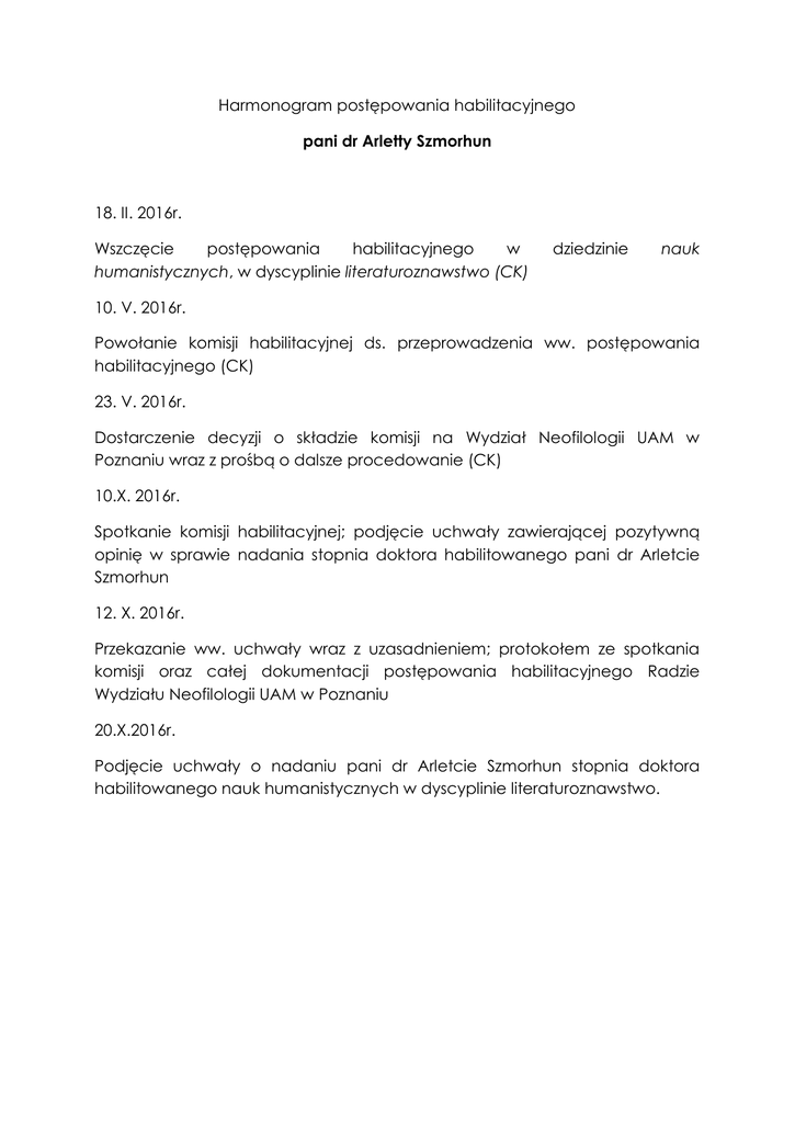 Harmonogram postępowania habilitacyjnego pani dr Arletty Szmorhun 18. II. 2016r. Wszczęcie postępowania habilitacyjnego w humanistycznych, w dyscyplinie literaturoznawstwo (CK) dziedzinie nauk 10. V. 2016r. Powołanie komisji habilitacyjnej ds. przeprowadzenia ww. postępowania habilitacyjnego (CK) 23. V. 2016r. Dostarczenie decyzji o składzie komisji na Wydział Neofilologii UAM w Poznaniu wraz z prośbą o dalsze procedowanie (CK) 10.X. 2016r. Spotkanie komisji habilitacyjnej; podjęcie uchwały zawierającej pozytywną opinię w sprawie nadania stopnia doktora habilitowanego pani dr Arletcie Szmorhun 12. X. 2016r. Przekazanie ww. uchwały wraz z uzasadnieniem; protokołem ze spotkania komisji oraz całej dokumentacji postępowania habilitacyjnego Radzie Wydziału Neofilologii UAM w Poznaniu 20.X.2016r. Podjęcie uchwały o nadaniu pani dr Arletcie Szmorhun stopnia doktora habilitowanego nauk humanistycznych w dyscyplinie literaturoznawstwo.