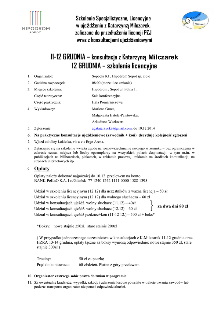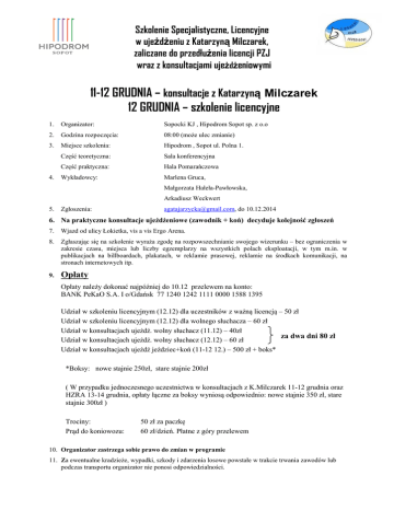 Szkolenie Specjalistyczne, Licencyjne w ujeżdżeniu z Katarzyną Milczarek, zaliczane do przedłużenia licencji PZJ wraz z konsultacjami ujeżdżeniowymi 11-12 GRUDNIA – konsultacje z Katarzyną Milczarek 12 GRUDNIA – szkolenie licencyjne 1. Organizator: Sopocki KJ , Hipodrom Sopot sp. z o.o 2. Godzina rozpoczęcia: 08:00 (może ulec zmianie) 3. Miejsce szkolenia: Hipodrom , Sopot ul. Polna 1. Część teoretyczna: Sala konferencyjna Część praktyczna: Hala Pomarańczowa Wykładowcy: Marlena Gruca, 4. Małgorzata Hałeła-Pawłowska, Arkadiusz Weckwert 5. Zgłoszenia: [email protected], do 10.12.2014 6. Na praktyczne konsultacje ujeżdżeniowe (zawodnik + koń) decyduje kolejność zgłoszeń 7. Wjazd od ulicy Łokietka, vis a vis Ergo Arena. 8. Zgłaszając się na szkolenie wyraża zgodę na rozpowszechnianie swojego wizerunku – bez ograniczenia w zakresie czasu, miejsca lub liczby egzemplarzy na wszystkich polach eksploatacji, w tym m.in. w publikacjach na billboardach, plakatach, w reklamie prasowej, reklamie na środkach komunikacji, na stronach internetowych itp. 9. Opłaty Opłaty należy dokonać najpóźniej do 10.12 przelewem na konto: BANK PeKaO S.A. I o/Gdańsk 77 1240 1242 1111 0000 1588 1395 Udział w szkoleniu licencyjnym (12.12) dla uczestników z ważną licencją – 50 zł Udział w szkoleniu licencyjnym (12.12) dla wolnego słuchacza – 60 zł Udział w konsultacjach ujeżdż. wolny słuchacz (11.12) – 40zł za dwa dni 80 zł Udział w konsultacjach ujeżdż. wolny słuchacz (12.12) – 60 zł Udział w konsultacjach ujeżdż jeździec+koń (11-12 12.) – 500 zł + boks* *Boksy: nowe stajnie 250zł, stare stajnie 200zł ( W przypadku jednoczesnego uczestnictwa w konsultacjach z K.Milczarek 11-12 grudnia oraz HZRA 13-14 grudnia, opłaty łączne za boksy wyniosą odpowiednio: nowe stajnie 350 zł, stare stajnie 300zł ) Trociny: Prąd do koniowozu: 50 zł za paczkę 60 zł/dzień. Płatne z góry przelewem 10. Organizator zastrzega sobie prawo do zmian w programie 11. Za ewentualne kradzieże, wypadki, szkody i zdarzenia losowe powstałe w trakcie trwania zawodów lub podczas transportu organizator nie ponosi odpowiedzialności. PROGRAM Czwartek 11.12.2014 15.30 – 20.30 Konsultacje z Katarzyną Milczarek. Trening 8 par, co około 30-40 minut Piątek 12.12.2014 9.00 – 9.10 9.15 – 10.45 10.55 – 12.10 12.10-12.30 12.30 – 17.30 18.00 – 19.30 Rozpoczęcie szkolenia – Marlena Gruca „Szkoleniowiec – jego rola i znaczenie” – wykład Arkadiusz Weckwert, „Główne aspekty szkolenia jeźdźca na poszczególnych etapach rozwoju” wykład, Małgorzata Pawłowska cz.1 przerwa Praktyczne prowadzenie szkolenia w okresie przedstartowym z parami koń&zawodnik na różnym poziomie wyszkolenia - Katarzyna Milczarek – Jasińska, Trening 8 par, co około 30-40 minut „Główne aspekty szkolenia jeźdźca na poszczególnych etapach rozwoju” wykład, Marlena Gruca cz.2 Serdecznie zapraszamy!