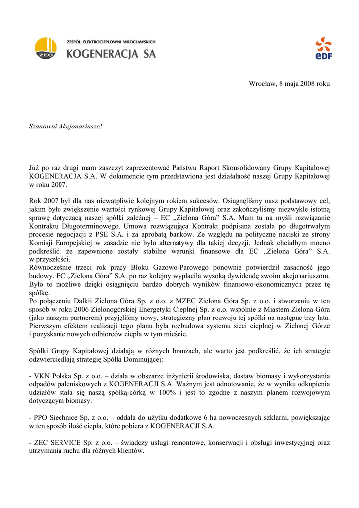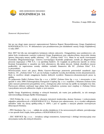 Wrocław, 8 maja 2008 roku Szanowni Akcjonariusze! Już po raz drugi mam zaszczyt zaprezentować Państwu Raport Skonsolidowany Grupy Kapitałowej KOGENERACJA S.A. W dokumencie tym przedstawiona jest działalność naszej Grupy Kapitałowej w roku 2007. Rok 2007 był dla nas niewątpliwie kolejnym rokiem sukcesów. Osiągnęliśmy nasz podstawowy cel, jakim było zwiększenie wartości rynkowej Grupy Kapitałowej oraz zakończyliśmy niezwykle istotną sprawę dotyczącą naszej spółki zależnej – EC „Zielona Góra” S.A. Mam tu na myśli rozwiązanie Kontraktu Długoterminowego. Umowa rozwiązująca Kontrakt podpisana została po długotrwałym procesie negocjacji z PSE S.A. i za aprobatą banków. Ze względu na polityczne naciski ze strony Komisji Europejskiej w zasadzie nie było alternatywy dla takiej decyzji. Jednak chciałbym mocno podkreślić, że zapewnione zostały stabilne warunki finansowe dla EC „Zielona Góra” S.A. w przyszłości. Równocześnie trzeci rok pracy Bloku Gazowo-Parowego ponownie potwierdził zasadność jego budowy. EC „Zielona Góra” S.A. po raz kolejny wypłaciła wysoką dywidendę swoim akcjonariuszom. Było to możliwe dzięki osiągnięciu bardzo dobrych wyników finansowo-ekonomicznych przez tę spółkę. Po połączeniu Dalkii Zielona Góra Sp. z o.o. z MZEC Zielona Góra Sp. z o.o. i stworzeniu w ten sposób w roku 2006 Zielonogórskiej Energetyki Cieplnej Sp. z o.o. wspólnie z Miastem Zielona Góra (jako naszym partnerem) przyjęliśmy nowy, strategiczny plan rozwoju tej spółki na następne trzy lata. Pierwszym efektem realizacji tego planu była rozbudowa systemu sieci cieplnej w Zielonej Górze i pozyskanie nowych odbiorców ciepła w tym mieście. Spółki Grupy Kapitałowej działają w różnych branżach, ale warto jest podkreślić, że ich strategie odzwierciedlają strategię Spółki Dominującej: - VKN Polska Sp. z o.o. – działa w obszarze inżynierii środowiska, dostaw biomasy i wykorzystania odpadów paleniskowych z KOGENERACJI S.A. Ważnym jest odnotowanie, że w wyniku odkupienia udziałów stała się naszą spółką-córką w 100% i jest to zgodne z naszym planem rozwojowym dotyczącym biomasy. - PPO Siechnice Sp. z o.o. – oddała do użytku dodatkowe 6 ha nowoczesnych szklarni, powiększając w ten sposób ilość ciepła, które pobiera z KOGENERACJI S.A. - ZEC SERVICE Sp. z o.o. – świadczy usługi remontowe, konserwacji i obsługi inwestycyjnej oraz utrzymania ruchu dla różnych klientów. Jednym z priorytetowych celów dla tych spółek jest utrzymanie pozycji liderów w Grupie Kapitałowej w wyżej wymienionych obszarach. Kontynuowane są działania zmierzające do poprawy wskaźników produktywności urządzeń i optymalizacji wykorzystania zasobów. Wysiłki te w dużym stopniu wspomagane są przez fakt, że inwestorem strategicznym w KOGENERACJI S.A., a zatem pośrednio również w Grupie Kapitałowej KOGENERACJA S.A. jest koncern EDF. Dzięki temu możliwym jest wykorzystanie wielu efektów synergii i odnoszenie w ten sposób sukcesów w zmaganiach z krajową i zagraniczną konkurencją. Spółki z naszej Grupy Kapitałowej doskonale sobie z tym radzą i dlatego możemy patrzeć w przyszłość z optymizmem. Podsumowując – nasza dobra i konsekwentna praca przynosi spodziewane rezultaty, przyczyniając się do dalszego wzrostu wartości całej Grupy Kapitałowej KOGENERACJA S.A. Dziękuję Wam, Szanowni Akcjonariusze, za zaufanie, jakim nas obdarzacie. Denis Bretaudeau Prezes Zarządu, KOGENERACJI S.A.