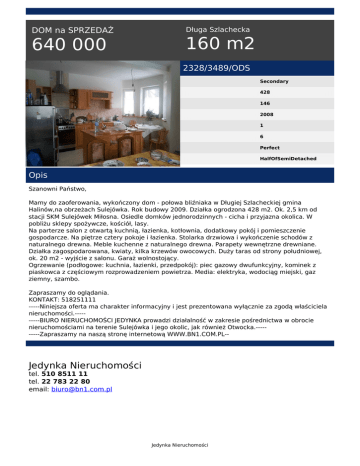 DOM na SPRZEDAŻ 640 000 Długa Szlachecka 160 m2 2328/3489/ODS Secondary 428 146 2008 1 6 Perfect HalfOfSemiDetached Opis Szanowni Państwo, Mamy do zaoferowania, wykończony dom - połowa bliźniaka w Długiej Szlacheckiej gmina Halinów,na obrzeżach Sulejówka. Rok budowy 2009. Działka ogrodzona 428 m2. Ok. 2,5 km od stacji SKM Sulejówek Miłosna. Osiedle domków jednorodzinnych - cicha i przyjazna okolica. W pobliżu sklepy spożywcze, kościół, lasy. Na parterze salon z otwartą kuchnią, łazienka, kotłownia, dodatkowy pokój i pomieszczenie gospodarcze. Na piętrze cztery pokoje i łazienka. Stolarka drzwiowa i wykończenie schodów z naturalnego drewna. Meble kuchenne z naturalnego drewna. Parapety wewnętrzne drewniane. Działka zagospodarowana, kwiaty, kilka krzewów owocowych. Duży taras od strony południowej, ok. 20 m2 - wyjście z salonu. Garaż wolnostojący. Ogrzewanie (podłogowe: kuchnia, łazienki, przedpokój): piec gazowy dwufunkcyjny, kominek z piaskowca z częściowym rozprowadzeniem powietrza. Media: elektryka, wodociąg miejski, gaz ziemny, szambo. Zapraszamy do oglądania. KONTAKT: 518251111 -----Niniejsza oferta ma charakter informacyjny i jest prezentowana wyłącznie za zgodą właściciela nieruchomości.---------BIURO NIERUCHOMOŚCI JEDYNKA prowadzi działalność w zakresie pośrednictwa w obrocie nieruchomościami na terenie Sulejówka i jego okolic, jak również Otwocka.---------Zapraszamy na naszą stronę internetową WWW.BN1.COM.PL-- Jedynka Nieruchomości tel. 510 8511 11 tel. 22 783 22 80 email: [email protected] Jedynka Nieruchomości Powered by TCPDF (www.tcpdf.org)