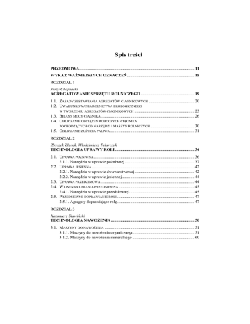 Spis treści PRZEDMOWA............................................................................................................. 11 WYKAZ WAśNIEJSZYCH OZNACZEŃ ................................................................ 15 ROZDZIAŁ 1 Jerzy Chojnacki AGREGATOWANIE SPRZĘTU ROLNICZEGO ................................................... 19 1.1. ZASADY ZESTAWIANIA AGREGATÓW CIĄGNIKOWYCH ........................................... 20 1.2. UWARUNKOWANIA ROLNICTWA EKOLOGICZNEGO W TWORZENIU AGREGATÓW CIĄGNIKOWYCH ......................................................... 23 1.3. BILANS MOCY CIĄGNIKA ........................................................................................ 26 1.4. OBLICZANIE OBCIĄśEŃ ROBOCZYCH CIĄGNIKA POCHODZĄCYCH OD NARZĘDZI I MASZYN ROLNICZYCH .......................................... 30 1.5. OBLICZANIE ZUśYCIA PALIWA ................................................................................ 31 ROZDZIAŁ 2 Zbyszek Zbytek, Włodzimierz Talarczyk TECHNOLOGIA UPRAWY ROLI ........................................................................... 34 2.1. UPRAWA POśNIWNA ............................................................................................... 36 2.1.1. Narzędzia w uprawie poŜniwnej .................................................................. 37 2.2. UPRAWA JESIENNA ................................................................................................. 42 2.2.1. Narzędzia w uprawie dwuwarstwowej ......................................................... 42 2.2.2. Narzędzia w uprawie jesiennej..................................................................... 44 2.3. UPRAWA PRZEDZIMOWA ......................................................................................... 44 2.4. WIOSENNA UPRAWA PRZEDSIEWNA ........................................................................ 45 2.4.1. Narzędzia w uprawie przedsiewnej .............................................................. 45 2.5. PRZEDSIEWNE DOPRAWIANIE ROLI ......................................................................... 47 2.5.1. Agregaty doprawiające rolę ......................................................................... 47 ROZDZIAŁ 3 Kazimierz Sławiński TECHNOLOGIA NAWOśENIA ............................................................................... 50 3.1. MASZYNY DO NAWOśENIA ..................................................................................... 51 3.1.1. Maszyny do nawoŜenia organicznego.......................................................... 51 3.1.2. Maszyny do nawoŜenia mineralnego ........................................................... 60 6 Technologia prac maszynowych w rolnictwie ekologicznym 3.2. NAWOśENIE ORGANICZNE ...................................................................................... 64 3.3. NAWOśENIE MINERALNE ........................................................................................ 69 ROZDZIAŁ 4 Wojciech Sadowski TECHNOLOGIA SIEWU I SADZENIA ................................................................... 71 4.1. MASZYNY DO SIEWU I SADZENIA ............................................................................ 73 4.1.1. Maszyny do siewu ........................................................................................ 73 4.1.2. Maszyny do sadzenia ................................................................................... 79 4.2. SIEW ....................................................................................................................... 84 4.3. SADZENIE ............................................................................................................... 88 ROZDZIAŁ 5 Jerzy Chojnacki TECHNOLOGIA PIELĘGNACJI I OCHRONY ROŚLIN ..................................... 94 5.1. 5.2. 5.3. 5.4. PODSTAWY OCHRONY ROŚLIN W ROLNICTWIE EKOLOGICZNYM .............................. 94 OCHRONA MATERIAŁU SIEWNEGO .......................................................................... 96 MECHANICZNO-FIZYCZNE METODY PIELĘGNACJI I OCHRONY ROŚLIN ..................... 98 OPRYSKIWANIE..................................................................................................... 105 5.4.1. Uwarunkowania prawne ............................................................................ 106 5.4.2. Określenie dawki cieczy ............................................................................ 106 5.4.3. Wybór opryskiwacza.................................................................................. 108 5.4.4. Dobór parametrów opryskiwania ............................................................... 114 5.4.5. Wykonanie opryskiwania ........................................................................... 121 ROZDZIAŁ 6 Edmund Dulcet TECHNOLOGIA NAWADNIANIA DESZCZOWNIANEGO ............................. 123 6.1. RODZAJE SYSTEMÓW DESZCZOWNIANYCH (DESZCZOWNI) I ICH CHARAKTERYSTYKA ..................................................................................... 125 6.2. ELEMENTY SKŁADOWE DESZCZOWNI .................................................................... 132 6.3. DOBÓR PODSTAWOWYCH PARAMETRÓW PRACY DESZCZOWNI .............................. 140 6.4. EKOLOGICZNE ASPEKTY NAWADNIANIA DESZCZOWNIANEGO............................... 144 ROZDZIAŁ 7 Edmund Dulcet TECHNOLOGIA ZBIORU PASZ ZIELONYCH ................................................. 146 7.1. MASZYNY DO ZBIORU PASZ ZIELONYCH ............................................................... 147 7.1.1. Maszyny do koszenia ................................................................................. 147 Spis treści 7.2. 7.3. 7.4. 7.5. 7 7.1.2. Maszyny do przetrząsania i zgrabiania ...................................................... 150 7.1.3. Zgniatacze zielonek.................................................................................... 154 7.1.4. Spulchniacze pokosów ............................