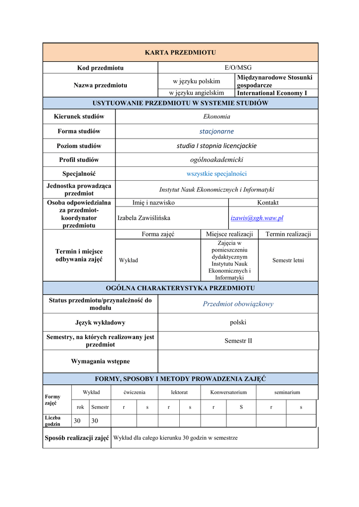 KARTA PRZEDMIOTU E/O/MSG Międzynarodowe Stosunki w języku polskim gospodarcze w języku angielskim International Economy I Kod przedmiotu Nazwa przedmiotu USYTUOWANIE PRZEDMIOTU W SYSTEMIE STUDIÓW Kierunek studiów Ekonomia Forma studiów stacjonarne Poziom studiów studia I stopnia licencjackie Profil studiów ogólnoakademicki Specjalność wszystkie specjalności Jednostka prowadząca Instytut Nauk Ekonomicznych i Informatyki przedmiot Osoba odpowiedzialna Imię i nazwisko Kontakt za przedmiotkoordynator Izabela Zawiślińska [email protected] przedmiotu Forma zajęć Miejsce realizacji Termin realizacji Termin i miejsce odbywania zajęć Zajęcia w pomieszczeniu dydaktycznym Instytutu Nauk Ekonomicznych i Informatyki Wykład Semestr letni OGÓLNA CHARAKTERYSTYKA PRZEDMIOTU Status przedmiotu/przynależność do modułu Przedmiot obowiązkowy Język wykładowy polski Semestry, na których realizowany jest przedmiot Semestr II Wymagania wstępne FORMY, SPOSOBY I METODY PROWADZENIA ZAJĘĆ Formy zajęć Liczba godzin Wykład rok 30 Semestr ćwiczenia r lektorat s r Konwersatorium s r 30 Sposób realizacji zajęć Wykład dla całego kierunku 30 godzin w semestrze S seminarium r s Sposób zaliczenia zajęć Metody dydaktyczne Przedmioty powiązane/moduł Zaliczenie w formie kolokwium pisemnego testowego Wykład z prezentacją multimedialną, studium przypadków Makroekonomia 1. A. Budnikowski, Międzynarodowe stosunki gospodarcze. PWE, Warszawa 2006, wyd III 2. P. R. Krugman, M. Obstfeld, Ekonomia miedzynarodowa. WN PWN, Warszawa 2008 - tom I i II Wykaz 1. P. Bożyk, Międzynarodowe stosunki ekonomiczne. PWE, Warszawa 2008 literatury 2. J. Misala, Wymiana międzynarodowa i gospodarka światowa. Teoria i Uzupełnia mechanizmy funkcjonowania. OW SGH, Warszawa 2005 jąca 3.I. Zawiślińska, Optymalny obszar walutowy. Teoria i praktyka na kontynencie amerykańskim. OW SGH, Warszawa 2008 Podstawowa CELE, TREŚCI I EFEKTY KSZTAŁCENIA Cele przedmiotu (ogólne, szczegółowe) 1.Przekazanie wiedzy o mechanizmach kształtujących proces permanentnego umiędzynarodowienia gospodarek w skali globalnej 2.Rozszerzenie umiejętności analizowania zjawisk ekonomicznych o aspekty międzynarodowe 3. Pokazanie i uświadomienie istnienia związków i współzależności między aspektami ekonomicznymi, politycznymi a społecznymi i kulturowymi w ramach współczesnej gospodarki światowej Treści programowe Efekty kształcenia (kody) W01 W02 W03 W04 U01 U02 U03 K01 K02 Forma zajęć Temat Wykłady Wprowadzenie do międzynarodowych stosunków gospodarczych. Pojęcie i zakres ekonomii międzynarodowej. Powstanie i ewolucja gospodarki światowej. Podmioty współczesnej gospodarki światowej Teorie handlu międzynarodowego merkantylizm i teorie klasyczne Teorie handlu międzynarodowego - ujęcie neoklasyczne Alternatywne teorie handlu międzynarodowego Terms of trade i mechanizm kształtowania się cen światowych Wzrost gospodarczy a handel międzynarodowy Międzynarodowy przepływ czynników produkcji - kapitał Międzynarodowy przepływ czynników produkcji - praca Polityka handlowa i jej narzędzia Międzynarodowy przepływ usług Międzynarodowe stosunki finansowe - bilans płatniczy Kurs walutowy i rynek walutowy Integracja walutowa Procesy regionalizacji, integracji i globalizacji we współczesnej gospodarce światowej Efekty kształcenia Liczba godzin 30 Odniesienie do efektów kształcenia Student, który zaliczył przedmiot kod w zakresie WIEDZY W01 W02 W03 W04 dla kierunku Ma podstawową wiedzę z dziedziny nauk ekonomicznych Ma wiedzę o osiągnięciach nauk w dziedzinie ekonomii międzynarodowej K_W01 Zna metody i narzędzia stosowane w ekonomii międzynarodowej Posiada wiedzę dotyczącą działalności gospodarczej w ujęciu międzynarodowym i globalnym K_W04 K_W02 K_W06 w zakresie UMIEJĘTNOŚCI U01 U02 U03 Potrafi praktycznie stosować wiedzę do rozwiązywania prostych problemów z zakresu ekonomii międzynarodowej K_U01 Wykorzystuje zdobytą wiedzę z zakresu ekonomii w celu analizowania problemów gospodarczych o międzynarodowym charakterze Potrafi zaprojektować i przeprowadzić proste badania, oceniać tendencje rozwojowe i zależności zachodzące w wymiarze międzynarodowym i globalnym K_U02 K_U04 K_U05 w zakresie KOMPETENCJI K01 K02 Ma świadomość roli ekonomii międzynarodowej w procesie podejmowania decyzji gospodarczych Wykazuje się inicjatywą, elastycznością i samodzielnością w prostych problemach ekonomicznych a przede wszystkim ekonomii międzynarodowej K_K03 K_K02 Metody oceny Egzamin pisemny testowy Egzamin ustny Efekty kształce nia (kody) Egzamin pisemny Projekt Kolokwium W01 W02 W03 W04 U01 U02 U03 K01 K02 Punkty ECTS Sprawozdanie Referat/ prezentacja Inne Obciążenie studenta Liczba punktów Liczba godzin ECTS Godziny kontaktowe z nauczycielem akademickim, w tym: wykłady 30 1,2 Forma aktywności konwersatoria Ćwiczenia Konsultacje przedmiotowe w ramach wykładów Konsultacje przedmiotowe w ramach konwersatorium/ćwiczeń Łącznie godzin/punktów ECTS wynikających z zajęć kontaktowych z nauczycielem akademickim 5 35 0,2 1,4 Godziny bez udziału nauczyciela akademickiego wynikające z nakładu pracy studenta, w tym: Przygotowanie się do egzaminu + zdawanie egzaminu Przygotowanie się do kolokwium zaliczeniowego Przygotowanie się do zajęć, w tym studiowanie zalecanej literatury w ramach wykładów Przygotowanie się do zajęć, w tym studiowanie zalecanej literatury w ramach konwersatorium/ćwiczeń Przygotowanie raportu, projektu, prezentacji, dyskusji Łącznie godzin/punktów ECTS wynikających z samodzielnej pracy studenta Sumaryczna liczba godzin/punktów ECTS dla przedmiotu wynikająca z całego nakładu pracy studenta Odsetek godzin/punktów ECTS wynikających z zajęć kontaktowych z nauczycielem akademickim 10 0,4 5 0,2 15 0,6 50 2,0 70% 70%