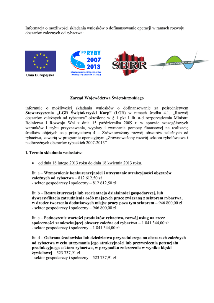 Informacja o możliwości składania wniosków o dofinansowanie operacji w ramach rozwoju obszarów zależnych od rybactwa: Unia Europejska Zarząd Województwa Świętokrzyskiego informuje o możliwości składania wniosków o dofinansowanie za pośrednictwem Stowarzyszenia „LGR Świętokrzyski Karp” (LGR) w ramach środka 4.1. ,,Rozwój obszarów zależnych od rybactwa” określone w § 1 pkt 1 lit. a-d rozporządzenia Ministra Rolnictwa i Rozwoju Wsi z dnia 15 października 2009 r. w sprawie szczegółowych warunków i trybu przyznawania, wypłaty i zwracania pomocy finansowej na realizację środków objętych osią priorytetową 4 – Zrównoważony rozwój obszarów zależnych od rybactwa, zawartą w programie operacyjnym „Zrównoważony rozwój sektora rybołówstwa i nadbrzeżnych obszarów rybackich 2007-2013” I. Termin składania wniosków: od dnia 18 lutego 2013 roku do dnia 18 kwietnia 2013 roku. lit. a – Wzmocnienie konkurencyjności i utrzymanie atrakcyjności obszarów zależnych od rybactwa – 812 612,50 zł - sektor gospodarczy i społeczny – 812 612,50 zł lit. b – Restrukturyzacja lub reorientacja działalności gospodarczej, lub dywersyfikacja zatrudnienia osób mających pracę związaną z sektorem rybactwa, w drodze tworzenia dodatkowych miejsc pracy poza tym sektorem – 946 800,00 zł - sektor gospodarczy i społeczny – 946 800,00 zł lit. c – Podnoszenie wartości produktów rybactwa, rozwój usług na rzecz społeczności zamieszkującej obszary zależne od rybactwa – 1 841 344,00 zł - sektor gospodarczy i społeczny – 1 841 344,00 zł lit. d – Ochrona środowiska lub dziedzictwa przyrodniczego na obszarach zależnych od rybactwa w celu utrzymania jego atrakcyjności lub przywrócenia potencjału produkcyjnego sektora rybactwa, w przypadku zniszczenia w wyniku klęski żywiołowej – 523 737,91 zł - sektor gospodarczy i społeczny – 523 737,91 zł II. Miejsce składania wniosków: wniosek (jeden egzemplarz w wersji papierowej oraz w wersji elektronicznej, ocena zgodności z LSROR) należy składać bezpośrednio w biurze Stowarzyszenia „LGR Świętokrzyski Karp” przy ul. Szkolna 1, 28-236 Rytwiany, od poniedziałku do piątku w godz. 7.00-15.00 III. Miejsce udostępnienia dokumentacji konkursowej Wzór wniosku o dofinansowanie wraz z instrukcją jego wypełnienia, kryteria wyboru operacji przez LGR określone w LSROR oraz wykaz dokumentów, które dołącza się do wniosku, można pobrać: osobiście w biurze Stowarzyszenia na stronie internetowej Stowarzyszenia „LGR Świętokrzyski Karp” http://www.swietokrzyskikarp.pl na stronie internetowej Świętokrzyskiego Biura Rozwoju Regionalnego w Kielcach http://www.prow.sbrr.pl IV. Dodatkowe informacje Więcej informacji o sposobie ubiegania się o dofinansowanie można uzyskać w biurze Stowarzyszenia – ul. Szkolna 1, 28-236 Rytwiany, tel. (15) 864 78 06 lub 795 492 195, email: [email protected] Operacja współfinansowana przez Unię Europejską ze środków finansowych Europejskiego Funduszu Rybackiego zapewniającą inwestycję w zrównoważone rybołówstwo