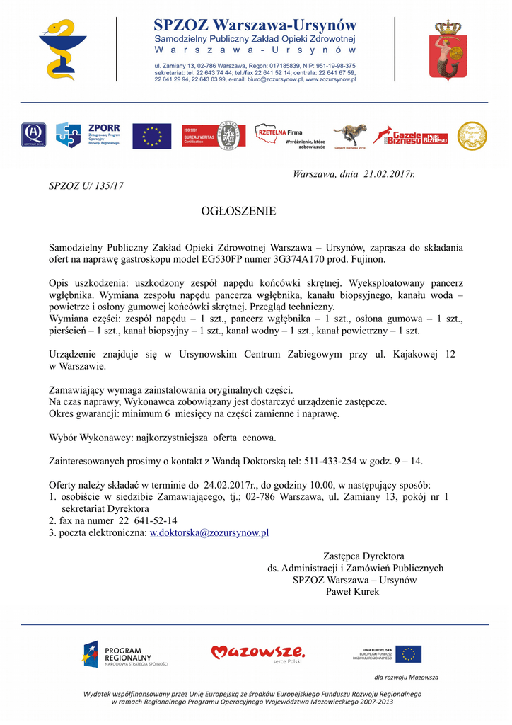 Warszawa, dnia 21.02.2017r. SPZOZ U/ 135/17 OGŁOSZENIE Samodzielny Publiczny Zakład Opieki Zdrowotnej Warszawa – Ursynów, zaprasza do składania ofert na naprawę gastroskopu model EG530FP numer 3G374A170 prod. Fujinon. Opis uszkodzenia: uszkodzony zespół napędu końcówki skrętnej. Wyeksploatowany pancerz wgłębnika. Wymiana zespołu napędu pancerza wgłębnika, kanału biopsyjnego, kanału woda – powietrze i osłony gumowej końcówki skrętnej. Przegląd techniczny. Wymiana części: zespół napędu – 1 szt., pancerz wgłębnika – 1 szt., osłona gumowa – 1 szt., pierścień – 1 szt., kanał biopsyjny – 1 szt., kanał wodny – 1 szt., kanał powietrzny – 1 szt. Urządzenie znajduje się w Ursynowskim Centrum Zabiegowym przy ul. Kajakowej 12 w Warszawie. Zamawiający wymaga zainstalowania oryginalnych części. Na czas naprawy, Wykonawca zobowiązany jest dostarczyć urządzenie zastępcze. Okres gwarancji: minimum 6 miesięcy na części zamienne i naprawę. Wybór Wykonawcy: najkorzystniejsza oferta cenowa. Zainteresowanych prosimy o kontakt z Wandą Doktorską tel: 511-433-254 w godz. 9 – 14. Oferty należy składać w terminie do 24.02.2017r., do godziny 10.00, w następujący sposób: 1. osobiście w siedzibie Zamawiającego, tj.; 02-786 Warszawa, ul. Zamiany 13, pokój nr 1 sekretariat Dyrektora 2. fax na numer 22 641-52-14 3. poczta elektroniczna: [email protected] Zastępca Dyrektora ds. Administracji i Zamówień Publicznych SPZOZ Warszawa – Ursynów Paweł Kurek