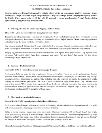 F0-2014/2015-SEMINARIUM PODSTAW WIARY K2. DEKALOG jako dar, zadanie i ochrona Każdego dnia proś Ducha Świętego, abyś widział więcej niż to, na co patrzysz, abyś był posłuszny temu, co usłyszysz i abyś zrozumiał więcej niż przeczytasz. Bóg chce odkryć przed Tobą tajemnicę swej miłości do Ciebie. Chce pomóc odkryć Ci dar jaki Ci zostawił – swoje przykazania. Przyjdź Duchu Święty zapraszam Cię, przyjmuję Cię, prowadź mnie… 1. Dekalog jako dar dla Ciebie wynikający z miłości Bożej. 1J 2, 15-17 – „kto zaś wypełnia wolę Bożą, ten trwa na wieki” Tak jak to jest z każdym darem – nie musi on być przyjęty. A więc Dekalog to nie jest Twój obowiązek! Możesz z niego nie skorzystać. Powtarzam: Dekalog nie jest obowiązkiem. To jest dar dla Ciebie. A skoro jego Dawca jest dobry to ten dar może być tylko i wyłącznie dobry. Bóg pragnie, abyś żył, dlatego daje Ci jasne wskazówki. Być może, po długich poszukiwaniach, odkryłbyś sam jedną czy drugą ze wskazówek. Ale po co tracić czas na szukanie, gdy dostajemy to jak na tacy od Boga? Zapytaj się jakie skojarzenie budzi się w nas odruchowo na sam wyraz "Boże przykazanie". Czy myślisz sobie wówczas: "tak trzeba" albo: "tego Bóg wymaga", czy może: "to jest dobre" lub nawet: "to jest słowo kochającego Boga"? Ojcze nasz… 2. Zadanie – Bądź szczęśliwy! Rozważ Ps 119,1-8 – szczęśliwi, którzy kroczą Jego drogami Przykazania Boże nie są po to, aby wypróbować Twoją wytrwałość. Nie są po to, aby pokazać, jak bardzo jesteśmy różni od Boga. Nie są po to, aby przeszkadzać nam w byciu szczęśliwym. Są sposobem, aby do tego szczęścia dotrzeć. Sposobem, nie celem. Gdy Dekalog staje się celem to nie może dać szczęścia. I wtedy stajemy się niewolnikami przykazań. Cel życia – bycie szczęśliwym żyjąc blisko Boga. Czy Dekalog może nam w tym pomóc? Oczywiście. Usuwa przeszkody na drodze do realizacji tego celu. Czy masz wrażenie, że posłuszeństwo niektórym przykazaniom utrudnia mi bycie szczęśliwym? Poproś Boga o wiarę, że daje Ci przykazania, bo chce, abyś był szczęśliwy. Ojcze nasz… 3. Motywacje wypełniania Dekalogu Rozważ Łk 10, 25-28 – przykazanie miłości Boga i bliźniego. Przykazanie miłości Boga i bliźniego też mówi o Dekalogu. Ale nie o konkretnych przykazaniach, a o głębi tych przykazań, mówi dlaczego powinniśmy wypełniać Dekalog. Spójrz w swoje wnętrze i odpowiedz sobie na pytanie: Dlaczego wypełniam 10 przykazań Boga? Czy z lęku przed piekłem - czy z wiary w mądrość Boga? Są dla mnie tylko trudnym i niewdzięcznym prawem czy mają duchową głębię? Czy kieruje mną miłość czy szukanie korzyści, cynizm, legalizm…? Czy ten „nowy dekalog” nie zastąpił w moim sercu Ewangelii Jezusa Chrystusa? (ani troszkę?). Ojcze nasz… Materiały formacyjne Wspólnoty Effatha przy parafii Wieczerzy Pańskiej w Lublinie; www.effatha-lublin.pl 4. Drogowskaz i ochrona. Rozważ Ez 33,11. „Pragnę abyście się nawrócili i żyli” Czy boisz się znaków drogowych? Gdy widzisz znak: „za 100m przepaść, zawróć” to boisz się znaku czy tego, że może wpaść Ci do głowy głupi pomysł nieposłuszeństwa wobec tego znaku? Czy tak samo patrzysz na przykazania (drogowskazy) od Boga? Jakie uczucia rodzą się w Twoim sercu, gdy czytasz Boże przykazania? Które z nich najbardziej dotyka Twojego serca? Proś Boga, aby napełnił pokojem Twoje serce, aby Boże Prawo nie rodziło w Tobie lęku. Po wyprowadzeniu Narodu Wybranego z niewoli egipskiej, Bóg poprowadził ich do Góry Synaj, na której nadał Izraelowi Prawo. Bóg wiedział, jaka droga czeka ich przez pustynię i jakie czekają na nich niebezpieczeństwa. Dlatego dał im drogowskazy. Pamiętaj, że Bóg w swojej miłości ostrzega Cię przed każdym niebezpieczeństwem. Bóg chce Cię chronić, dlatego dał Ci Dekalog. Ojcze nasz… 5. Dekalog jako mój wybór w wolności. Rozważ Jr 29,11 – Bóg chce dać pokój i zadbać o naszą przyszłość. Bóg pokazuje Ci, jak bardzo Cię kocha, jak bardzo Mu na Tobie zależy. Dzięki Niemu mogłeś również zobaczyć, jak wielką niewolą jest grzech. Dekalog jest również dla Ciebie drogą do pełnej wolności. Stając twarzą w twarz przed Bogiem, odpowiedz na pytania: czy rzeczywiście pragnę pełnej wolności i wyzwolenia z grzechu? Czy zgadzam się, by moje wyzwolenie dokonało się zgodnie z planem Boga? Czy chcę uczynić Dekalog moją drogą wolności? W żarliwej modlitwie proś Boga, abyś potrafił czytać Jego prawo zgodnie z Jego zamysłem. Ojcze nasz… Materiały formacyjne Wspólnoty Effatha przy parafii Wieczerzy Pańskiej w Lublinie; www.effatha-lublin.pl