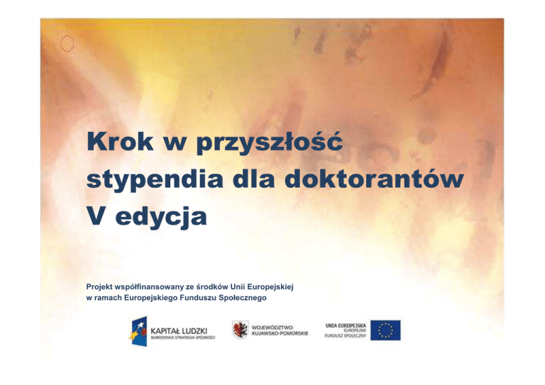 Krok w przyszłość stypendia dla doktorantów V edycja Projekt współfinansowany ze środków Unii Europejskiej w ramach Europejskiego Funduszu Społecznego Zrealizowane przez Województwo Kujawsko-Pomorskie projekty stypendialne* skierowane do doktorantów Lp. Tytuł projektu Liczba stypendiów w latach akademickich 1 Krok w przyszłość – stypendia dla doktorantów (działanie 2.6 ZPORR) 2006/2007 - 90 stypendiów 2 Krok w przyszłość – stypendia dla doktorantów II edycja (poddziałanie 8.2.2 PO KL) 2007/2008 - 60 stypendiów 3 Stypendia dla doktorantów 2008/2009 – ZPORR (działanie 2.6 ZPORR) 2008/2009 - 393 stypendia 4 Krok w przyszłość – stypendia dla doktorantów III edycja (poddziałanie 8.2.2 PO KL) 2009/2010 – 63 stypendia 2010/2011 – 89 stypendiów 5 Krok w przyszłość – stypendia dla doktorantów IV edycja (poddziałanie 8.2.2 PO KL) 2011/2012 – 43 stypendia 2012/2013 – 56 stypendiów * projekty współfinansowane ze środków Unii Europejskiej w ramach Europejskiego Funduszu Społecznego Krok w przyszłość – stypendia dla doktorantów V edycja nabór wniosków 2013/2014 – 50 stypendiów nabór wniosków 2014/2015 – 50 stypendiów Projekt współfinansowany ze środków Unii Europejskiej w ramach Europejskiego Funduszu Społecznego Stypendyści projektu (na podst. IV edycji projektu) 2011 – 2013 chemia - 22 os. fizyka - 15 os. biologia medyczna - 12 os. inżynieria materiałowa - 7 os. zootechnika - 7 os. agronomia - 5 os. budowa i eksploatacja maszyn – 5 os. inne – 26 os. (informatyka, telekomunikacja, mechanika, astronomia, automatyka i robotyka, biologia, biotechnologia, elektrotechnika, geografia, medycyna, ogrodnictwo i in.) Stypendyści Informator: doktoranci4-1.kujawsko-pomorskie.pl doktoranci4-2.kujawsko-pomorskie.pl Współpraca z firmą - przykłady • opracowanie metody oczyszczania biogazu, • nowy granulat polimerowy do celów specjalnych (produkcja obuwia, wykładzin podłogowych, itp.), • biodegradowalny regranulat powstający z odpadów technologicznych do wytwarzania opakowań, • opracowanie i wdrożenie parametrów zamykania opakowań polimerowych, Współpraca z firmą – przykłady • technologia przedsiewnej obróbki i odkażania nasion, • budowa aparatury przemysłowej do kalibracji nasion, • metoda oszacowania trwałości zmęczeniowej elementów konstrukcyjnych, • ocena trwałości i odporności materiałów budowlanych i budowli na czynniki korozyjne, Współpraca z firmą - przykłady • opatrunek hemostatyczny o działaniu onkostatycznym, • nowa metoda obrazowania zewnętrznych warstw siatkówki, • nowa technologia lęgu kurcząt, • wprowadzenie działań profilaktycznych w przypadku zaburzeń metabolicznych krów. Korzyści dla przedsiębiorstw zaplecze badawcze uniwersytetów kreowanie nowych rozwiązań w oparciu o wiedzę naukową wykwalifikowana kadra badawcza kształcenie przyszłej kadry przedsiębiorstwa V edycja doktoranci5-1.kujawsko-pomorskie.pl Zasady formalne posiadanie otwartego przewodu doktorskiego posiadanie publikacji na części A lub B wykazu czasopism naukowych (komunikat MNiSW) współpraca z co najmniej jednym przedsiębiorstwem realizowanie doktoratu – kierunek matematycznoprzyrodniczy i technologiczny harmonogram pracy naukowej we współpracy z przedsiębiorstwem Zasady formalne (cd.) niepobieranie stypendium: - w ramach innego projektu stypendialnego realizowanego w ramach priorytetu IV lub VIII PO KL, - ze środków publicznych w wysokości przekraczającej maksymalny limit wsparcia określony w PO KL, tj. pow. 5 000 zł Zasady merytoryczne opis podstawowych zagadnień dotyczących pracy doktorskiej maks. 15 pkt szczegółowy opis zakresu współpracy z przedsiębiorstwem w ramach prowadzonych badań naukowych - maks. 10 pkt zgodność zakresu współpracy z przedsiębiorstwem w ramach prowadzonych badań naukowych z dziedzinami gospodarki i nauki najistotniejszymi z punktu widzenia potencjału regionu (tzw. inteligentnymi specjalizacjami) - maks. 5 pkt harmonogram pracy naukowej we współpracy z przedsiębiorstwem w roku akademickim 2013/2014 – maks. 10 pkt Wysokość stypendium do 3000,00 zł do 5000,00 zł Komisja Stypendialna powoływana przez Zarząd Województwa KujawskoPomorskiego, który ustala również organizację jej pracy opracowuje listę wniosków rekomendowanych do przyznania stypendium podejmuje decyzję o rekomendowaniu 5 osób do przyznania stypendium w wys. do 5 000 zł Decyzja o wypłacie stypendium sprawozdanie z realizacji harmonogramu pracy naukowej we współpracy z przedsiębiorstwem prezentacja ze zrealizowanych działań wykazanych w harmonogramie (zaprezentowanie Komisji Stypendialnej osiągnięć i wyników kolejno w I i II semestrze) Wypłata stypendium miesiąc marzec 2014 r. za okres październik 2013 r. – luty 2014 r. miesiąc październik 2014r. za okres marzec 2014 r. – wrzesień 2014 r. Dziękuję za uwagę Monika Marchlewicz Departament Edukacji i Sportu Urząd Marszałkowski Województwa Kujawsko-Pomorskiego