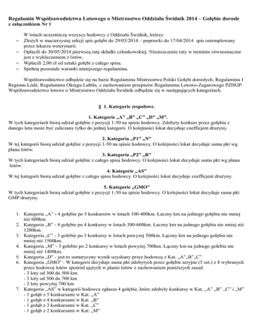 Regulamin Współzawodnictwa Lotowego o Mistrzostwo Oddziału Świdnik 2014 – Gołębie dorosłe z załącznikiem Nr 1 – – – – W lotach uczestniczą wszyscy hodowcy z Oddziału Świdnik, którzy: Złożyli w macierzystej sekcji spis gołębi do 29/03/2014 – poprawki do 17/04/2014 spis ostemplowany przez lekarza weterynarii. Opłacili do 30/05/2014 pierwszą ratę składki członkowskiej. Nieuiszczenie raty w terminie równoznaczne jest z wykluczeniem z lotów.. Wpłacili 2,00 zł od sztuki gołębi z całego spisu. Spełnią pozostałe warunki niniejszego regulaminu. Współzawodnictwo odbędzie się na bazie Regulaminu Mistrzostwa Polski Gołębi dorosłych, Regulaminu I Regionu Łódź, Regulaminu Okręgu Lublin, z zachowaniem przepisów Regulaminu Lotowo-Zegarowego PZHGP. Współzawodnictwo lotowe o Mistrzostwo Oddziału Świdnik odbędzie się w następujących kategoriach. § 1. Kategorie zespołowe. 1. Kategorie „A” „B” „C” „D” „M”. W tych kategoriach biorą udział gołębie z pozycji 1-50 na spisie hodowcy. Zdobyty konkurs przez gołębia z danego lotu może być zaliczany tylko do jednej kategorii. O kolejności lokat decyduje coefficjent drużyny. 2. Kategoria „P1” „N” W tej kategorii biorą udział gołębie z pozycji 1-50 na spisie hodowcy. O kolejności lokat decyduje suma pkt wg planu lotów. 3. Kategoria „P2” „R” W tych kategoriach biorą udział gołębie z całego spisu hodowcy. O kolejności lokat decyduje suma pkt wg planu lotów. 4. Kategorie „AS” W tej kategorii biorą udział gołębie z całego spisu hodowcy. O kolejności lokat decyduje coefficjent drużyny. 5. Kategorie „GMO” W tych kategoriach biorą udział gołębie z pozycji 1-50 na spisie hodowcy. O kolejności lokat decyduje suma pkt GMP drużyny. 1. Kategoria „A” - 4 gołębie po 5 konkursów w lotach 100-400km. Łaczny km na jednego gołębia nie mniej niż 600km. 2. Kategoria „B” - 4 gołębie po 4 konkursy w lotach 300-600km. Łaczny km na jednego gołębia nie mniej niż 1200km. 3. Kategoria „C” - 3 gołebie po 3 konkursy w lotach powyzej 500km. Łączny km na jednego gołębia nie mniej niż 1500km. 4. Kategoria „M” - 3 gołebie po 2 konkursy w lotach powyżej 700km. Łączny km na jednego gołebia nie mniej niż 1400km. 5. Kategoria „D” - jest to sumaryczny wynik uzyskany przez hodowcę z Kat. „A”„B”„C” 6. Kategoria „GMO” - W kategorii decyduje suma pkt zdobytych przez gołębie seryjne (5 szt.) z 8 wybranych przez hodowcę lotów spośród ujętych w planie lotów z zachowaniem poniższych zasad. - 3 loty od 300 do 500 km. - 3 loty od 500 do 700 km - 2 loty powyżej 700 km 7. Kategoria „AS” w kategorii hodowca zgłasza 4 gołębie, które zdobyły konkursy w Kat. „A” „B” „C” i „M” - 1 gołąb z 5 konkursami w Kat. „A” - 1 gołąb z 4 konkursami w Kat. „B” - 1 gołąb z 3 konkursami w Kat. „C” - 1 gołąb z 2 konkursami w Kat. „M” 8. Kategoria „P1” - w kategorii zgodnie z planem lotów punktuje: - 5 pierwszych gołębi każdego hodowcy na liście konkursowej z lotów z wszystkich lotów Kolejność hodowców ustalona zostaje wg listy konkursowej po ostatnim locie. 9. Kategoria „P2” - w kategorii zgodnie z planem lotów punktuje: - 7 pierwszych gołębi każdego hodowcy na liście konkursowej z wszystkich lotów. Kolejność hodowców ustalona zostaje wg listy konkursowej po ostatnim locie. 10. Kategoria „R” - w kategorii zgodnie z planem lotów punktuje: - 3 pierwsze gołębie roczne hodowcy wg listy konkursowej z lotów 100-400km. Kolejność hodowców ustalona zostaje wg listy konkursowej po ostatnim locie. 11. Kategoria „N” - w kategorii zgodnie z planem lotów punktuje: - 5 pierwszych gołębi każdego hodowcy na liście konkursowej z lotów. W kategorii mogą uczestniczyć hodowcy, którzy wstąpili do Oddziału Świdnik, w ostatnich dwóch latach (2013, 2014). Warunkiem jest nieuczestniczenie w lotach organizowanych przez PZHGP w okresie dwóch lat przed wstąpieniem do Oddziału Świdnik. Nagrodzonych zostanie pierwszych trzech hodowców (puchar + dyplom). § 2. Kategorie indywidualne. Najlepsze lotniki Oddziału Świdnik sklasyfikowane zostaną spośród wszystkich gołębi ujętych na spisie hodowcy, w następujących kategoriach: 1. 2. 3. 4. 5. 6. 7. Najlepszy lotnik samiec – wg ilości konkursów i coeff. Najlepszy lotnik samica – wg ilości konkursów i coeff. Najlepszy lotnik roczny – wg ilości konkursów i coeff. Najlepszy lotnik Kat. „A” - 5 konkursów z lotów Kat. „A” wg coeff. Najlepszy lotnik Kat. „B” - 4 konkursy z lotów Kat. „B” wg coeff. Najlepszy lotnik Kat. „C” - 3 konkursy z lotów Kat. „C” wg coeff. Najlepszy lotnik Kat. „M” - 2 konkursy z lotów Kat. „M” wg coeff. § 3. Nagrody. 1. Kategorie zespołowe: 1-3 miejsce: puchar + dyplom 4-10 miejsce: dyplom 2. Kategorie indywidualne: 1-3 miejsce: puchar + dyplom 4-5 miejsce: dyplom 3. Najlepsze gołębie z lotu 1-3 miejsce: dyplom § 4. Supermistrz Oddziału. Puchar otrzymuje najlepszy hodowca, wg sumy pkt gołębi dorosłych Kat. „P1” oraz gołębi młodych Kat. „P1” § 5. W kategoriach „A” „B” „C” „D” „M” „AS” „GMO” ocenianie będą drużyny kompletne, hodowca wystawia jedną drużynę. Listy obowiązujące hodowcę do mistrzostwa Oddziału zawiera plan lotów gołębi dorosłych na 2014 r. Do wyliczenia kategorii „P1” „P2” „N” „R”obowiązują listy oddziałowe. Do mistrzostwa Oddziału w Kategoriach „A „B” „C” „M” „D” „GMP” „AS” i „GMO” hodowca ma prawo po lotach wyliczając mistrzostwo, wybrać dowolną listę z której będzie korzystał do wyliczenia współzawodnictwa. Termin zatwierdzenia wyników z poszczególnych lotów ustala się na czwarty dzień po odbytym locie. Złożenie wyników przez hodowców w kategoriach ustala się na dzień 14/08/2014. Wyniki h