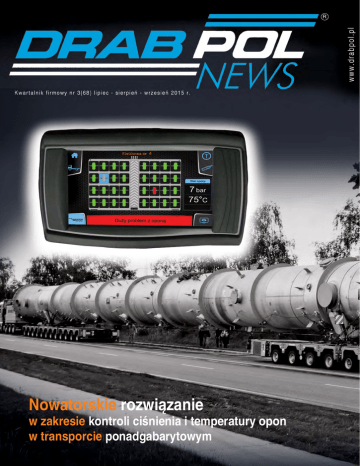 R Nowatorskie rozwiązanie w zakresie kontroli ciśnienia i temperatury opon w transporcie ponadgabarytowym AKTUALNOŚCI Od redakcji SPIS TREŚCI: Aktualności Złoty Krzyż Zasługi Gepard Biznesu - to my! Debata w TVP Info Master Truck W militarnym świecie - MSPO Dział lądowy Targi TRAKO Wakacyjny Tour Owiedzamy serwis CPC Bezpieczna podróż z CT OSKAR Amer Sports - ochrona floty USB podbija rynek DC Safelog - ochrona ładunku Pod marką „Drabpol” Rozwiązania dla kolejnictwa Temat numeru Koniec problemów z ogumieniem Dział lotniczy Z wizytą u Antonowa ADS-B - obowiązkowy jak i kiedy? Dział morski Monitoring wody morskiej Wakacje z VDO Marine! Kącik techniczno-serwisowy Sczytuj dane, łatwo i szybko! Szanowni Państwo! Drodzy Czytelnicy! 2 2 3 3 4 9 9 12 12 14 15 17 18 19 20 26 26 26 35 35 36 40 40 41 42 42 Wydawnictwo firmy DRABPOL Wydawca: Drabpol sp. jawna P. Drabczyński i Wspólnik 42-233 Mykanów, ul. Akacjowa 24/26 tel.0-34 366 00 22, fax 0-34 366 01 02 [email protected], www.drabpol.pl 1 Za nami piękne, upalne lato. Jednak nawet w tegoroczne upały nie spoczywaliśmy na laurach. Na ten okres przypadła bowiem finalizacja naszego wielomiesięcznego, nowatorskiego projektu, roboczo nazwanego „Projekt Panas”. Projekt ten, pierwszy tego typu w całej Europie stworzony został specjalnie dla przewozów ponadgabarytowych, w tym przypadku dla firmy Panas Transport- lidera na polskim rynku w tego typu transporcie. Projekt zakłada szybkie i czytelne dostarczanie kierowcy pełnej informacji, dotyczącej ciśnienia i temperatury opon. Szczegółowe informacje na temat projektu przedstawiamy w naszym temacie numeru. Rozpoczęliśmy ponadto gorący targowy okres - MSPO w Kielcach, TRAKO w Gdańsku – na tych imprezach mocno zaznaczyliśmy swą obecność. Wszystkim naszym Czytelnikom życzymy, jak zawsze miłej lektury. Redakcja DN Warto przeczyt ać! W numerze tym przedstawimy sporo nowości, dotyczących naszych projektów, produktów, a także nowych klientów. Dużo miejsca poświęcamy naszym rozwiązaniom w pojazdach szynowych, które to przedstawiliśmy na tegorocznym TRAKO. Miłośnikom lotnictwa polecamy z kolei obszerny artykuł, dotyczący systemu ADS-B, w który już niedługo powinny być wyposażone wszystkie nowe samoloty sprzedawane i rejestrowane w Europie. Zapraszamy do lektury! Klimatyzatory Konvekta Obowiązkowy ADS-B? str. 10 Rozwiązania dla pojazdów szynowych str. 36 Plusy i minusy systemu ADS-B AKTUALNOŚCI ZŁOTY KRZYŻ ZASŁUGI DLA PREZESA PAWŁA DRABCZYŃSKIEGO Za zasługi w działalności na rzecz przystąpienia Polski do NATO, umacnianie bezpieczeństwa i obronności kraju oraz za rozwijanie stosunków euro-atlantyckich Prezes Paweł Drabczyński odznaczony został Złotym Krzyżem Zasługi. D FOT: R.BARANOWSKI o licznych medali i tytułów przyznanych dotychczas Prezesowi Pawłowi Drabczyńskiemu doszło znamienite odznaczenia państwowe - Złoty Krzyż Zasługi. Doceniona została tu działalność Prezesa jako aktywnego członka organizacji Stowarzyszenia Euro-Atlantyckiego (SEA). T o już drugie odznaczenie państwowe, jakie otrzymał Prezes Paweł Drabczyński. W 2004 r. uhonorowany został Srebrnym Krzyżem Zasługi za działalność na rzecz bezpieczeństwa ruchu drogowego, przyznanym przez ówczesnego Prezydenta Aleksandra Kwaśniewskiego. Z uwagi na długi okres wakacyjny nie wszystkie te odznaczenia zostały wręczone laureatom w jednakowym czasie. Złoty Krzyż Zasługi Prezes Paweł Drabczyński odebrał w dniu 9 października podczas specjalnej uroczystości, jaka miała miejsce w siedzibie Mazowieckiego Urzędu Wojewódzkiego w Warszawie. Odznaczenia państwowe wręczał wszystkim laureatom wojewoda mazowiecki Jacek Kozłowski. AKTUALNOŚCI • WYDARZENIA W DOWÓD UZNANIA Razem z Prezesem Pawłem Drabczyńskim odznaczenia odebrali inni członkowie SEA – Krystian Artur Piątkowski oraz Krzysztof Jacek Trofiniak. SEA reprezentował m.in. Przewodniczący Rady Wykonawczej, Minister Janusz Onyszkiewicz. K rzyż Zasługi został ustanowiony w 1923 r. Nadawany jest osobom, które zasłużyły się dla państwa lub obywateli czynami, przekraczającymi zakres ich zwykłych obowiązków, które przynoszą znaczną korzyść państwu lub obywatelom. Przyznaje się go za ofiarną działalność publiczną, ofiarne niesienie pomocy, a także za działalność charytatywną. GEPARD BIZNESU DRABPOL WŚRÓD NAJDYNAMICZNIEJSZYCH FIRM W POLSCE Miło nam poinformować wszystkich Czytelników, że firma nasza otrzymała tytuł Geparda Biznesu 2014, przyznanego podczas IX edycji Ogólnopolskiego Konkursu Gepardy Biznesu 2014. R anking Gepardów Biznesu ogłosili Instytut Nowoczesnego Biznesu i Magazyn Przedsiębiorców „Europejska Firma”, zaś informacje do analiz dostarczyła im Wywiadownia Handlowa InfoCredit, która zbiera dane z Krajowego Rejestru Sądowego, a więc wiarygodne informacje finansowe. W tym roku do analizy wywiadownia wybrała przedsiębiorstwa, które w latach 2011 2013 miały każdego roku przynajmniej pół miliona zł przychodów, minimum da Biznesu 2014. Wśród nich znalazła 10 tys. zł zysku netto, a wartość ich się też nasza firma. Podkreślić chcemy, kapitału własnego była dodatnia. We że Gepardem Biznesu zostaliśmy po raz wrześniu br. wspomniana wywiadownia kolejny. znalazła 6453 przedsiębiorstwa branży handloanking Gepardy Biznesu 2014 według wzrostu wej, które rozwijały się wartości rynkowej branży handlowej opublikona tyle dynamicznie, że wany został 30 września br w Internecie pod adresem: spełniły wymagane kry- http://businessnow.pl/6881,gepardy-biznesu-2014teria i tym samym za- -branzy-handlowej.html. służyły na tytuł Gepar- R 2 AKTUALNOŚCI • WYDARZENIA WYDARZENIA „POLACY A ALKOHOL” DEBATA W TVP INFO Dnia 2 lipca na specjalnie zaproszenie wydawcy, Prezes Paweł Drabczyński wystąpił w programie Biznes Info, emitowanym o 19:30 w TVP Info. P rezes w swoim wystąpieniu uwz