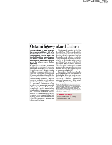 GAZETA WYBORCZA - RADOM 2012-03-02 Ostatni ligowy akord Jadaru •• SIATKÓWKA •• Jutro pierwszo ligowe zawodniczki Jadaru AZS-u Po litechniki Radom po raz ostatni w se zonie zagrają w meczu o punkty. Radomianki podejmą uczelniany zes pół AZS-u Kraków, który w przeci wieństwie do Jadaru zapewnił sobie grę w play-off o awans do siatkar skiej elity. W rundzie rewanżowej sezonu za sadniczego podopieczne trenera Jac ka Skroka usilnie walczyły o wejście do najlepszej czwórki zaplecza eks traklasy. Jednak porażki w dwóch ostatnich meczach z Piecobiogazem Murowana Goślina i Silesia Mysło wice ostatecznie zastopowały marsz radomianek do play-off. Z pozoru może się wydawać, że sobotnia po tyczka z drużyną spod Wawelu jest o... pietruszkę. Gospodyniom nie grozi bowiem awans, a także spadek o klasę niżej. Pozoryje dnak mylą, bo rywalizacja z popularnymi ekonomistkamijest dla radomianek waż na, i to z wielu powodów. Przede wszystkim siatkarki trenera Skroka powalczą w obronie piątej lokaty, któ rą mogąjeszcze stracić na rzecz dep czących im po piętach w klasyfika cji mysłowiczankom. Wpierwszej rundzie w stolicy Ma łopolski Jadar AZS nie ugrał punktów, przegrywając gładko 0:3. Zatem i ar gument o skutecznym rewanżu nakrakowiankach też wchodzi w rachubę. Jeśli gospodyniom uda się zwyciężyć, choćby po tie-breaku, wówczas roz grywki zakończą tuż za czołówką i z bi lansem 13 wygranych i 9 porażek. W pożegnalnym meczu chcemy się pokazać z jak najlepszej strony. Jest szansa, że do spotkania przystąpimy w kompletnym składzie. Szczęśliwie okazało się, że Sandra Cabańska była mocno przeziębiona. Po badaniach wykluczono zapalenie płuc. Generalnie zwycięstwem chcemypożegnać się z kibicami, a tym samym utrzymać piąte miejsce wlidze - mówił Jacek Skrok, trener Jadaru. O RO Zestaw par 2 2 . kolejki: Jadar AZS Politechnika Radom -Armatura EliteskiAZS UE Kraków, hala Politechniki przy ul. Chrobrego, sobota godz. 17. Inne mecze: PLKS Pszczyna - Gaudia Trzebnica, Chemik Police - AZS KSZO Ostrowiec Świętokrzyski, Sparta Warszawa - Si lesia Volley Mysłowice/Chorzów, Legionovia Legionowo - Piecobiogaz Murowana Goślina, Jedynka Aleksan drów Łódzki - SMS Sosnowiec. I radom.gazeta.pl Więcej wiadomości na naszej stronie internetowej