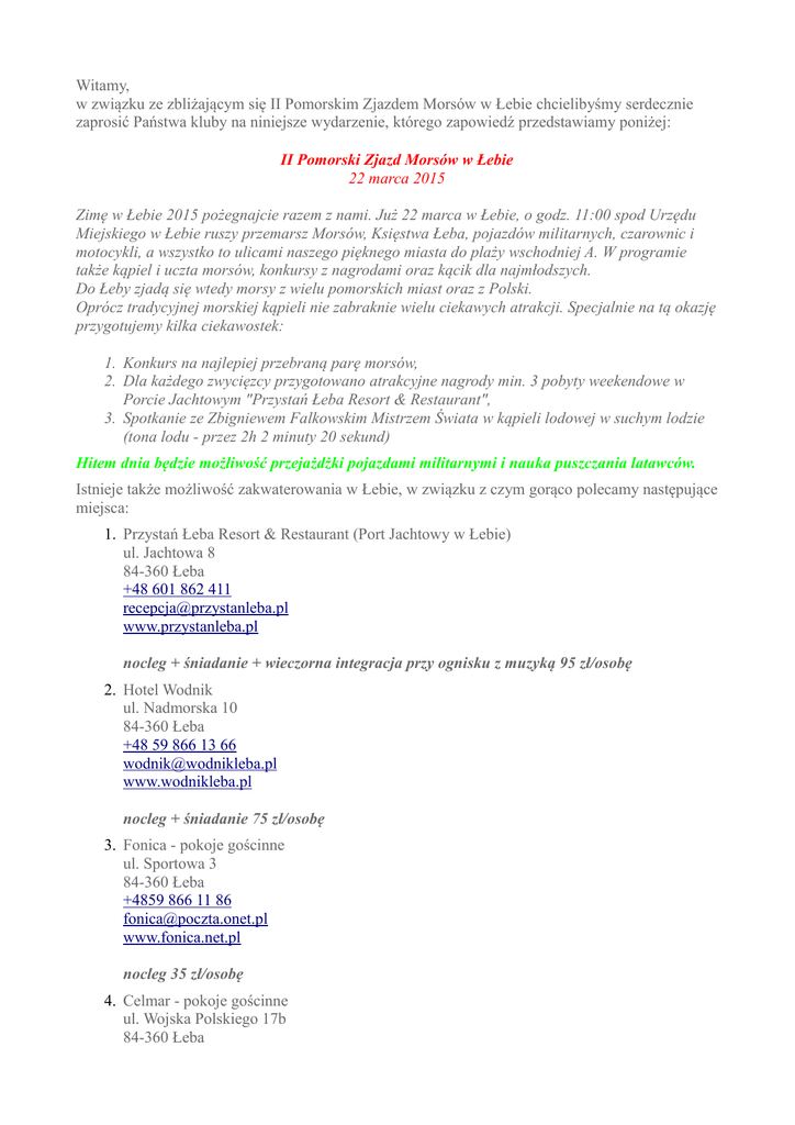 Witamy, w związku ze zbliżającym się II Pomorskim Zjazdem Morsów w Łebie chcielibyśmy serdecznie zaprosić Państwa kluby na niniejsze wydarzenie, którego zapowiedź przedstawiamy poniżej: II Pomorski Zjazd Morsów w Łebie 22 marca 2015 Zimę w Łebie 2015 pożegnajcie razem z nami. Już 22 marca w Łebie, o godz. 11:00 spod Urzędu Miejskiego w Łebie ruszy przemarsz Morsów, Księstwa Łeba, pojazdów militarnych, czarownic i motocykli, a wszystko to ulicami naszego pięknego miasta do plaży wschodniej A. W programie także kąpiel i uczta morsów, konkursy z nagrodami oraz kącik dla najmłodszych. Do Łeby zjadą się wtedy morsy z wielu pomorskich miast oraz z Polski. Oprócz tradycyjnej morskiej kąpieli nie zabraknie wielu ciekawych atrakcji. Specjalnie na tą okazję przygotujemy kilka ciekawostek: 1. Konkurs na najlepiej przebraną parę morsów, 2. Dla każdego zwycięzcy przygotowano atrakcyjne nagrody min. 3 pobyty weekendowe w Porcie Jachtowym "Przystań Łeba Resort & Restaurant", 3. Spotkanie ze Zbigniewem Falkowskim Mistrzem Świata w kąpieli lodowej w suchym lodzie (tona lodu - przez 2h 2 minuty 20 sekund) Hitem dnia będzie możliwość przejażdżki pojazdami militarnymi i nauka puszczania latawców. Istnieje także możliwość zakwaterowania w Łebie, w związku z czym gorąco polecamy następujące miejsca: 1. Przystań Łeba Resort & Restaurant (Port Jachtowy w Łebie) ul. Jachtowa 8 84-360 Łeba +48 601 862 411 [email protected] www.przystanleba.pl nocleg + śniadanie + wieczorna integracja przy ognisku z muzyką 95 zł/osobę 2. Hotel Wodnik ul. Nadmorska 10 84-360 Łeba +48 59 866 13 66 [email protected] www.wodnikleba.pl nocleg + śniadanie 75 zł/osobę 3. Fonica - pokoje gościnne ul. Sportowa 3 84-360 Łeba +4859 866 11 86 [email protected] www.fonica.net.pl nocleg 35 zł/osobę 4. Celmar - pokoje gościnne ul. Wojska Polskiego 17b 84-360 Łeba +48 605 044 043 +48 59 8661 361 [email protected] www.celmarr.net nocleg 35 zł/osobę 5. Boja - pokoje gościnne ul. Paderewskiego 13 84-360 Łeba +48 59 866 25 32 +48 663 537 327 [email protected] www.boja.tp2.pl nocleg 35 zł/osobę 6. Chata Jana - pokoje gościnne ul. Paderewskiego 12 84-360 Łeba +48 59-866-11-74 +48 694 572 228 [email protected] www.chatajana.za.pl nocleg 35 zł/osobę Wszystkich, którzy planują przyjechać do Łeby dzień wcześniej czyli w sobotę 21 marca zapraszamy na wieczorną integrację przy ognisku z muzyką do Portu Jachtowego w Łebie przy ul. Jachtowej 8. Kontakt i zapisy: +48 698 960 920 +48 519 400 707 Partnerzy wydarzenia: - Port Jachtowy w Łebie - Księstwo Łeba - Browar Łebski - Hotel Łeba - Hotel Wodnik - Hotel Neptun - Dom Wczasowy Maxim - Restauracja PASJA - Delikatesy Kochanowscy - Piekarnia Głodowski - Ternäben Räucherfisch - Formel Poniżej znajduje się fotorelacja z pierwszej edycji wydarzenia: I Pomorski Zjazd Morsów w Łebie organizator: Łeba Mors Poland – Morsy Łebskie, Burmistrz Miasta Łeby. miejsce: Przemarsz ul. Kościuszki oraz Plaża wschodnia A -Pozdrawiamy :-) Morsy Łebskie - Łeba Mors Poland kontakt: Piotr Głuszko - Wiceprezes Morsów Łebskich +48 660 593 877 [email protected] www.facebook.com/MorsyLeba