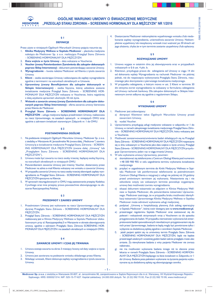 4. §1 DEFINICJE Przez użyte w niniejszych Ogólnych Warunkach Umowy pojęcia rozumie się: 1. Klinika Medycyny Wellness w Szpitalu Medicover – placówka medyczna należąca do Medicover Sp. z o.o. realizująca Przegląd Stanu Zdrowia – SCREENING HORMONALNY DLA MĘŻCZYZN 2. Data wejścia w życie Umowy – data wskazana w Voucherze. 3. Voucher (zwany Potwierdzeniem Zamówienia dla zakupów dokonanych poprzez Sklep Internetowy) - dokument potwierdzający zawarcie Umowy. 4. Wynagrodzenie – kwota należna Medicover od Klienta z tytułu zawarcia Umowy. 5. Klient – osoba zawierająca Umowę i zobowiązana do zapłaty wynagrodzenia zgodnie z terminami i na warunkach określonych w Umowie. 6. Uprawniony (zwany Beneficjentem dla zakupów dokonanych w Sklepie Internetowym) - osoba fizyczna, której udzielone zostanie świadczenie medyczne Przegląd Stanu Zdrowia – SCREENING HORMONALNY DLA MĘŻCZYZN wskazana w Voucherze, która najpóźniej z datą uzyskania uprawnień ukończyła 18 rok życia. 7. Wniosek o zawarcie umowy (zwany Zamówieniem dla zakupów dokonanych poprzez Sklep Internetowy) - oferta zawarcia umowy kierowana przez Klienta do Medicover. 8. Przegląd Stanu Zdrowia – SCREENING HORMONALNY DLA MĘŻCZYZN – usługa medyczna będąca przedmiotem Umowy, realizowana na rzecz Uprawnionego, na zasadach opisanych w niniejszych OWU oraz zgodnie z zakresem świadczeń stanowiącym Załącznik nr. 1 do OWU. §5 ROZWIĄZANIE UMOWY 1. 2. 3. WYKONANIE UMOWY 1. 2. POSTANOWIENIA OGÓLNE 2. 3. 4. 5. Na podstawie niniejszych Ogólnych Warunków Umowy, Medicover Sp. z o.o. z siedzibą w Warszawie Al. Jerozolimskie 96 (zwana dalej „Medicover”) zawiera Umowy/ę o świadczenie medyczne Przegląd Stanu Zdrowia – SCREENING HORMONALNY DLA MĘŻCZYZN (zwane dalej „Umową” lub „Przeglądem Stanu Zdrowia – SCREENING HORMONALNY DLA MĘŻCZYZN”). Umowa może być zawarta na rzecz osoby trzeciej, będącej osobą fizyczną, na warunkach określonych w niniejszych OWU. Potwierdzeniem zawarcia Umowy jest imienny Voucher, dostarczony przez Medicover na adres e-mail Klienta wskazany we wniosku o zawarcie Umowy. W przypadku zawarcia Umowy na rzecz osoby trzeciej obowiązek zapłaty wynagrodzenia za Przegląd Stanu Zdrowia - SCREENING HORMONALNY DLA MĘŻCZYZN spoczywa na Kliencie. W sprawach nieuregulowanych w OWU mają zastosowanie przepisy Kodeksu Cywilnego oraz inne przepisy prawa powszechnie obowiązującego na obszarze Rzeczpospolitej Polskiej. 3. 4. §3 PRZEDMIOT I ZAKRES UMOWY 1. 2. Przedmiotem Umowy jest wykonanie na rzecz Uprawnionego usługi medycznej Przeglądu Stanu Zdrowia – SCREENING HORMONALNY DLA MĘŻCZYZN. Przegląd Stanu Zdrowia – SCREENING HORMONALNY DLA MĘŻCZYZN realizowany jest w Klinice Medycyny Wellness w Szpitalu Medicover zlokalizowanym przy al. Rzeczypospolitej 5 w Warszawie w okresie obowiązywania umowy, zgodnie z zakresem Przeglądu Stanu Zdrowia SCREENING HORMONALNY DLA MĘŻCZYZN i na zasadach określonych w niniejszych OWU. §4 ZAWARCIE UMOWY I CZAS JEJ TRWANIA 1. 2. 3. Umowa wygasa w ostatnim dniu jej obowiązywania oraz w przypadkach wskazanych w § 6 ust. 4 pkt. b. Klientowi, przysługuje prawo do odstąpienia od Umowy w ciągu 14 dni od dokonania wpłaty Wynagrodzenia na rachunek Medicover nie później jednak, niż do rozpoczęcia wykonywania Przeglądu Stanu Zdrowia, rozumianego jako skorzystanie z pierwszego świadczenia medycznego. W przypadku odstąpienia, o którym mowa w ust. 2 Klient w terminie 30 dni otrzyma zwrot wynagrodzenia na wskazany w formularzu odstąpienia od Umowy rachunek bankowy. Dla zakupów dokonanych w Sklepie Internetowym zwrot odbywa się zgodnie z regulaminem Sklepu. §6 §2 1. Dostarczenie Medicover niekompletnie wypełnionego wniosku i/lub niedokonanie zapłaty wynagrodzenia, uniemożliwia zawarcie Umowy. Niekompletnie wypełniony lub nieopłacony wniosek traci ważność po 30 dniach od jego złożenia, chyba że w tym terminie zostanie uzupełniony i/lub opłacony. 0260.175.W.20161106 OGÓLNE WARUNKI UMOWY O ŚWIADCZENIE MEDYCZNE „PRZEGLĄD STANU ZDROWIA – SCREENING HORMONALNY DLA MĘŻCZYZN” NR 1/2016 Umowa zostaje zawarta na okres 3 miesięcy liczony od daty wejścia w życie Umowy. Umowa jest zawierana na podstawie wniosku składanego przez Klienta. Składając wniosek, Klient dokonuje zapłaty wynagrodzenia z tytułu zawarcia Umowy. Medicover jest zobowiązany: a) doręczyć Klientowi tekst Ogólnych Warunków Umowy przed zawarciem Umowy, b) wydać Voucher. Uprawnionemu przysługują usługi medyczne wskazane w załączniku nr 1 do Umowy, w ramach zakupionego świadczenia medycznego Przegląd Stanu Zdrowia – SCREENING HORMONALNY DLA MĘŻCZYZN, który wskazany jest w Voucherze. Możliwość zarezerwowania/umówienia badań składających się na Przegląd Stanu Zdrowia – SCREENING HORMONALNY DLA MĘŻCZYZN rozpoczyna się w dniu wskazanym w Voucherze jako data wejścia w życie umowy. Przegląd Stanu Zdrowia – SCREENING HORMONALNY DLA MĘŻCZYZN przysługuje Uprawnionemu jeden raz w ciągu trwania Umowy. W celu wykonania umowy Uprawniony, powinien: a) skontaktować się telefonicznie z Centrum Obsługi Klienta pod numerem +48 500 900 905 w celu uzgodnienia terminu wykonania świadczenia medycznego b) przybyć w uzgodnionym terminie do Kiniki Medycyny Wellness w Szpitalu Medicover lub poinformować telefonicznie za pośrednictwem Centrum Obsługi Klienta o rezygnacji z usługi nie później niż 24 godziny przed umówionym terminem jej wykonania. Niestawienie się i nie odwołanie wizyty we wskazanym terminie powoduje wygaśnięcie, umowy bez możliwości zwrotu wynagrodzenia. c) okazać dokument tożsamości ze zdjęciem w Klinice Medycyny Wellness w Szpitalu Medicover, dla potwierdzenia tożsamości Uprawnionego. Medicover zastrzega, że w przypadku braku możliwości identyfikacji tożsamości Uprawnionego Klinika Medycyny Wellness w Szpitlau Medicover może odmówić wykonania usługi medycznej,